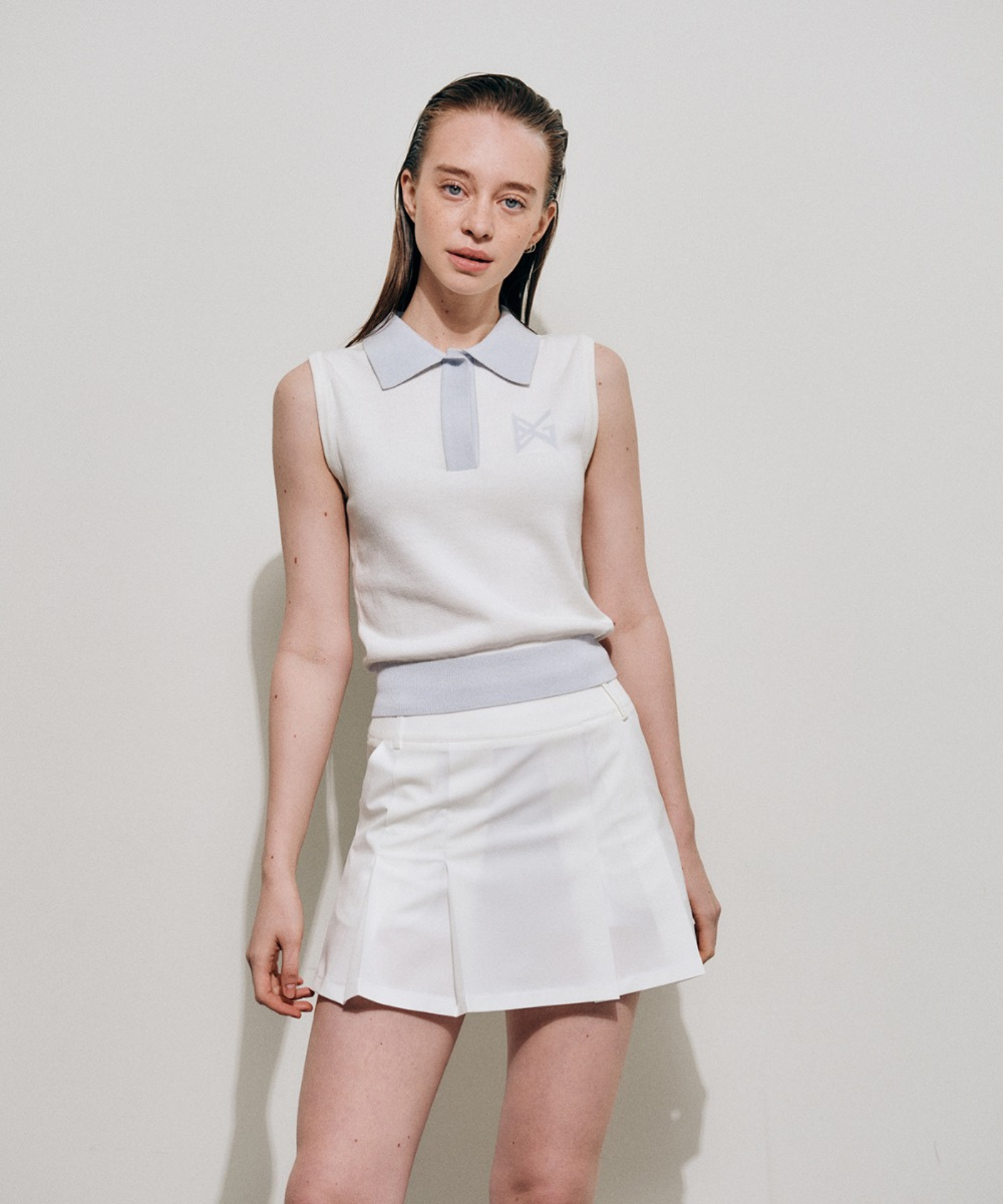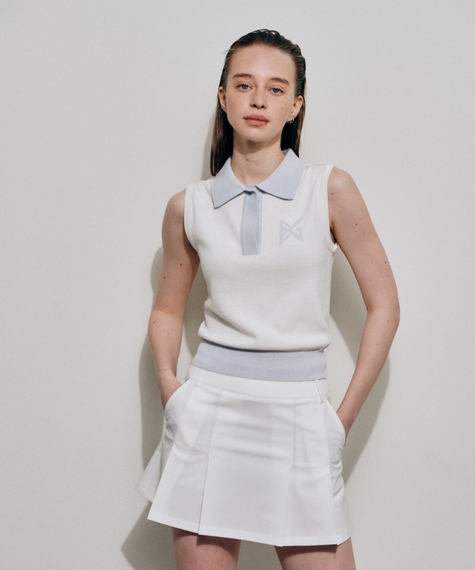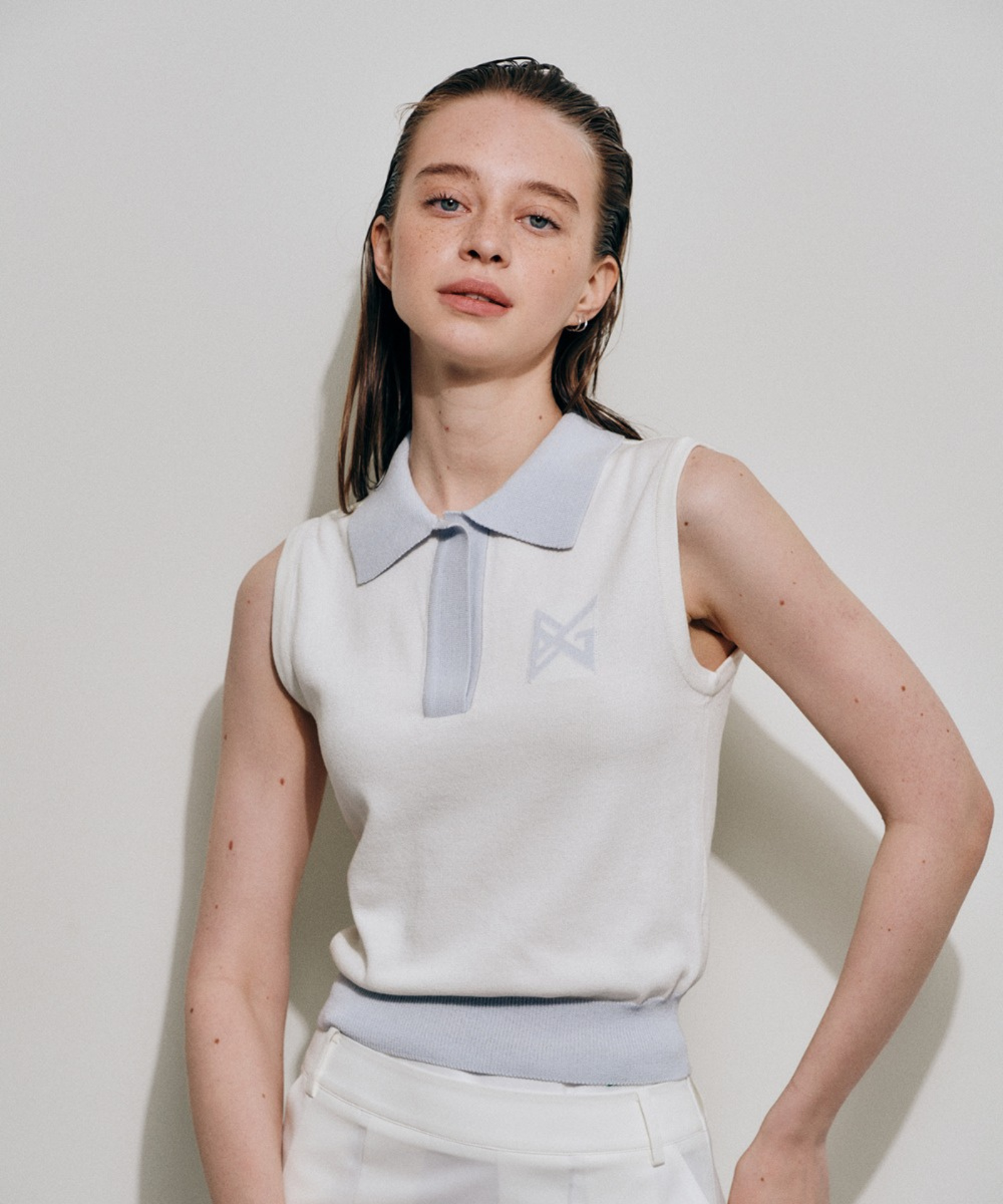Crafted from premium cotton-blend yarns, this white knit vest delivers refined elegance with understated sophistication. The fabric's natural breathability and soft hand feel make it an ideal layering piece or standalone statement, while its structural integrity ensures lasting wear. An open collar with discreet snap closures offers versatile styling options, seamlessly transitioning from casual to polished looks. Subtle logo jacquard detailing adds understated visual interest without compromising the piece's timeless appeal.