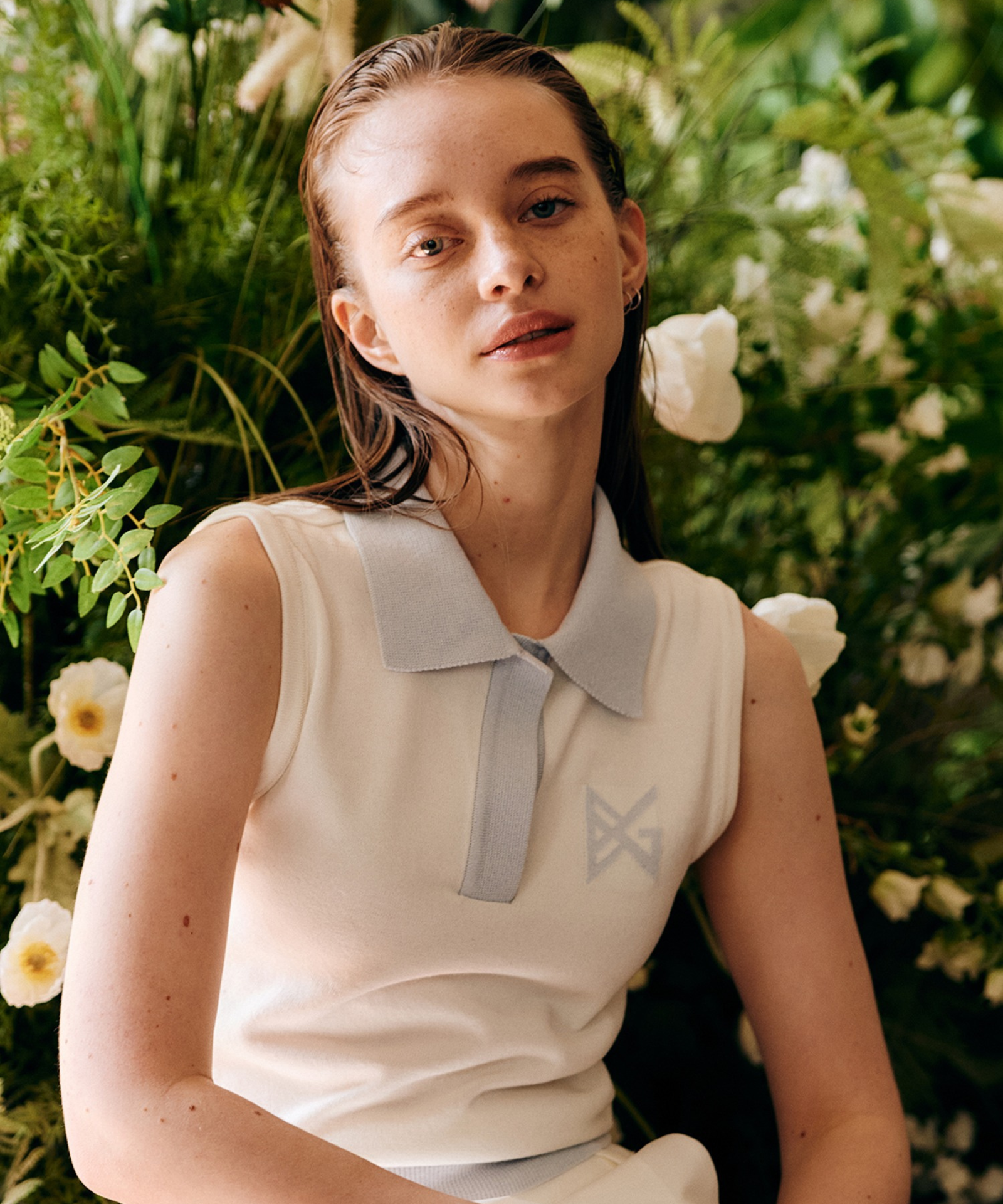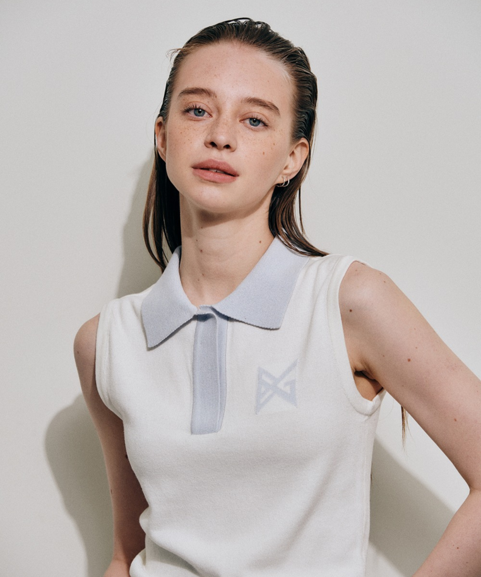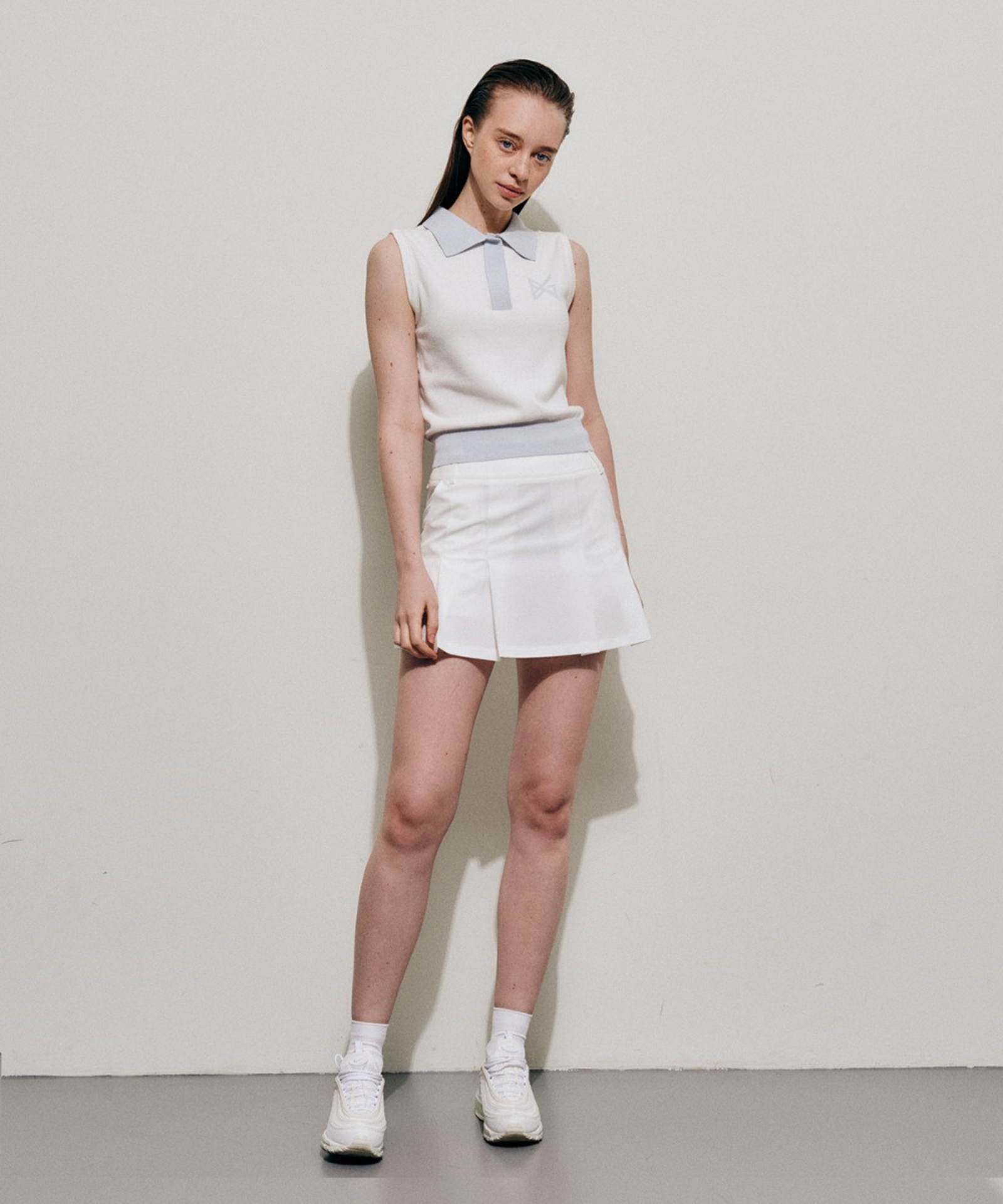 Crafted from premium cotton-blend yarns, this white knit vest delivers refined elegance with understated sophistication. The fabric's natural breathability and soft hand feel make it an ideal layering piece or standalone statement, while its structural integrity ensures lasting wear. An open collar with discreet snap closures offers versatile styling options, seamlessly transitioning from casual to polished looks. Subtle logo jacquard detailing adds understated visual interest without compromising the piece's timeless appeal.