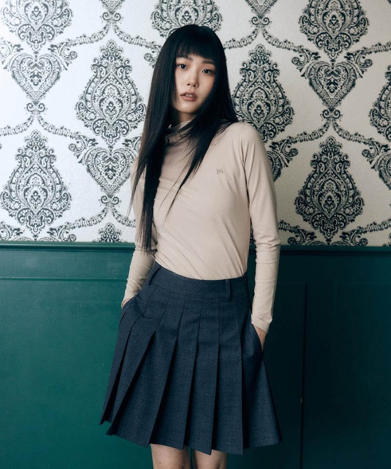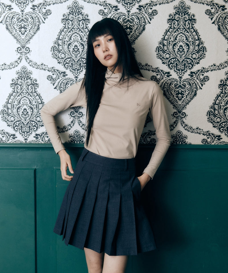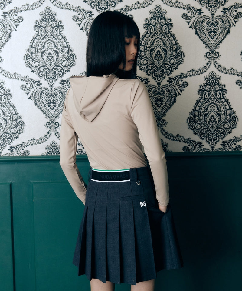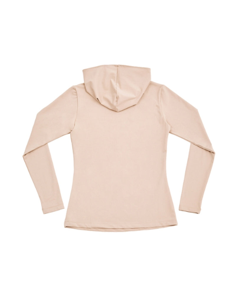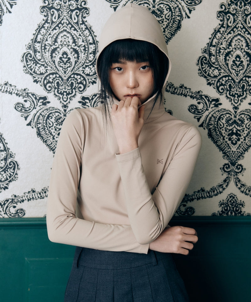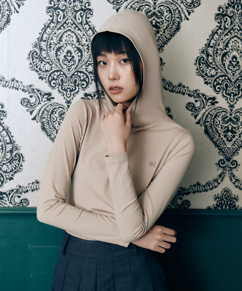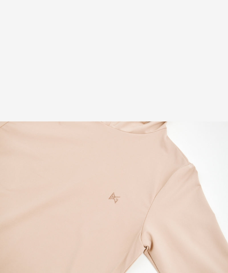 Beige hooded t-shirt with refined proportions designed for active movement. The hood functions as seamless coverage or versatile turtleneck styling. Breathable stretch fabric with a luxurious napped finish provides warmth and comfort, while strategic shaping tapes maintain a polished silhouette through regular wear. Perfect for transitional seasons.