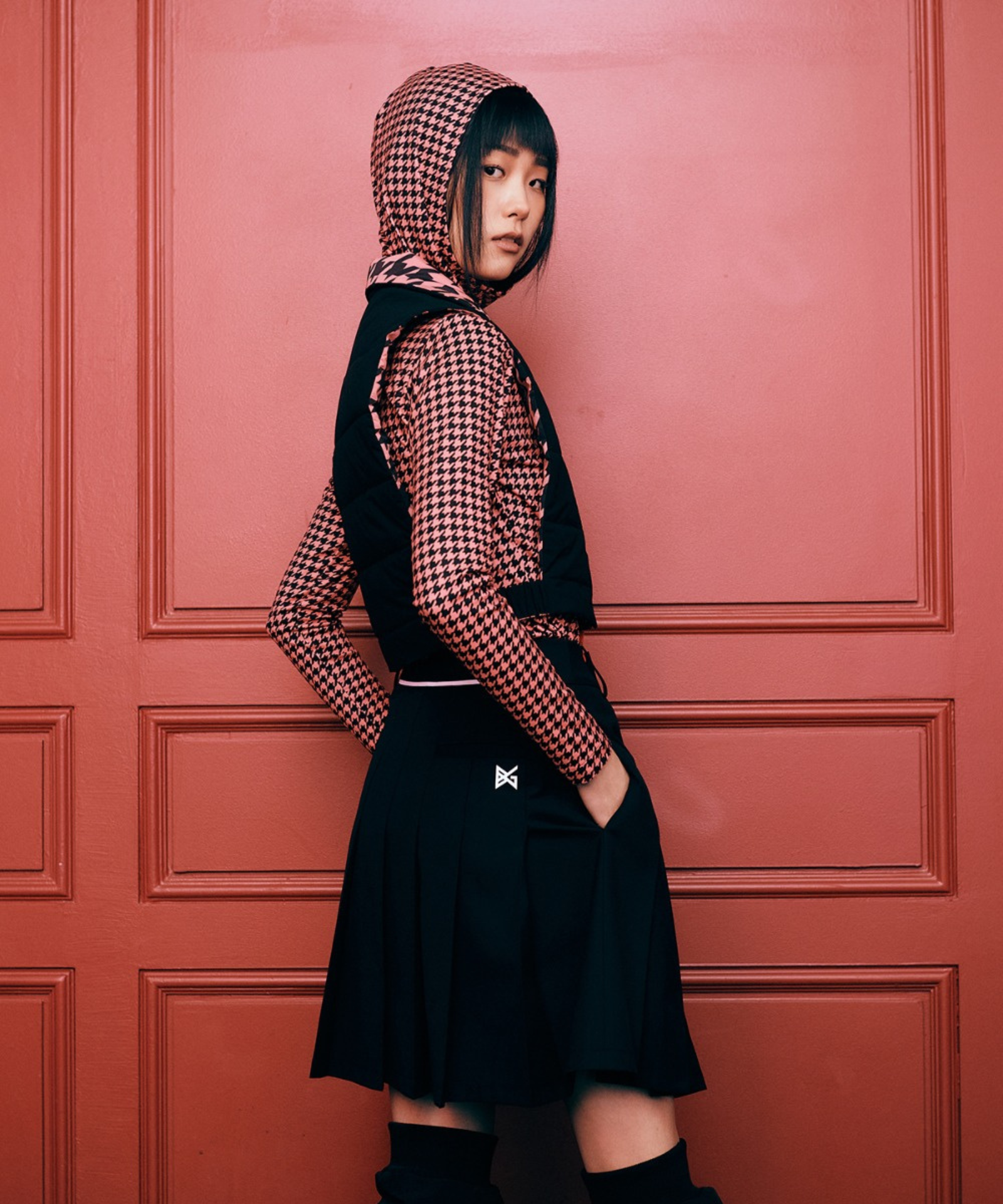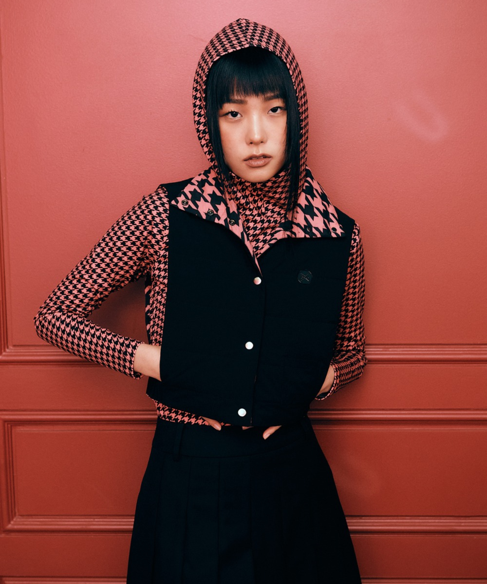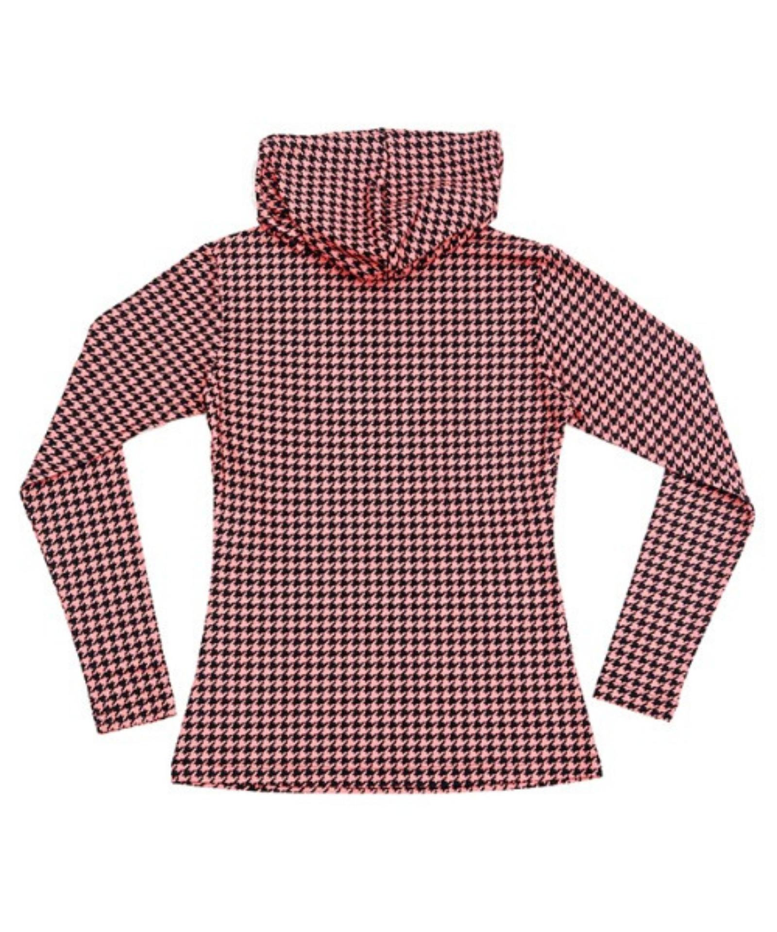 Patterned hooded t-shirt engineered for active wear with proportions tailored to women's frames. The hood functions as dynamic coverage or layered turtleneck styling. Breathable stretch fabric with napped finish provides warmth, while reinforcement taping maintains structure through frequent wear. Subtle logo embroidery adds refined detail. Ideal for transitional seasons.