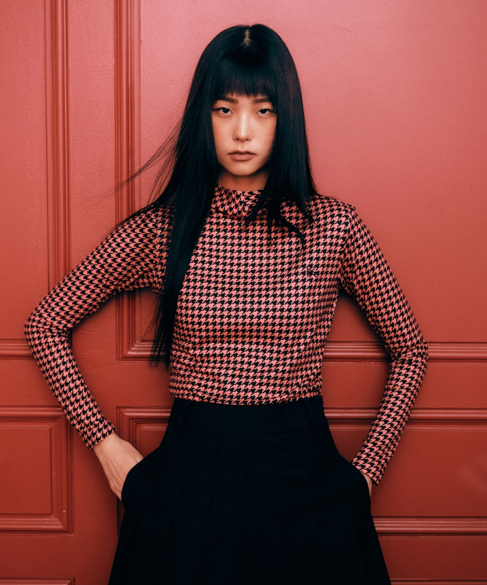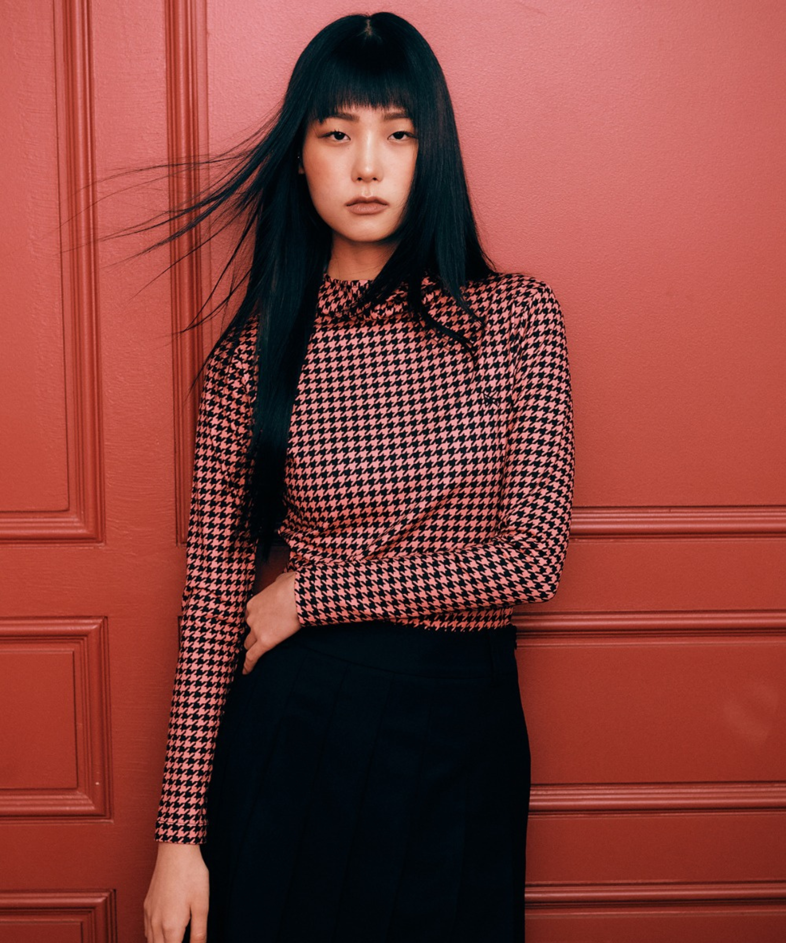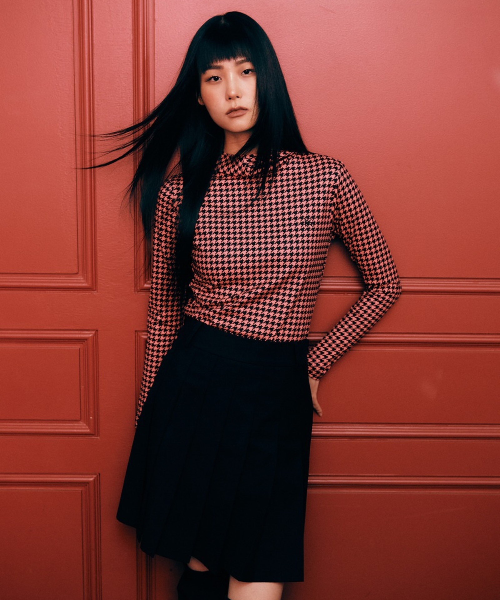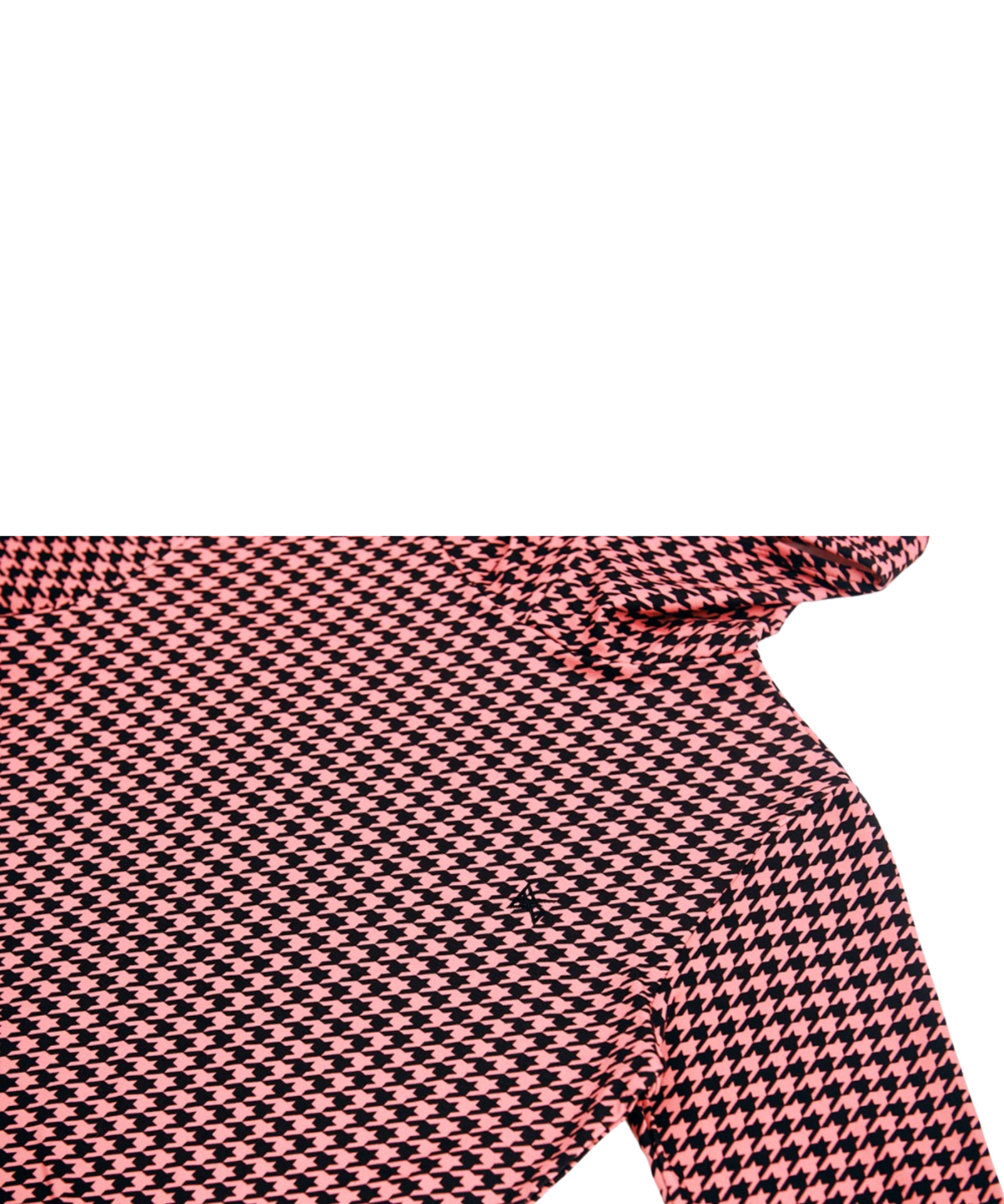 Patterned hooded t-shirt engineered for active wear with proportions tailored to women's frames. The hood functions as dynamic coverage or layered turtleneck styling. Breathable stretch fabric with napped finish provides warmth, while reinforcement taping maintains structure through frequent wear. Subtle logo embroidery adds refined detail. Ideal for transitional seasons.