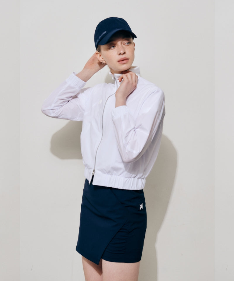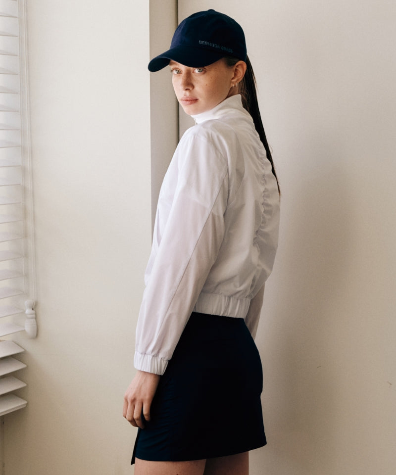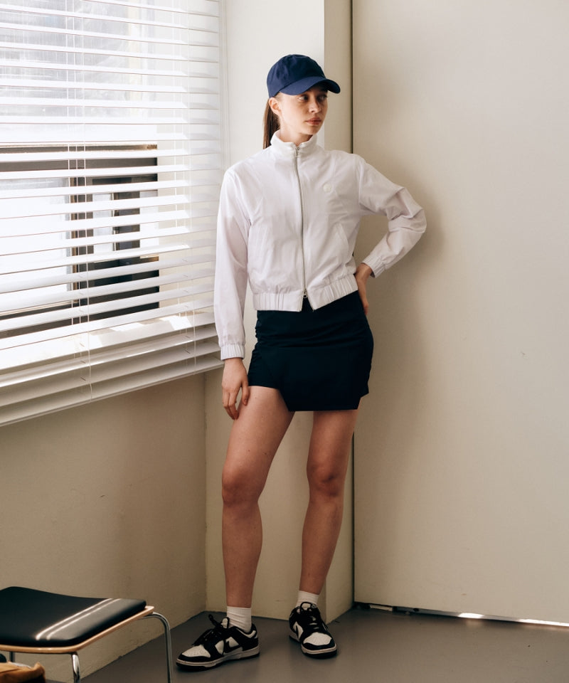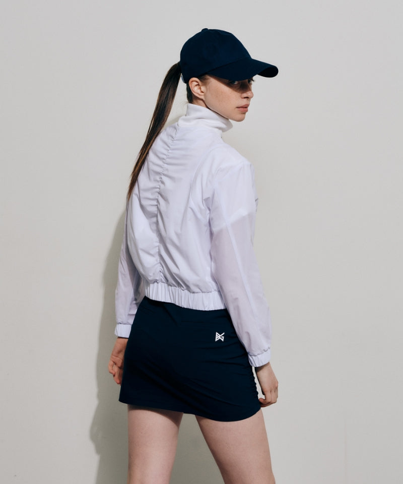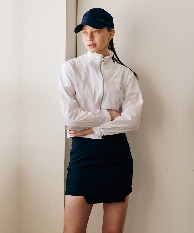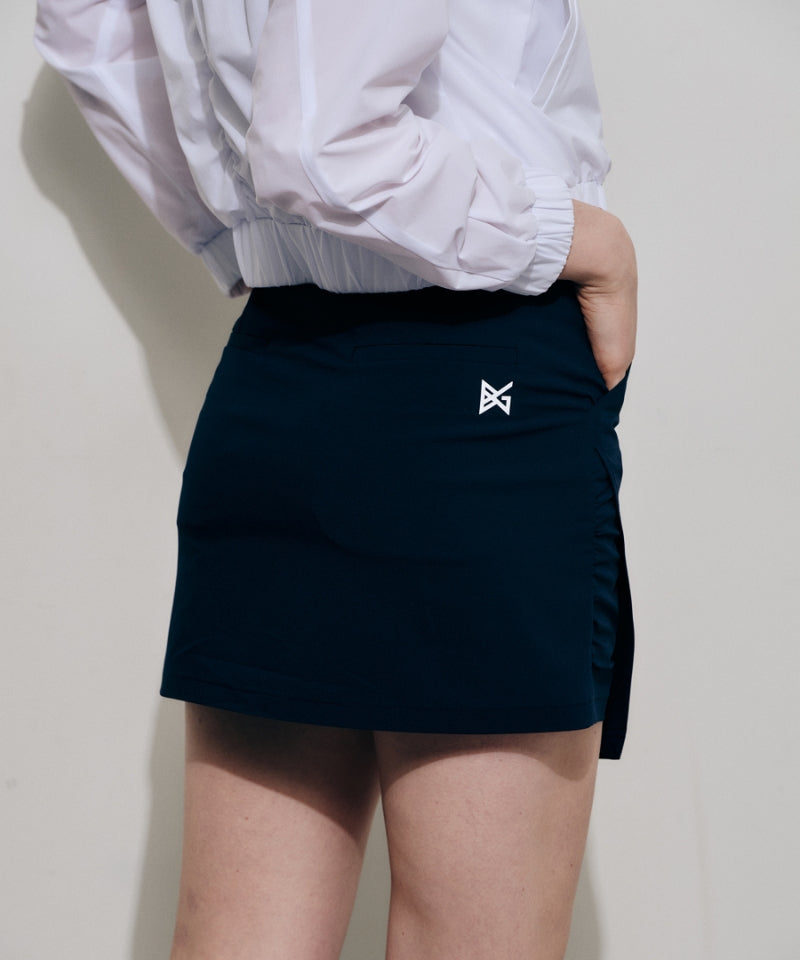 Navy H-line culottes with asymmetrical hemline and side shirring for a refined silhouette. Made from lightweight, breathable fabric with Coolmax lining that wicks moisture. Features a functional back pocket and side zip closure. Effortless style and comfort for everyday wear.