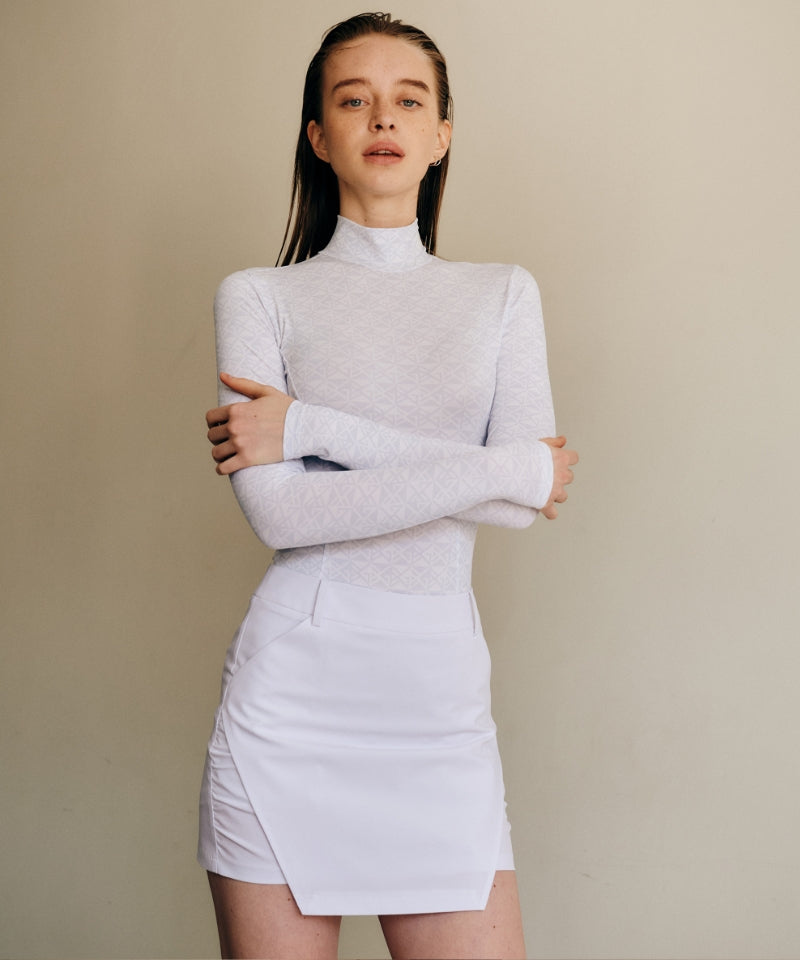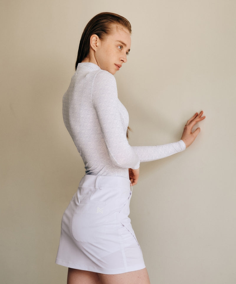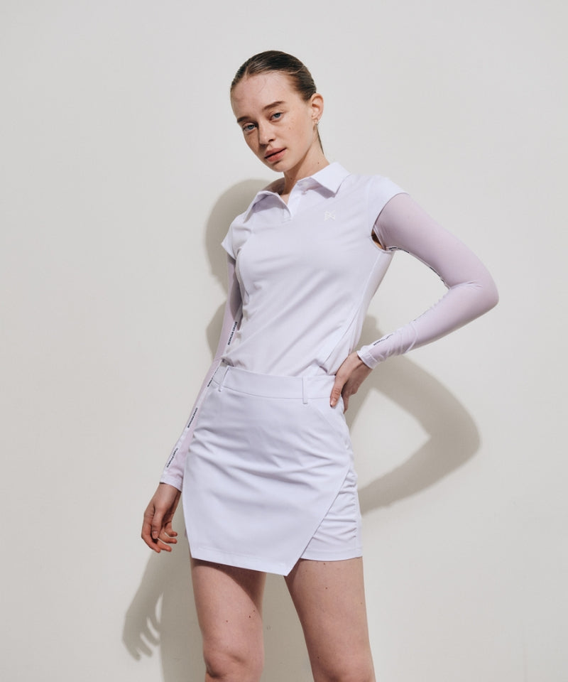 White H-line culottes featuring an asymmetrical hemline and side shirring for architectural elegance. Lightweight, breathable fabric with natural stretch moves with you, while Coolmax lining wicks moisture. Includes functional back pocket and side zip. Refined comfort for discerning style.