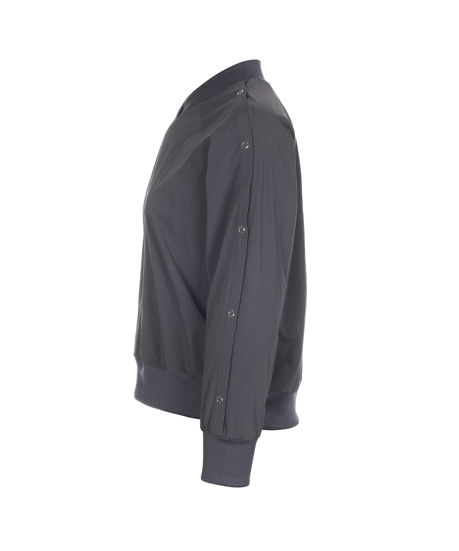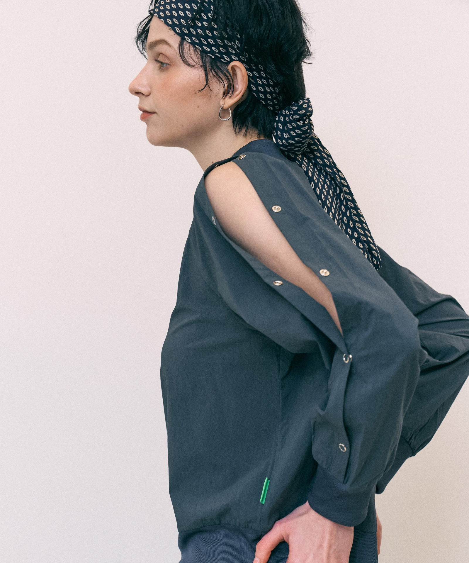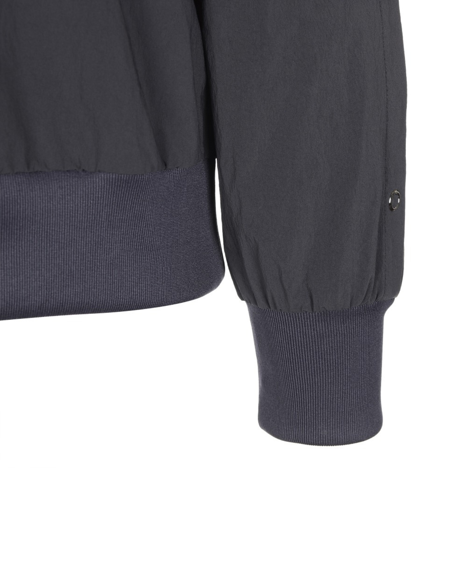 Lightweight, functional windbreaker material with water-repellent treatment. Openable snap button detail. Functional Shibori finish. Logo label with color point. Lightweight, stretchy windbreaker material. Water-repellent treatment for a water-resistant effect. Shoulder team detail adds ventilation effect. Real snap button that can be opened and displayed. Logo label with color point.