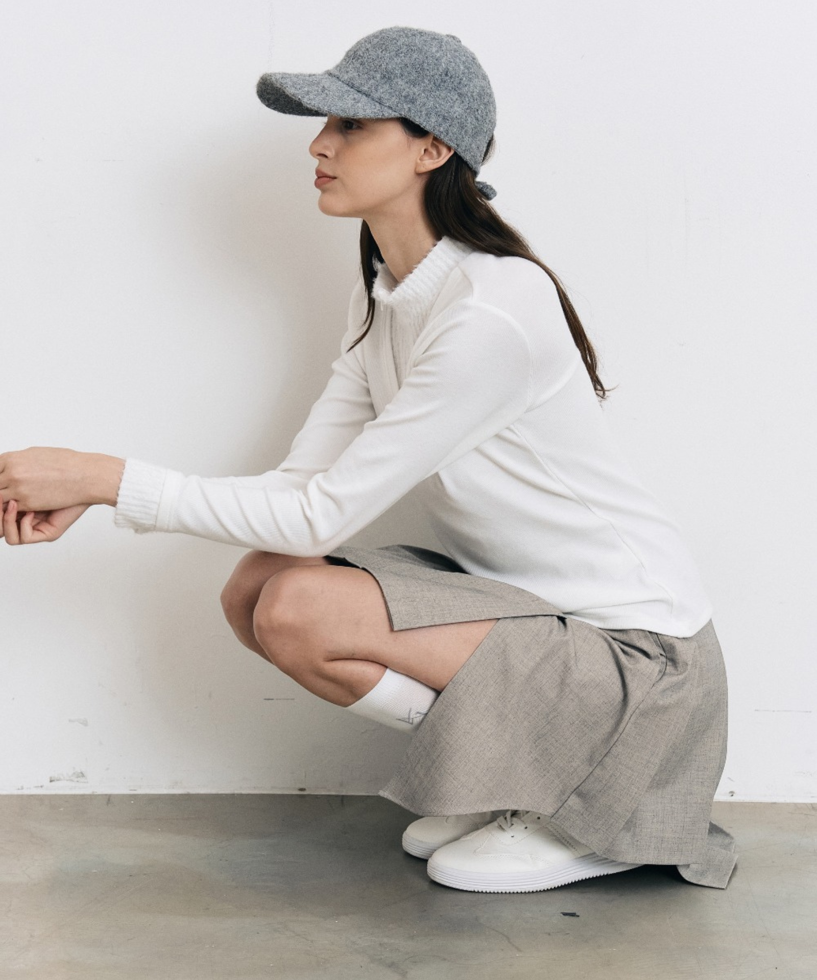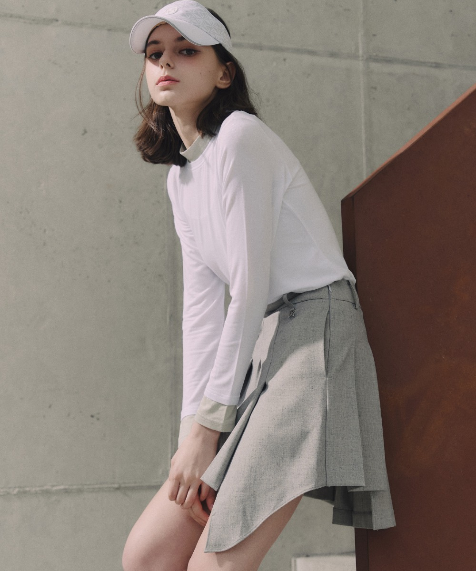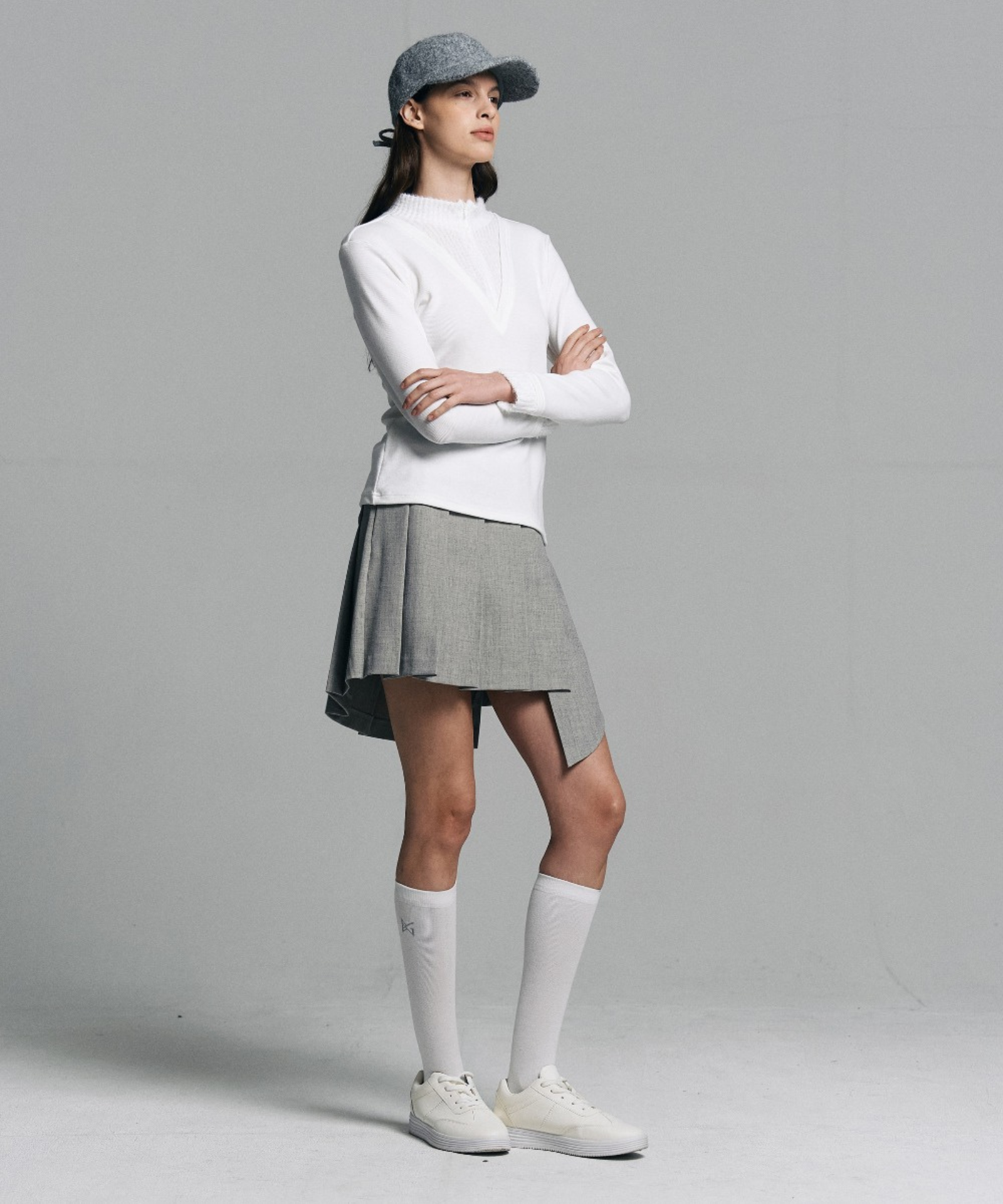 Wool blend pleated skirt with an asymmetrical hemline for flattering movement. Moisture-wicking underwear keeps you comfortable all day. Features functional side pockets, side zipper closure, metal logo accent, and belt loops for versatile styling.