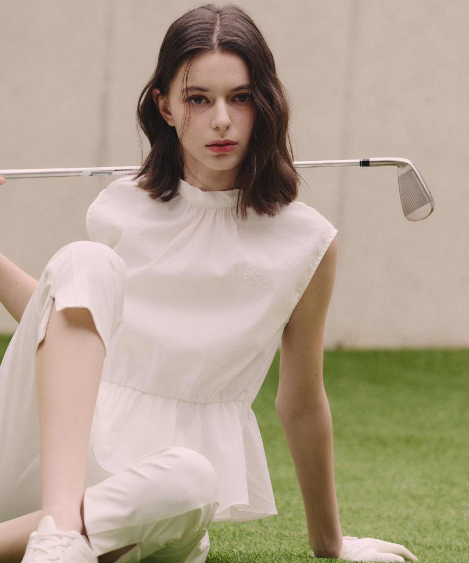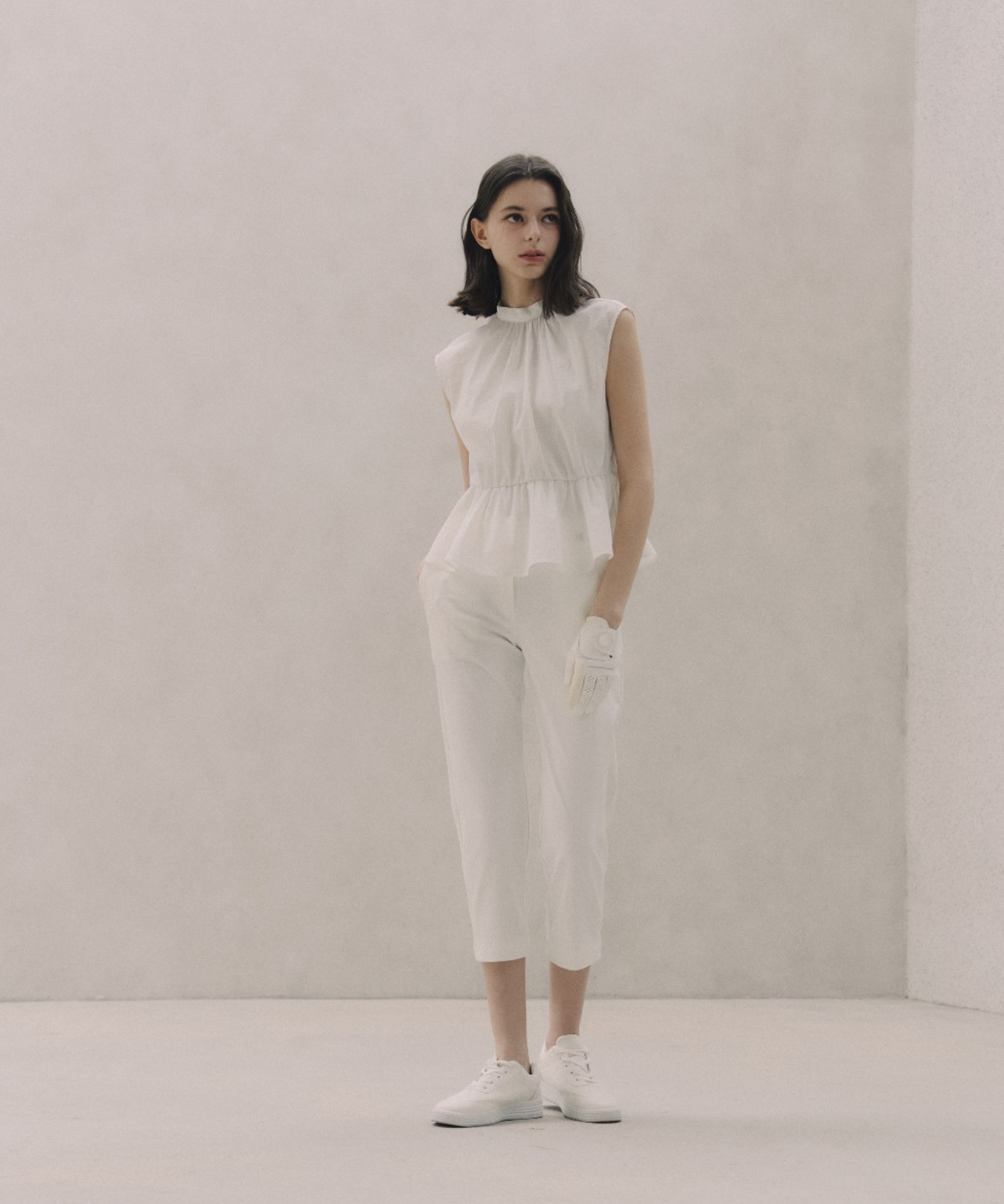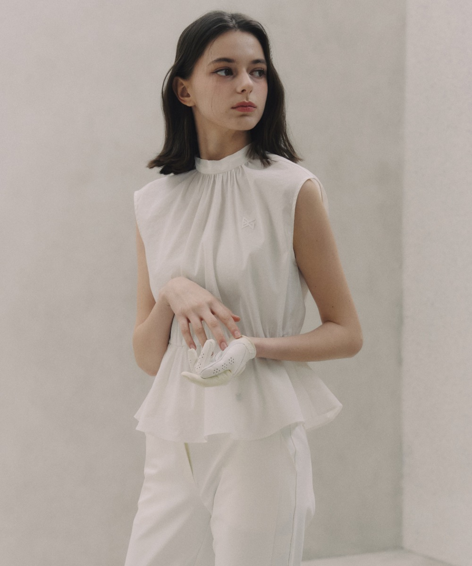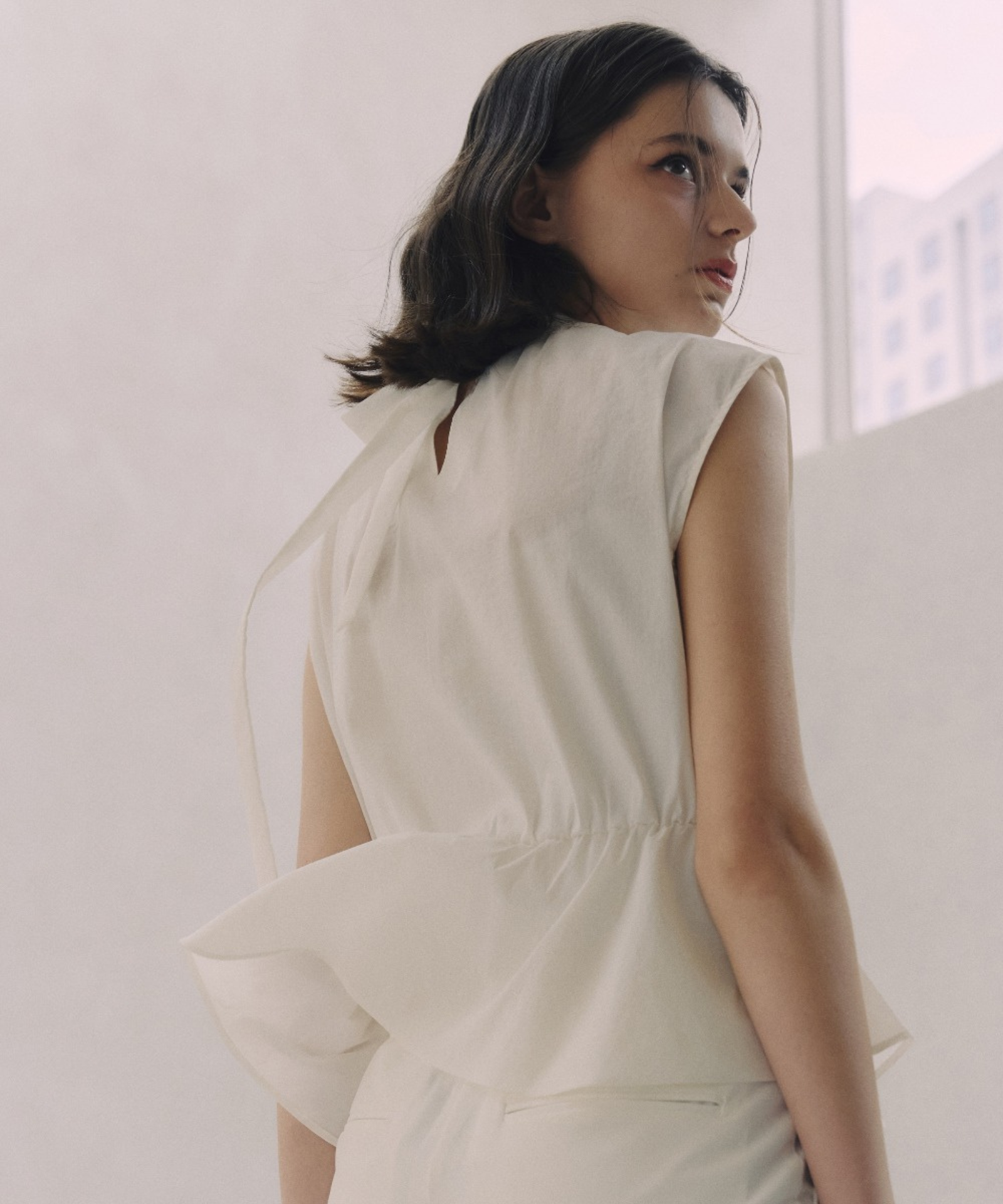 Crafted from premium windbreaker fabric, this ribbon vest seamlessly blends style with performance. The refined peplum silhouette and delicate ribbon collar detailing evoke understated elegance, while structured shoulders and a cinched elastic waist ensure a flattering silhouette. Engineered to shield against the elements, the water-repellent material deflects rain, wind, and harmful UV exposure while maintaining a breathable, featherlight feel against the skin. A subtle silicone logo accent and banded waist complete this versatile layering piece.