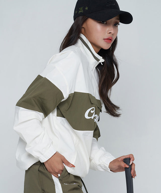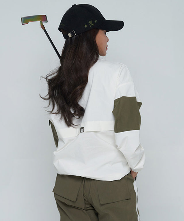 Treated with a windproof lining. Functionality and warmth at the same time. It is an anorak product. It is half zip-up style and warmly wraps up to the neck. It is comfortable to wear with stretchy fabric. The sporty color scheme design is stylish, Embossed with the brand logo on the front. You can see pocket details. The sleeves and hem are banded to show a natural silhouette.