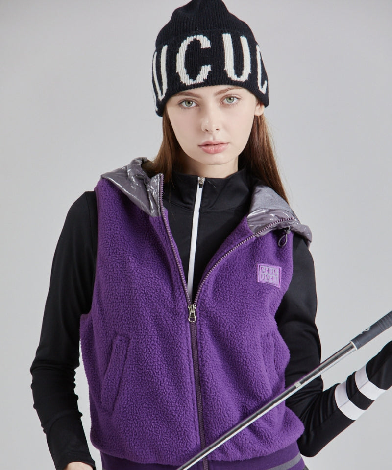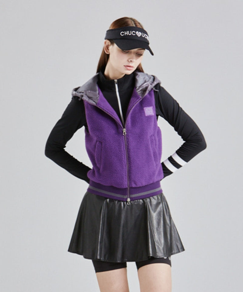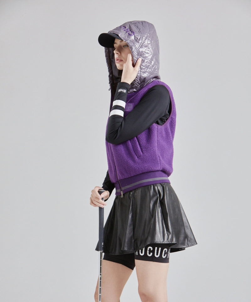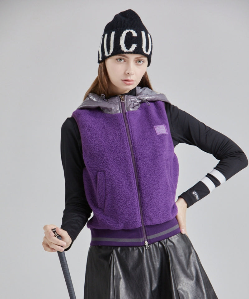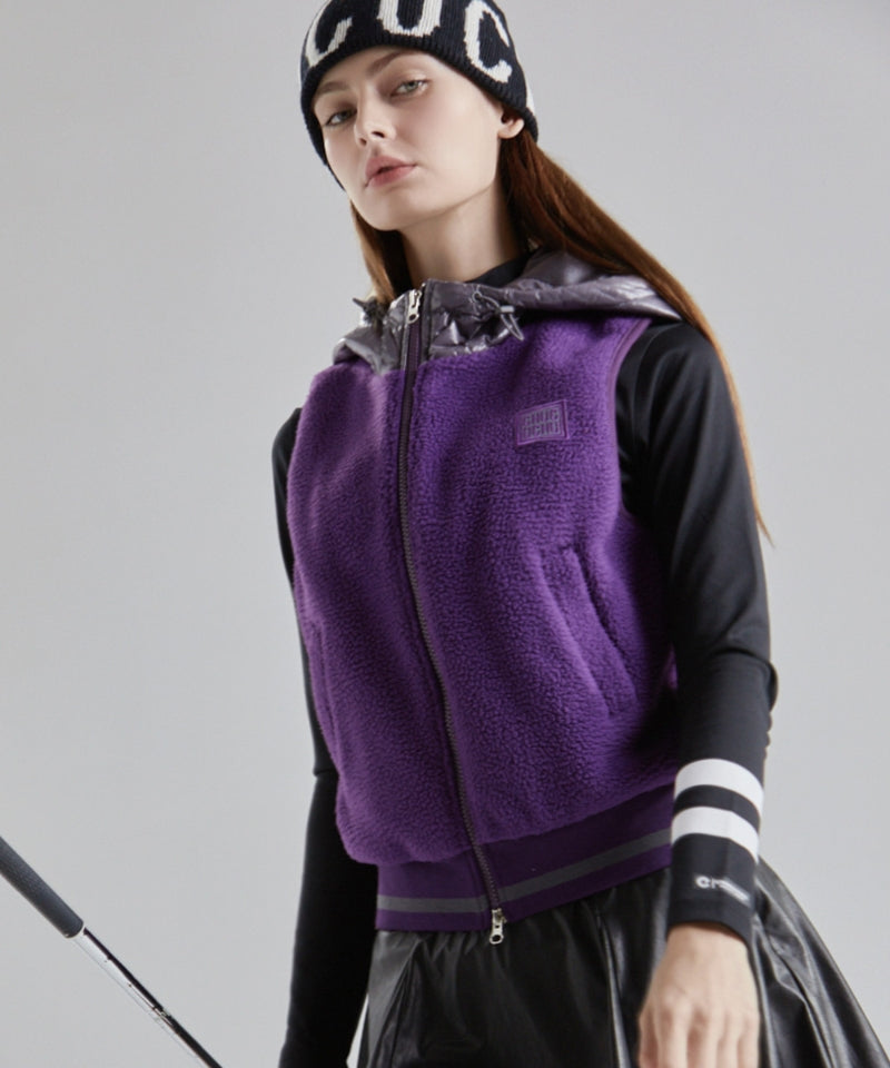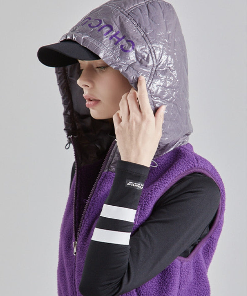 This vest features a fleece and padded hood with a full windproof lining for enhanced warmth. Its elegant blend of purple and gray hues offers a refined look. Perfect for fall and winter, it includes a two-way hood with adjustable drawstrings. The pockets are fleece-lined to retain heat, while ribbed cuffs on the sleeves help block wind and ensure a snug, comfortable fit.