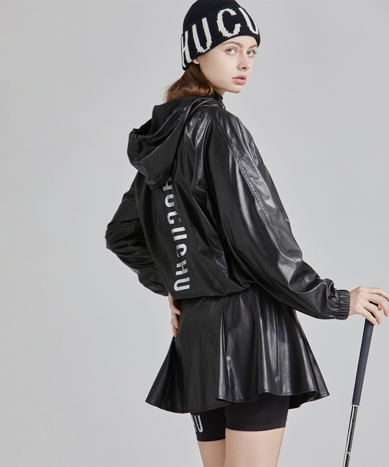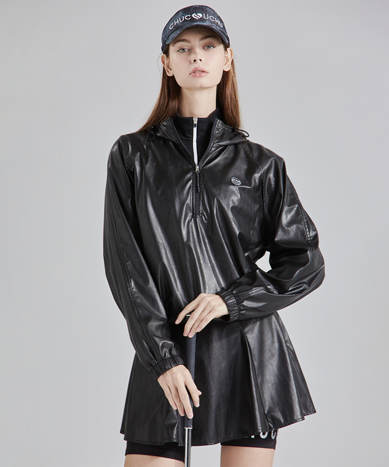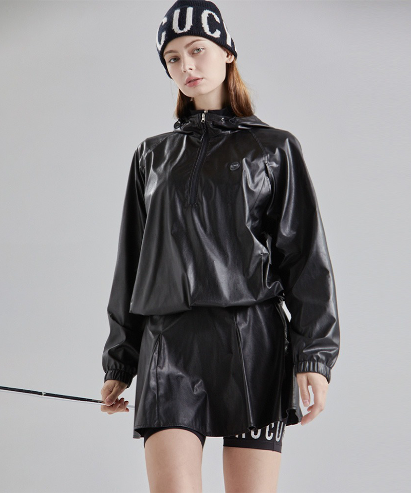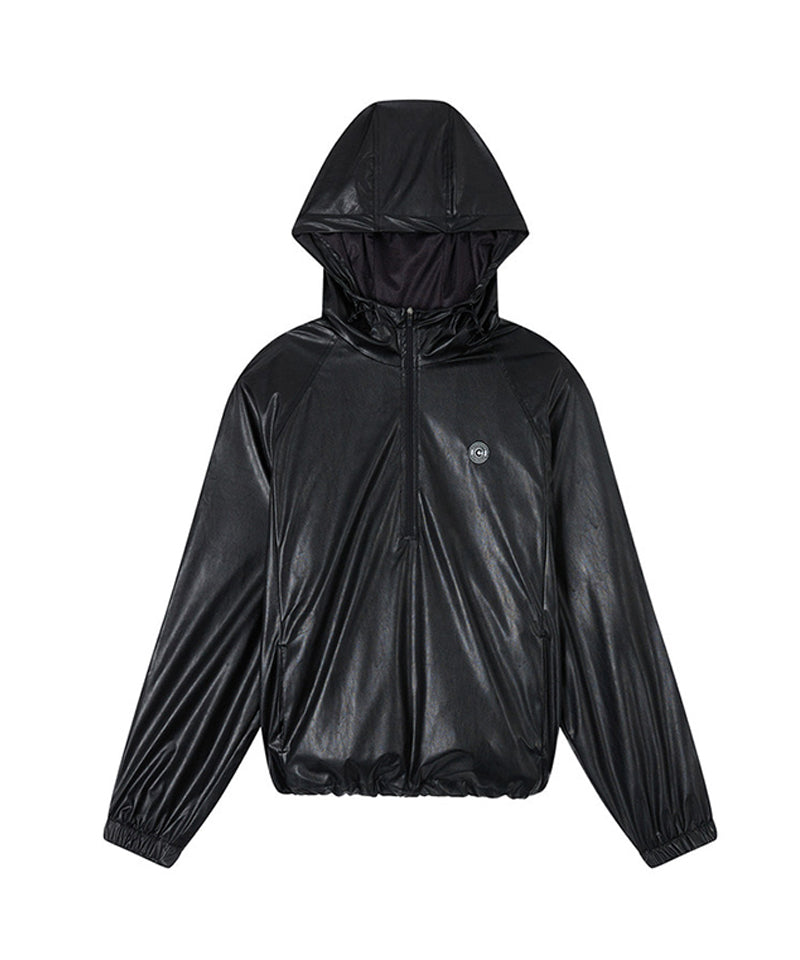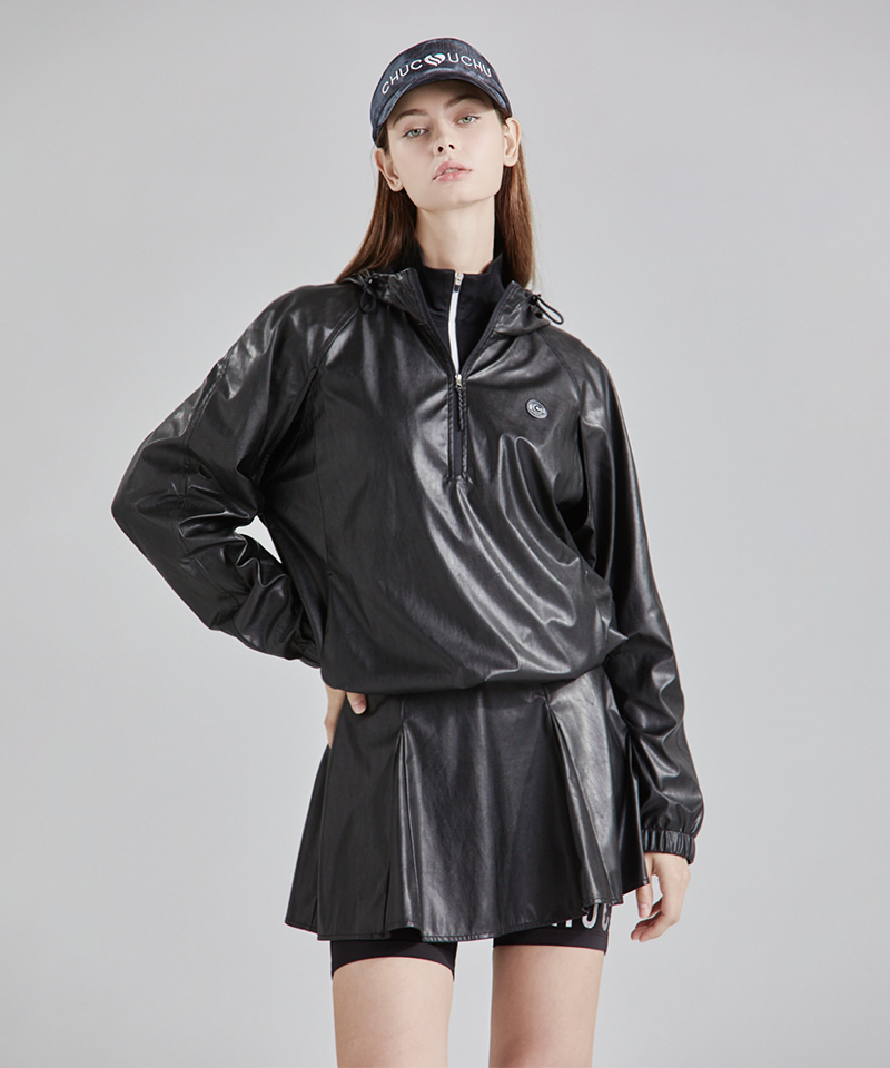 The CHUCUCHU Glossy Anorak Hooded Jumper in black combines sleek design with functional elegance. Its glossy finish adds a refined touch to the classic anorak silhouette, while the hood provides practical coverage. This jumper offers a sophisticated layering option that balances style and comfort effortlessly.