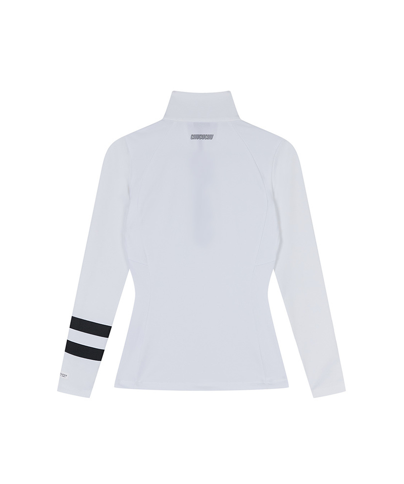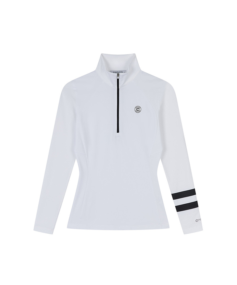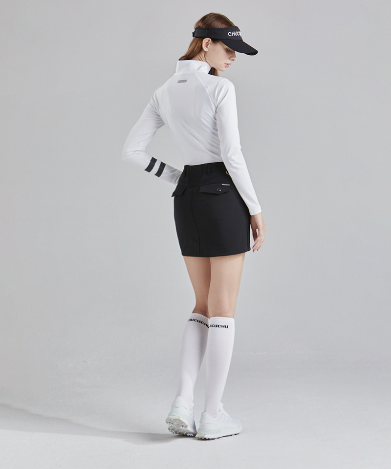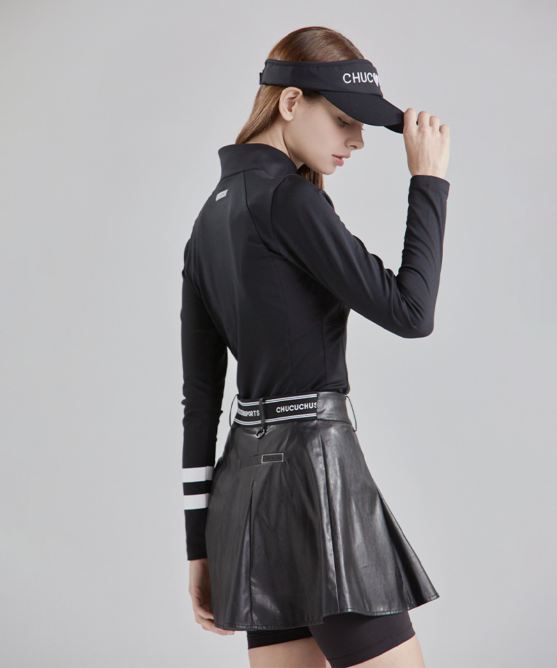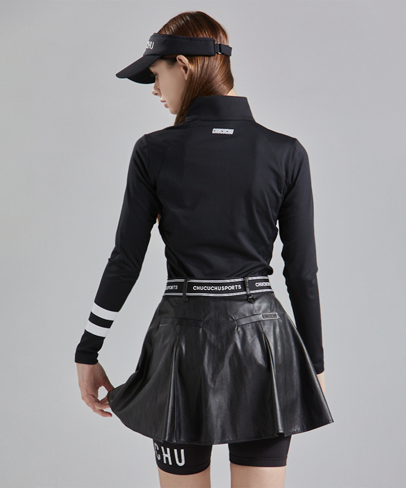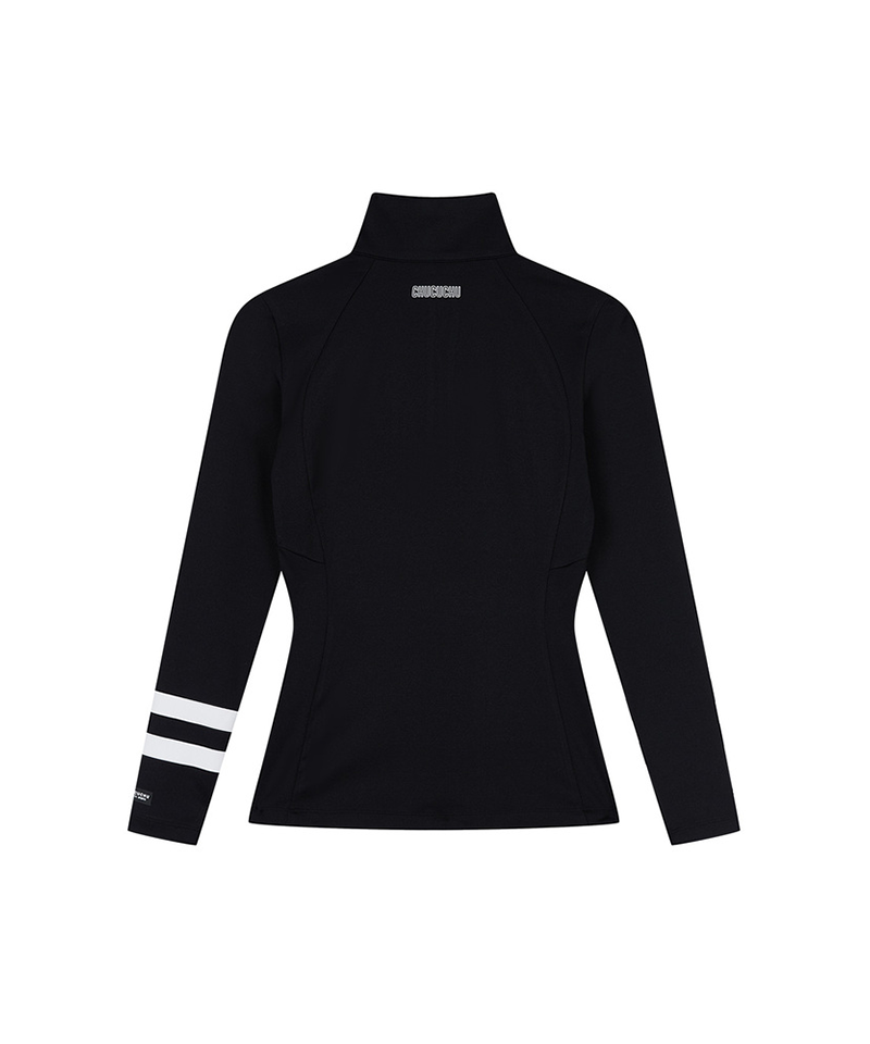 The CHUCUCHU Slim Line Half Zip-Up T-Shirt in black offers a sleek and contemporary design with a refined edge. Its half zip-up feature adds subtle detail while maintaining a minimalist silhouette, making it a versatile piece for sophisticated layering or standalone wear. The deep black color enhances its polished and elegant appeal.