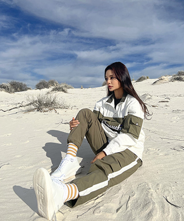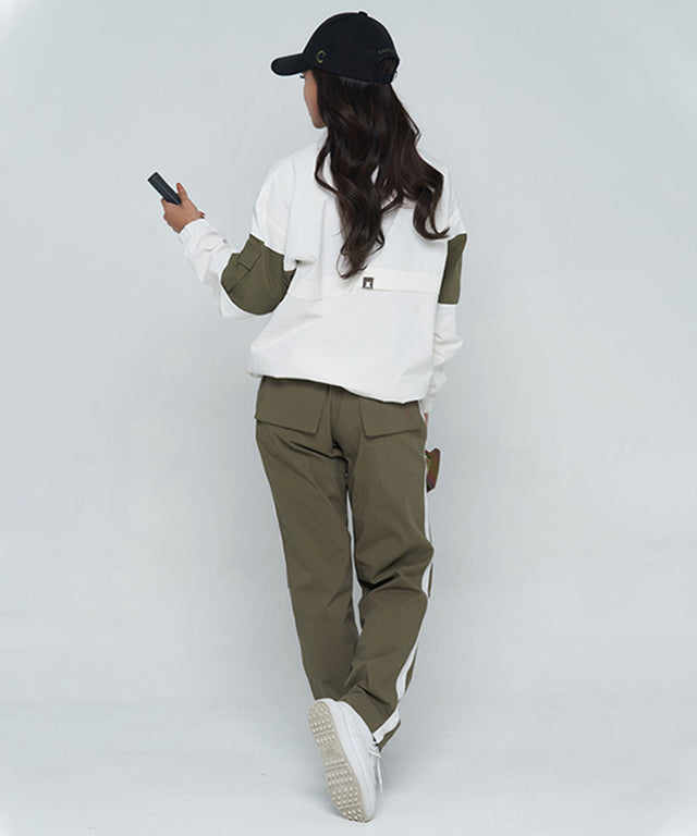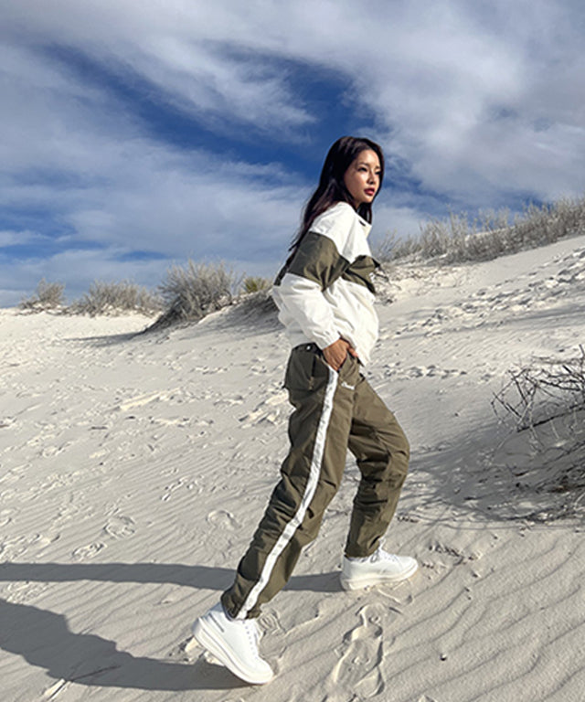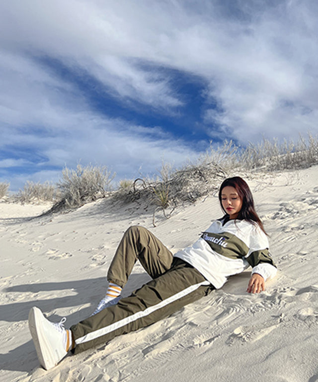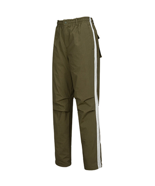 These are sporty and high-quality banding pants. Comfort with a string at the waist. It is an item with stylish details and silhouette. It has a pocket for easy storage. Embroidered logo on the bottom of the pocket. There is a three-dimensional pocket on the hip part.