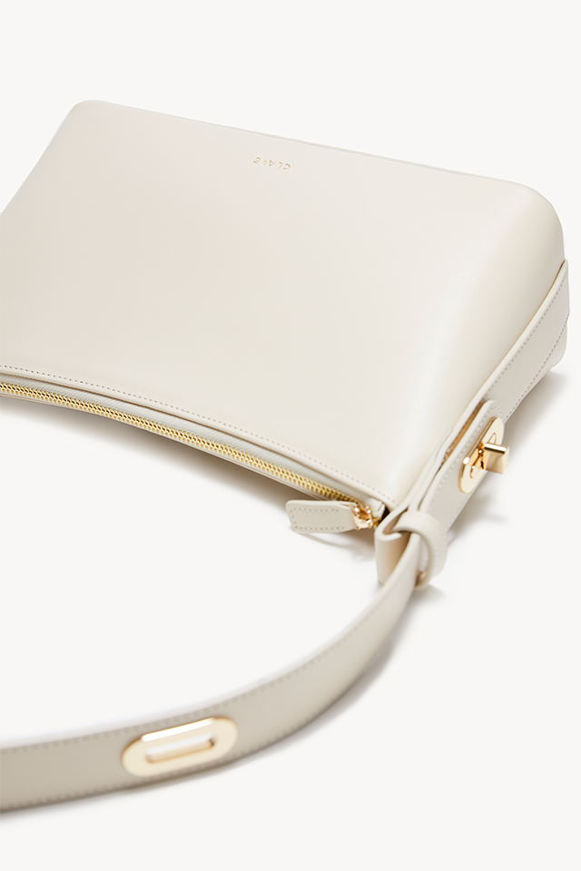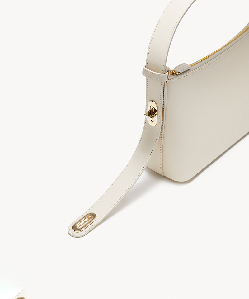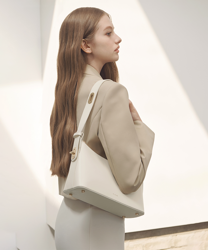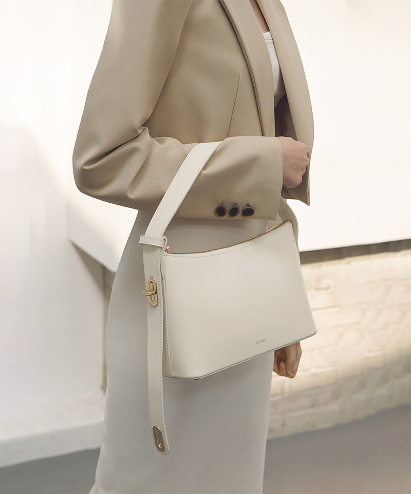 The strap features two of CLAVE’s signature CLE metal accents, allowing for adjustable length and versatile styling options. Inside the bag, a separate zippered pocket provides practical storage, while the strap itself stands out as a bold design element. Metal feet at the bottom help protect the leather from damage, ensuring durability and long-lasting use.