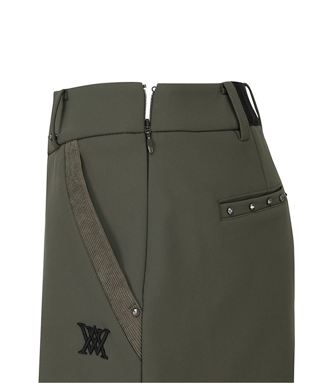 This is an H-line skirt using bonding material. It was designed with a mix of corduroy in the pocket area to create a simple but warm feeling. A band is placed at the back of the waist to make it comfortable to wear, and it is designed with a pocket with a logo on the hip's swinging.