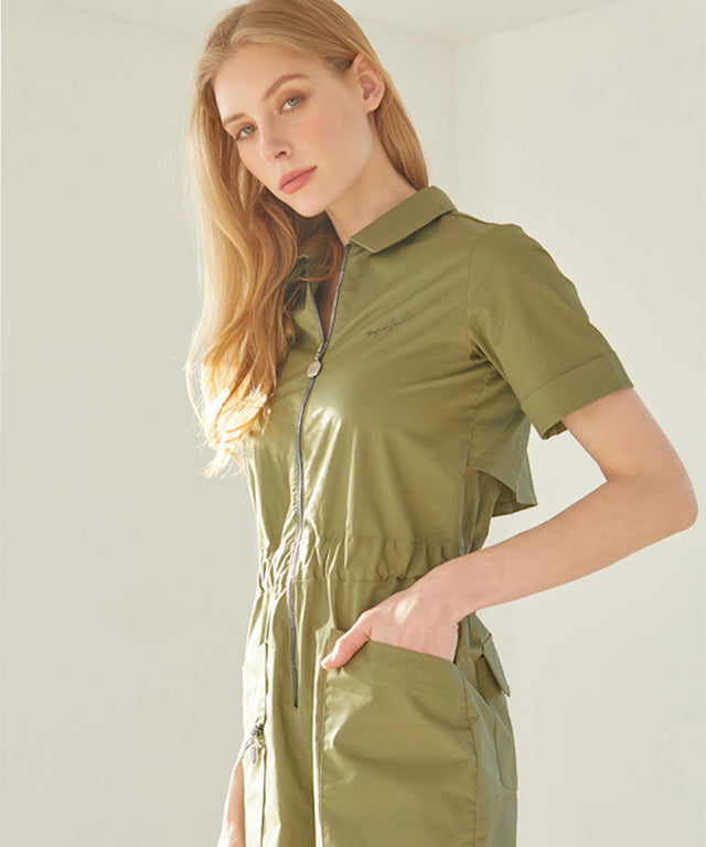 It is a product that adds functionality to the mesh material and gives a feminine touch with the matching pleats on the back detail. It features an elegant silver zipper with metal thread. The natural waistband provides a feminine feel and adds a youthful sensibility. And the jumpsuit provides a casual feel and offers a unique sensibility.