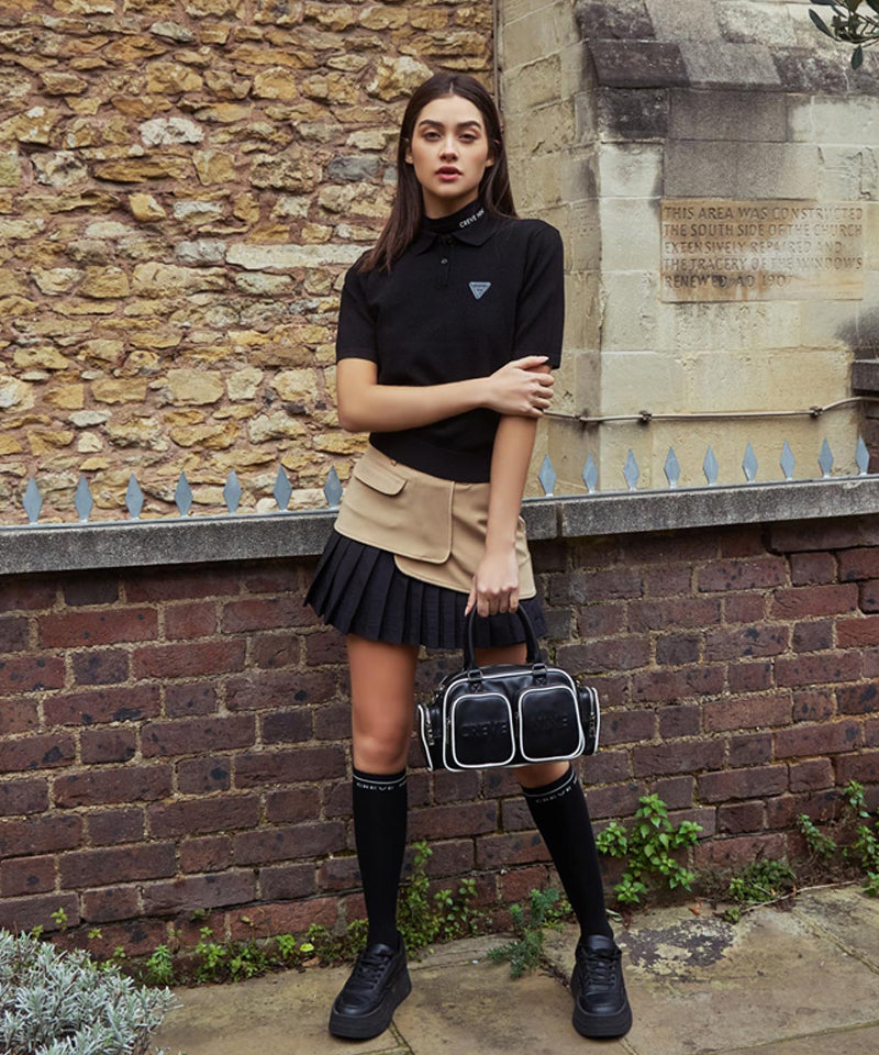 Wrap-shaped pleated skirt premium spandex Creo provides a comfortable, high-quality fit. Hem pleated point for femininity pocket logo detail unique design using color-matched fabrics. Comfortable activities are possible by attaching inner pants.