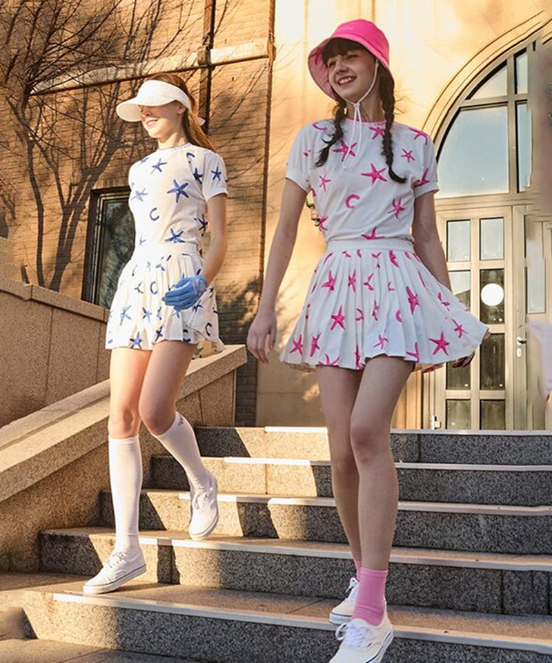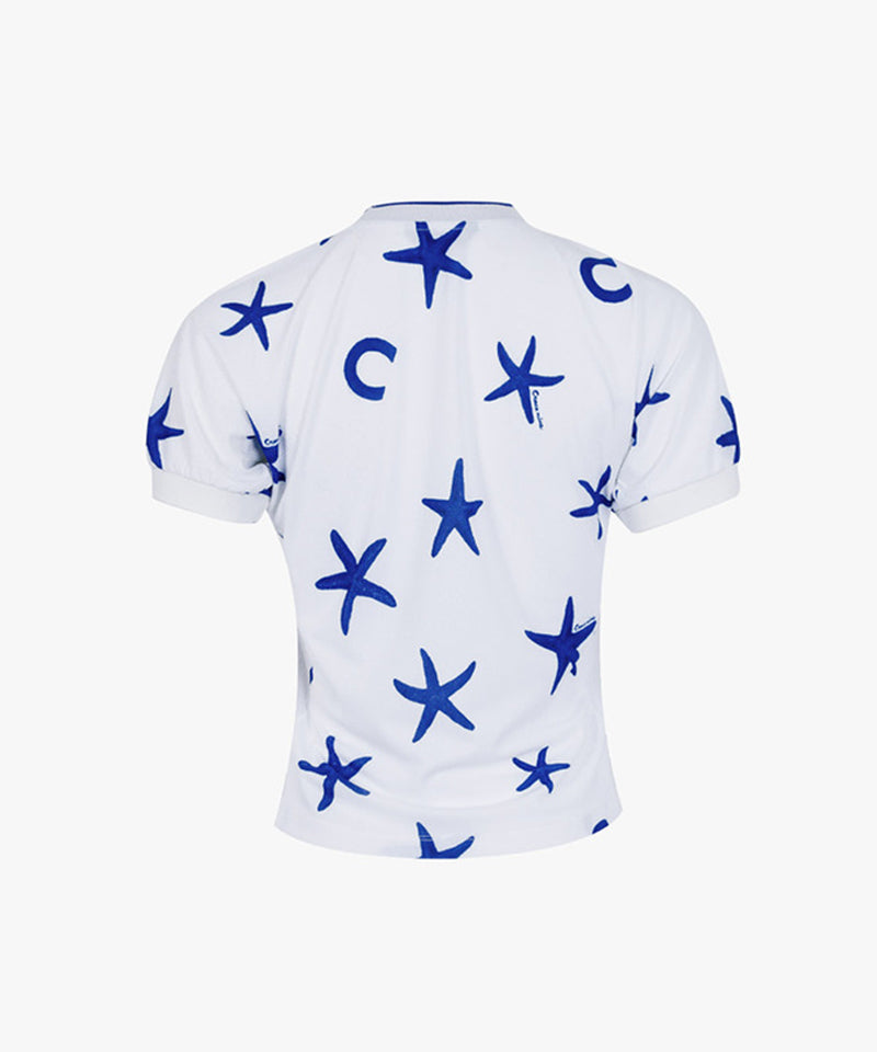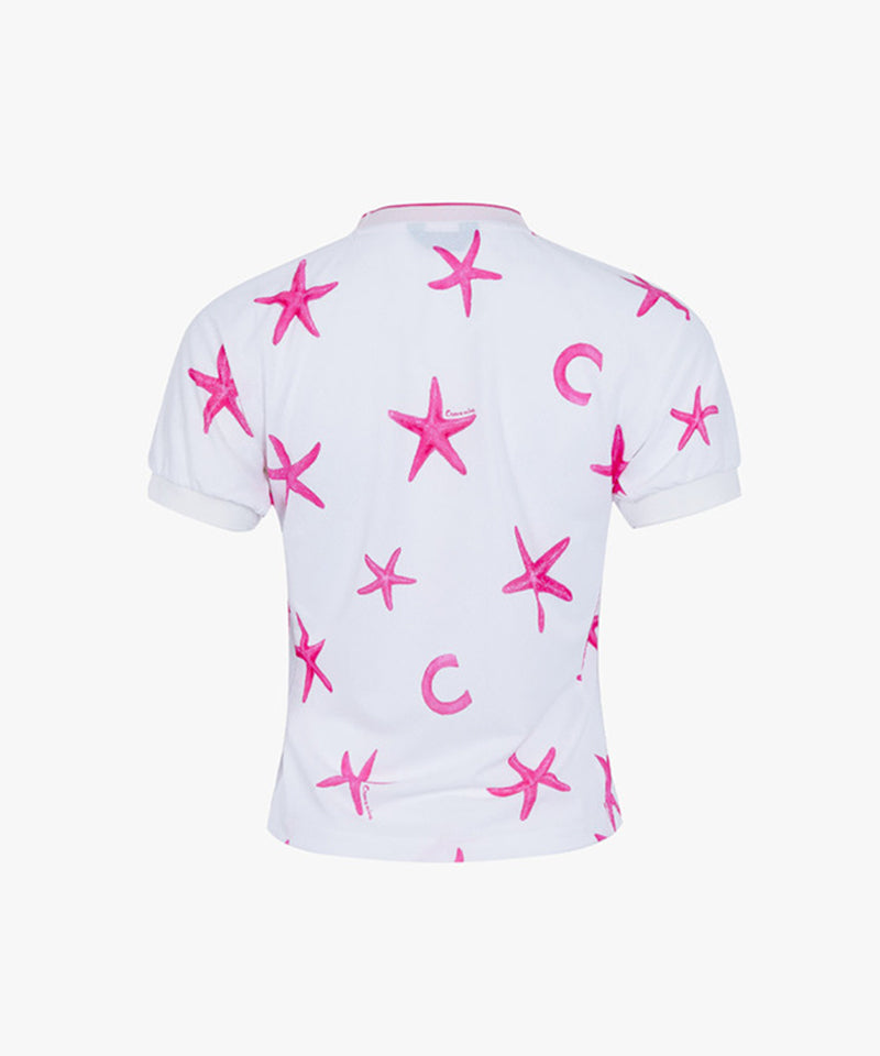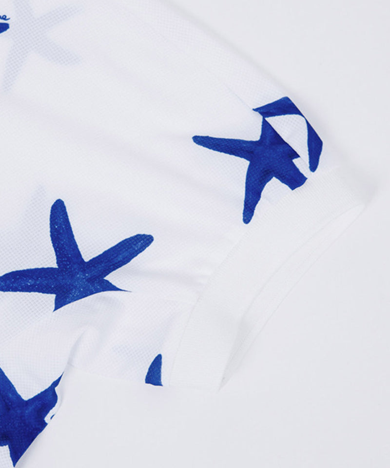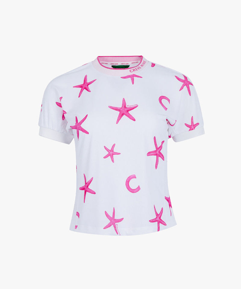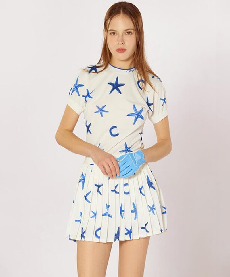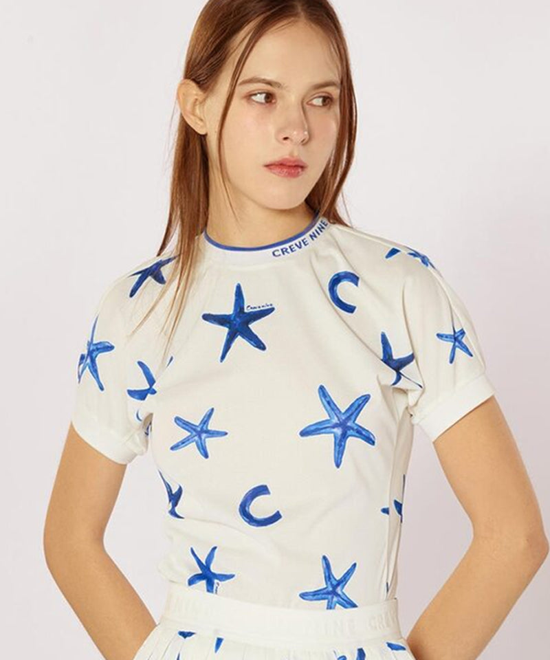 This pattern printing version of the signature cooling round tee offers UV blocking functionality for added sun protection. Made from pique jersey material with a cool touch, it ensures comfort and a refreshing feel. The tee features unique seasonal patterns printed, adding a stylish flair to your wardrobe. A neck logo shirring point enhances the design, giving it a distinctive touch. It is part of a set coordination, perfectly paired with the Marine Star Pleated Skirt and Marine Star Two-Way Bucket Hat for a complete, fashionable look.