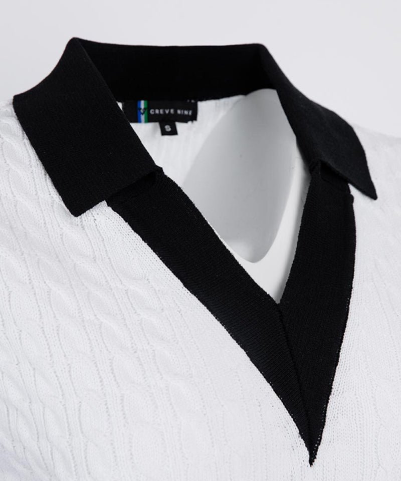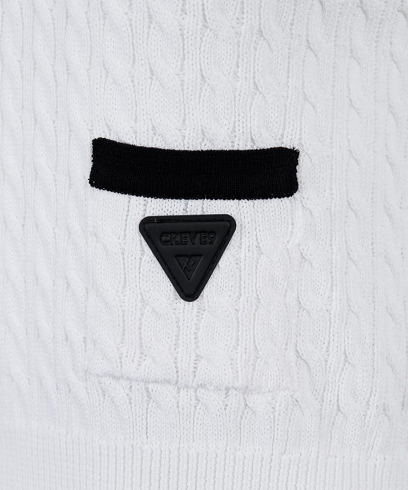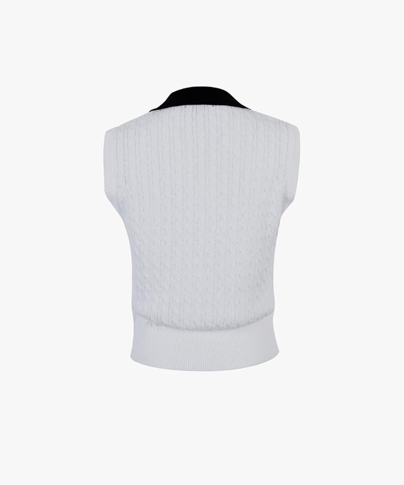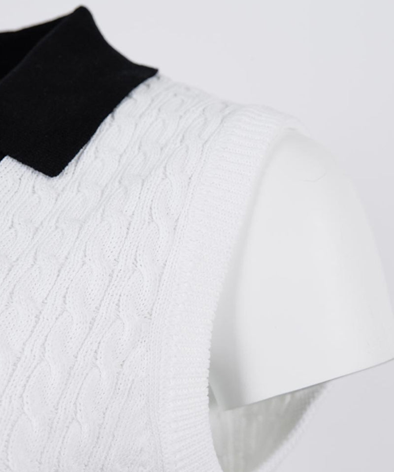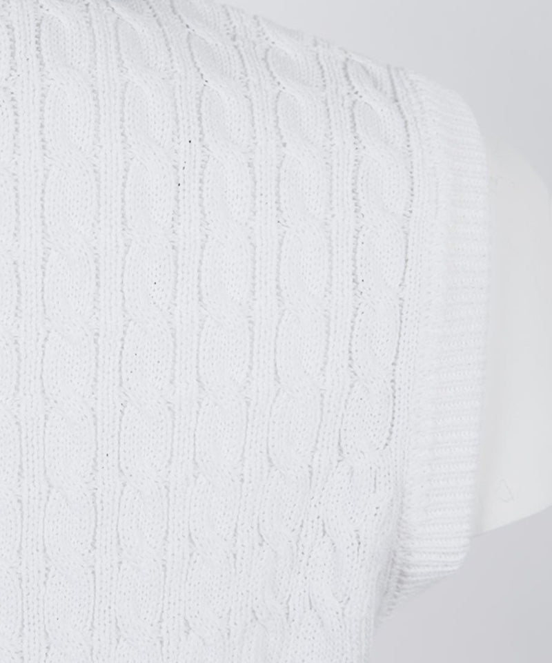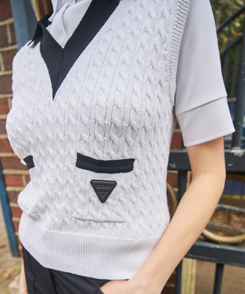 A versatile vest with a V-neck color combination point. Bold cable organization details a soft touch thanks to a synthetic fiber blend. Cover your body shape with an overfit.
