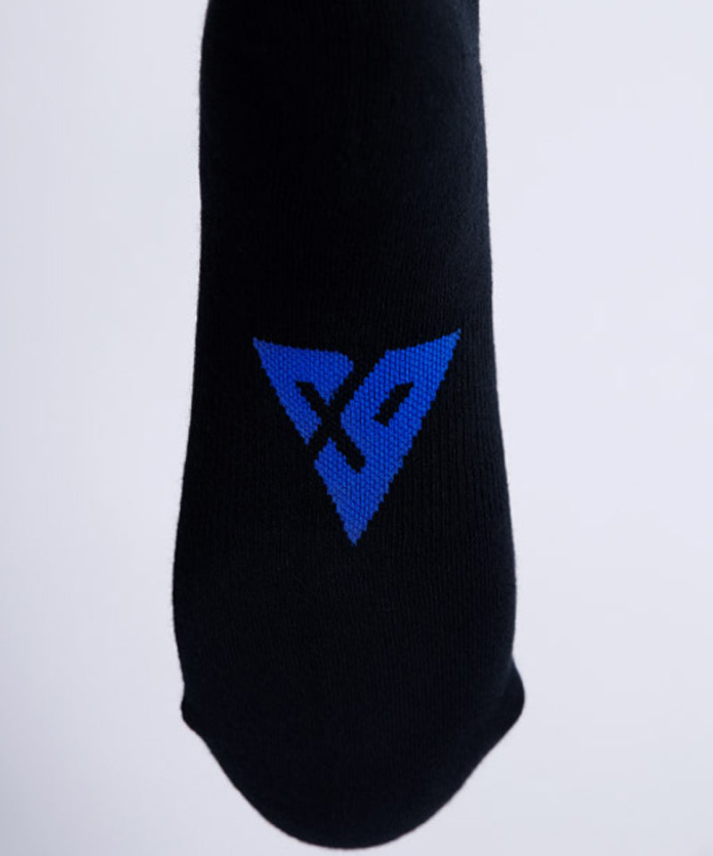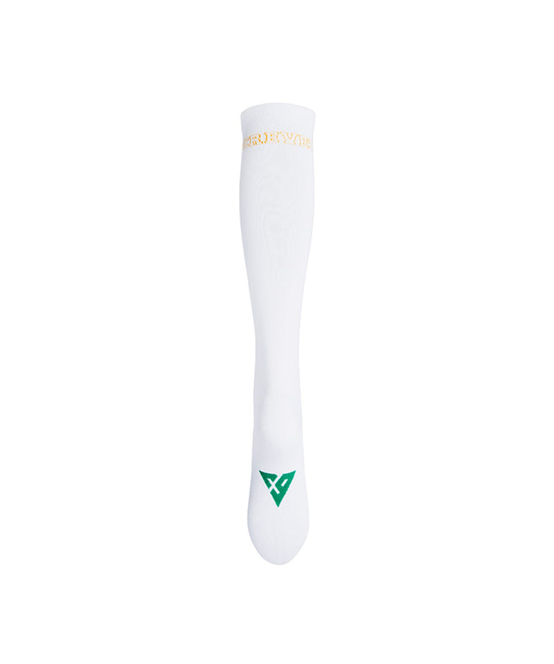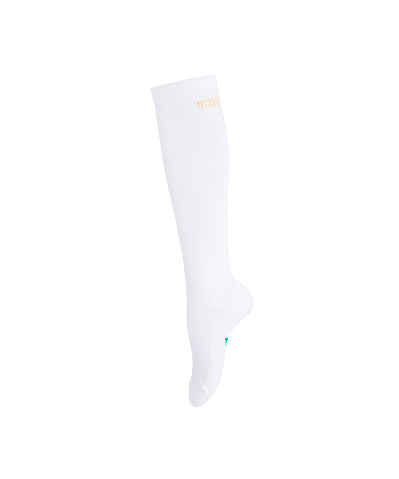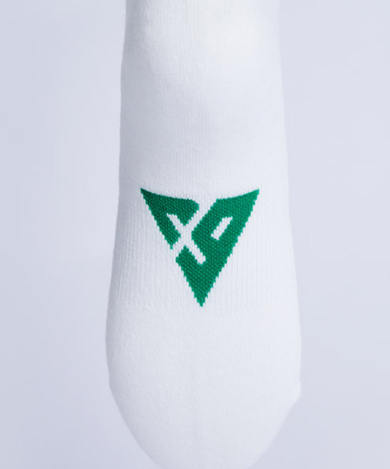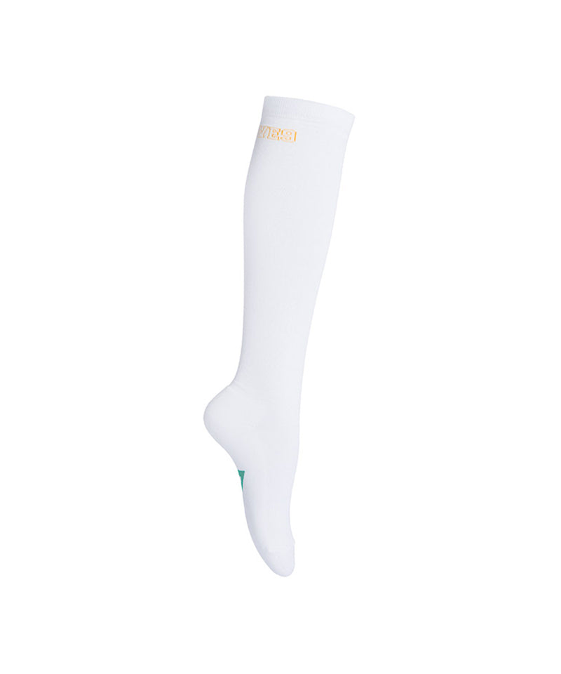 These are women’s logo knee socks. Color point at the center of the back. Foot sole logo point. Foot center banding detail.