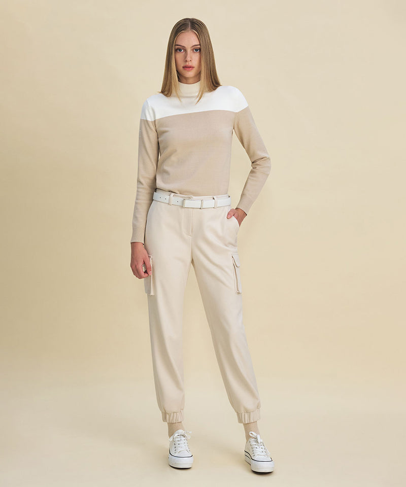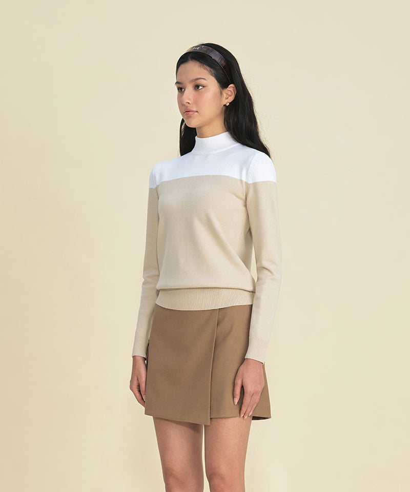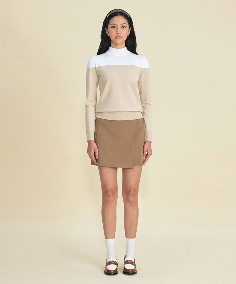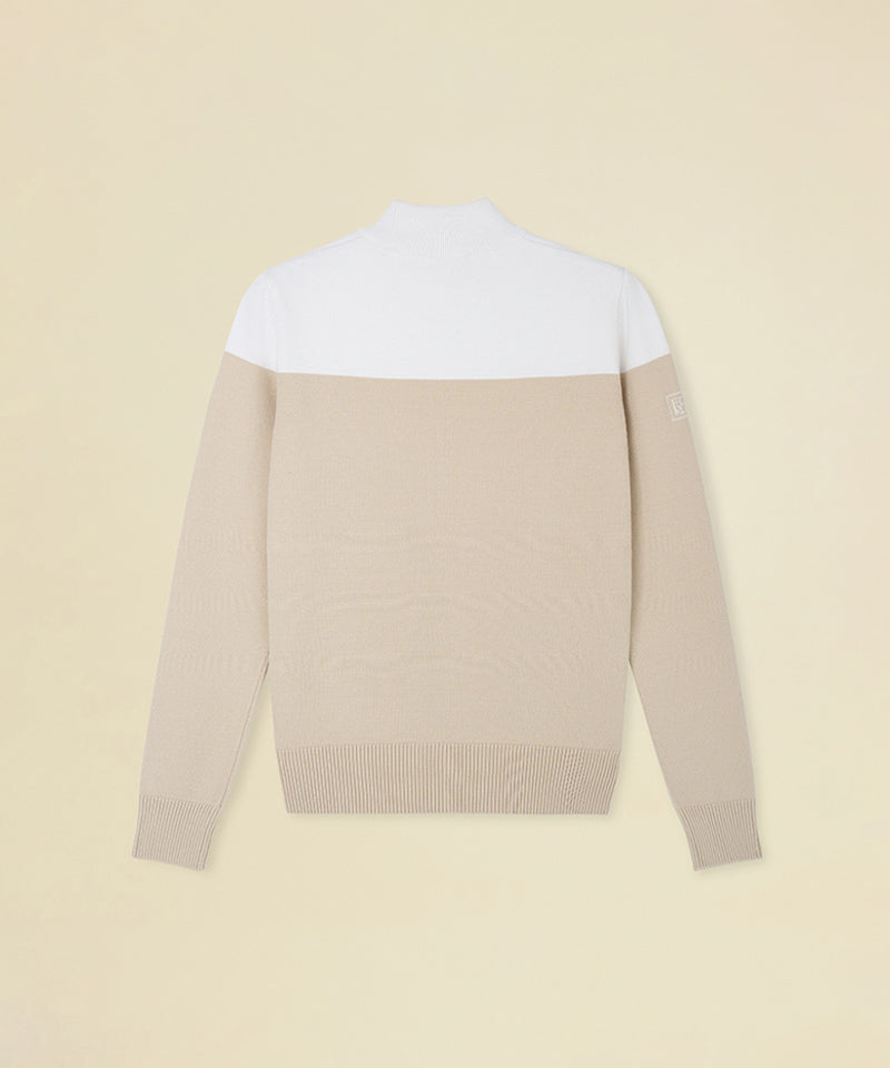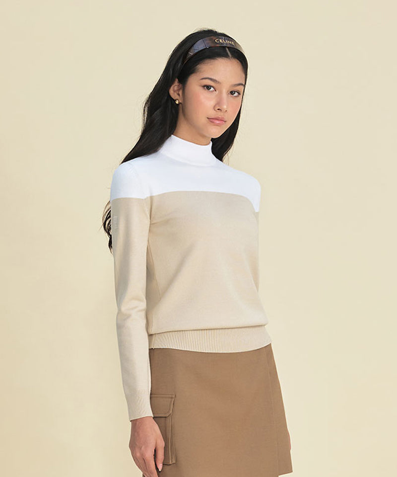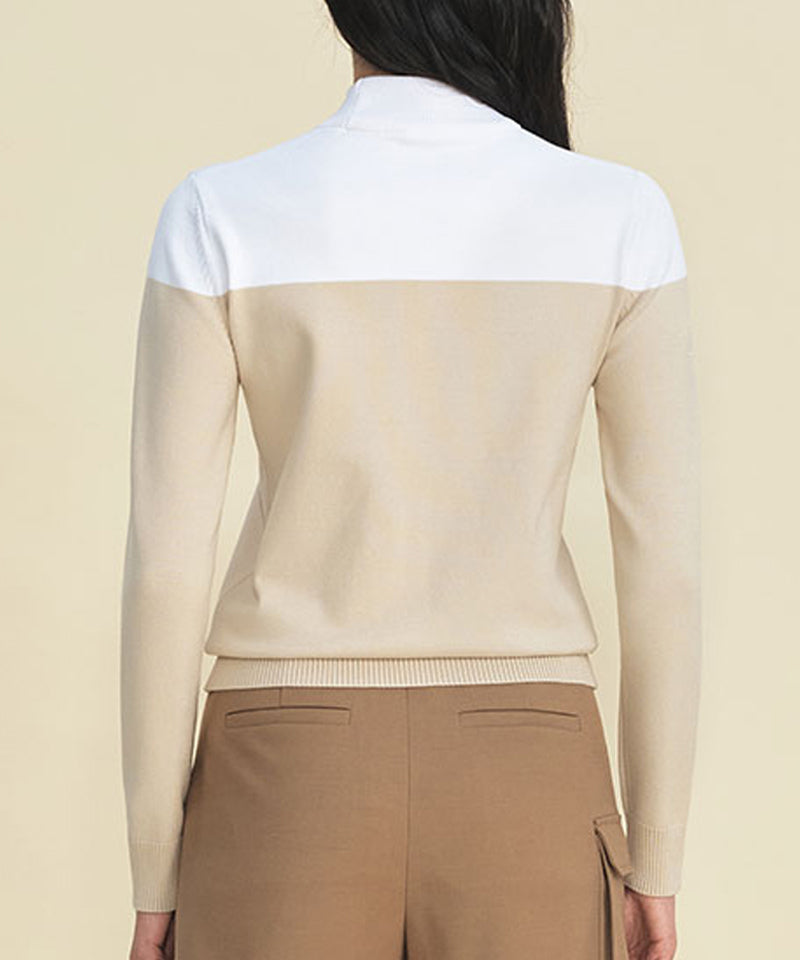 This turtleneck knit features luxurious color blocking details and is crafted from stretch yarn for comfort and increased mobility. Its thickness makes it suitable for wearing from mid-season to winter. The brand identity is highlighted through logo embroidery points. With Fordi's luxurious silhouette, this item offers high usability, transitioning effortlessly from the fairway to everyday life.
