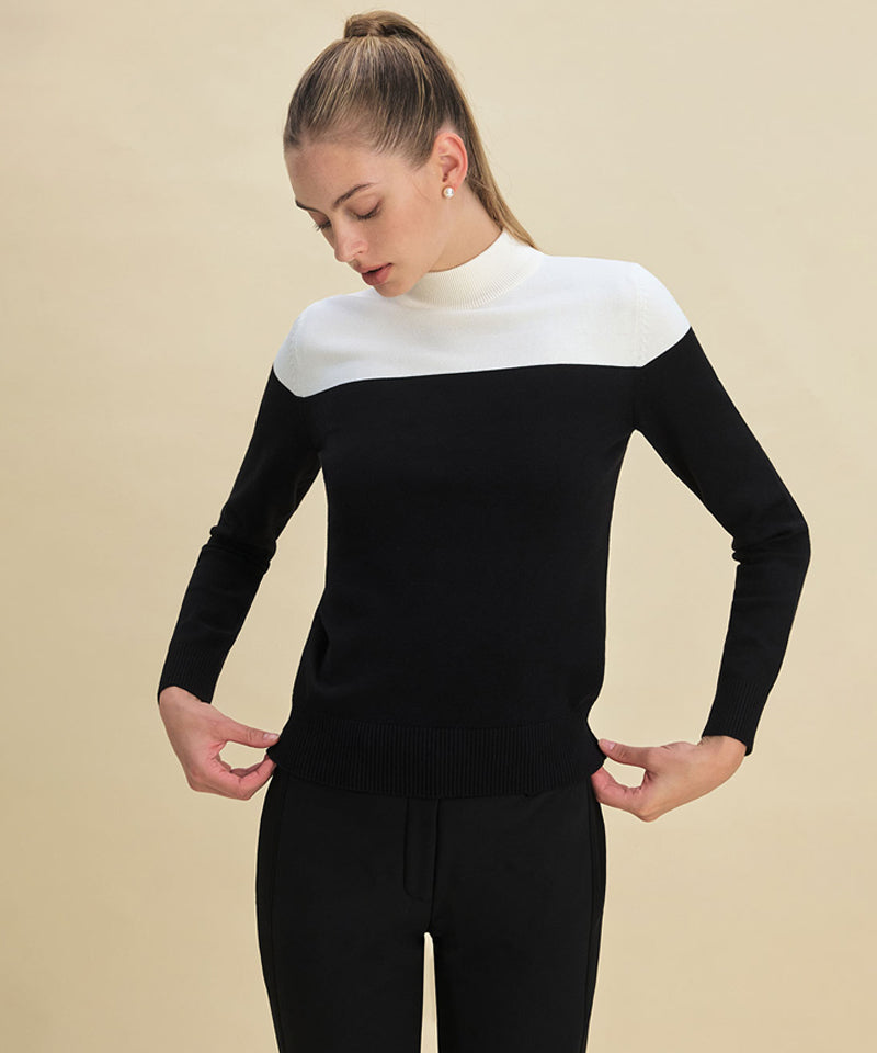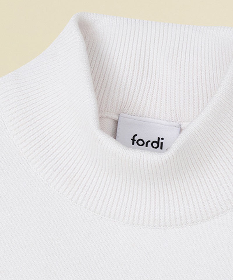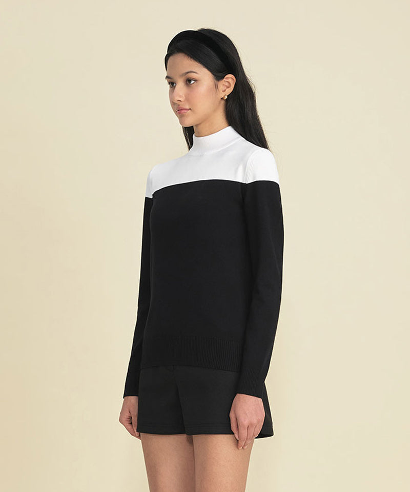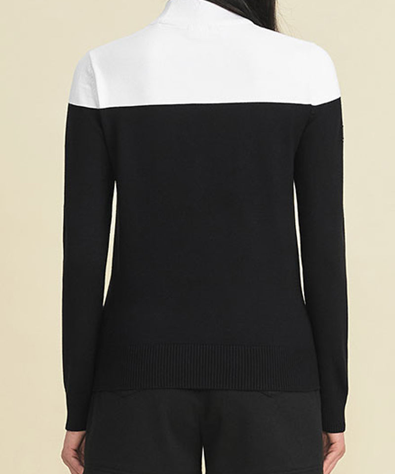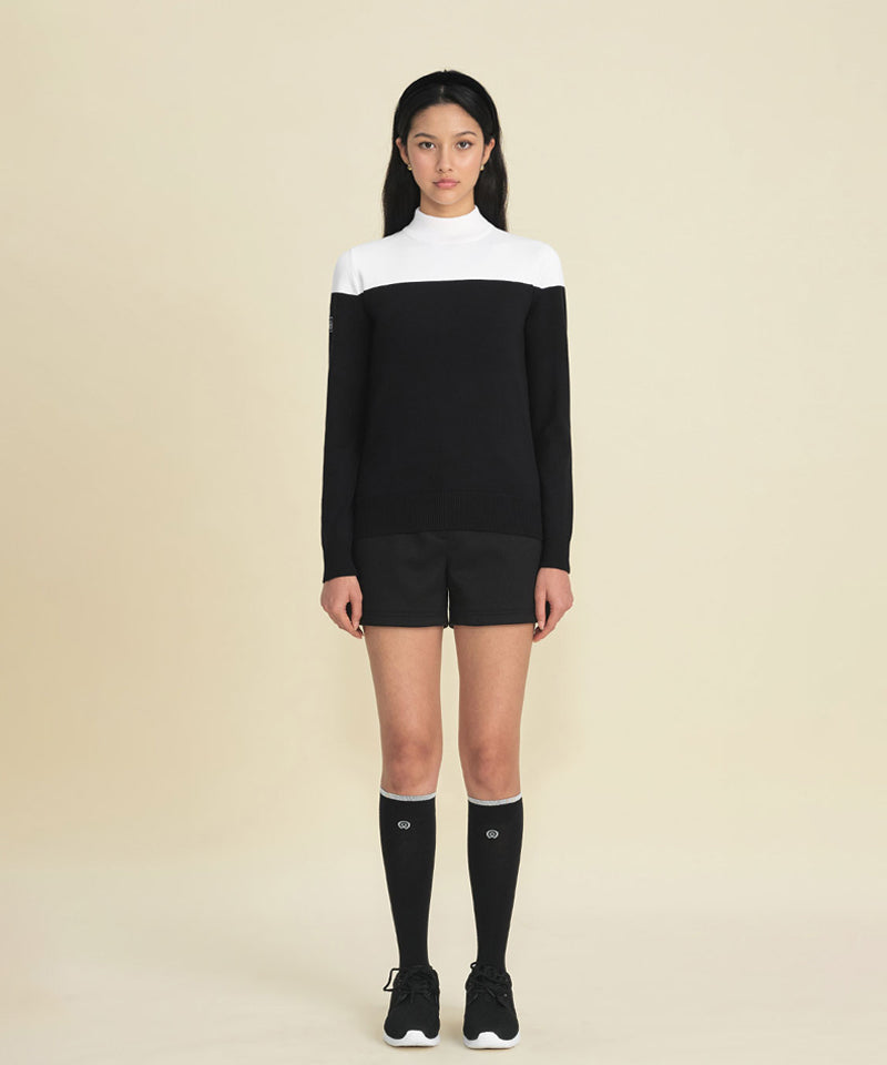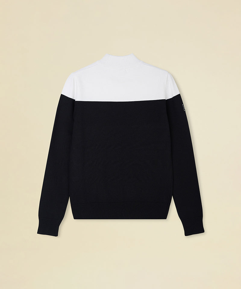 This turtleneck knit features luxurious color blocking details and is crafted from stretch yarn for comfort and increased mobility. Its thickness makes it suitable for wearing from mid-season to winter. The brand identity is highlighted through logo embroidery points. With Fordi's luxurious silhouette, this item offers high usability, transitioning effortlessly from the fairway to everyday life.