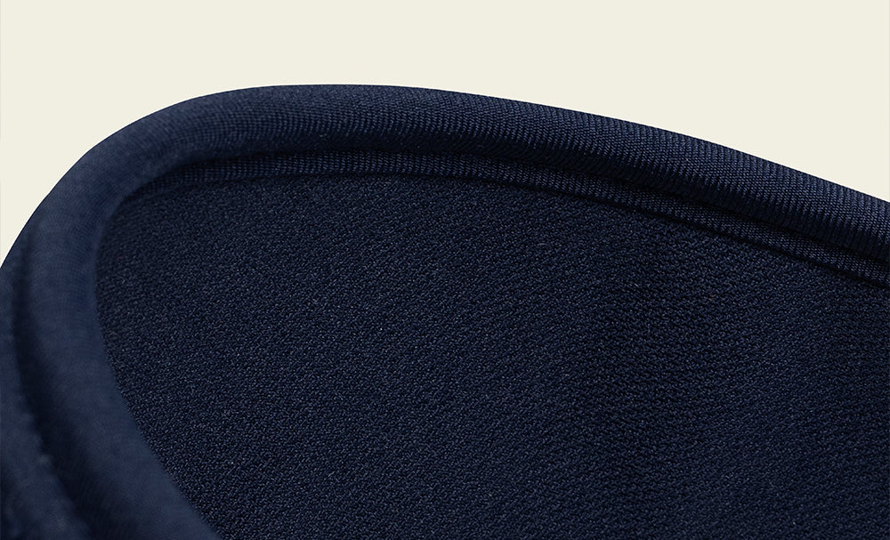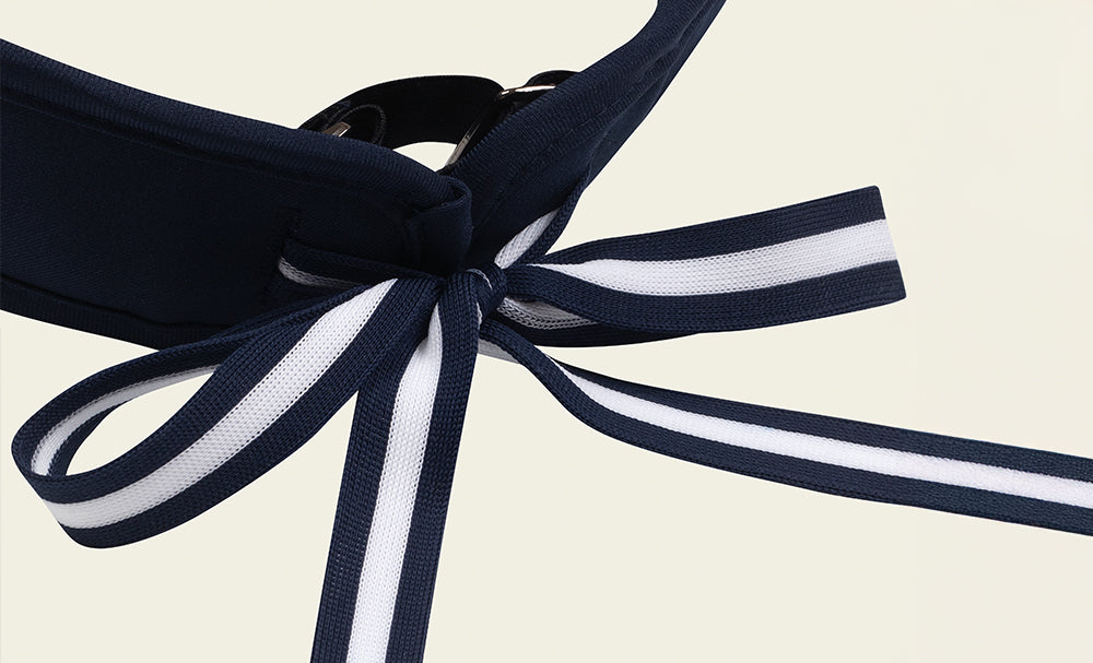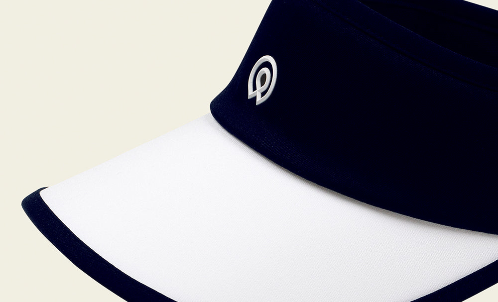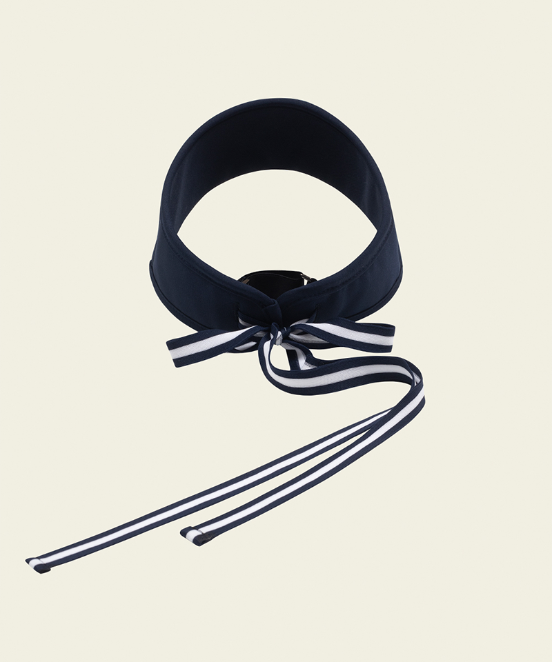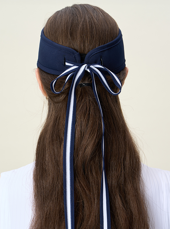 A sun visor made of high-density polyester fabric, ensuring durability and a luxurious texture. The tightly woven material provides excellent shape retention, while the cushioned mesh lining enhances comfort and moisture absorption. The band detail allows for easy size adjustments, and the optimal fit ensures all-day comfort. The detachable ribbon detail at the back adds a feminine touch.