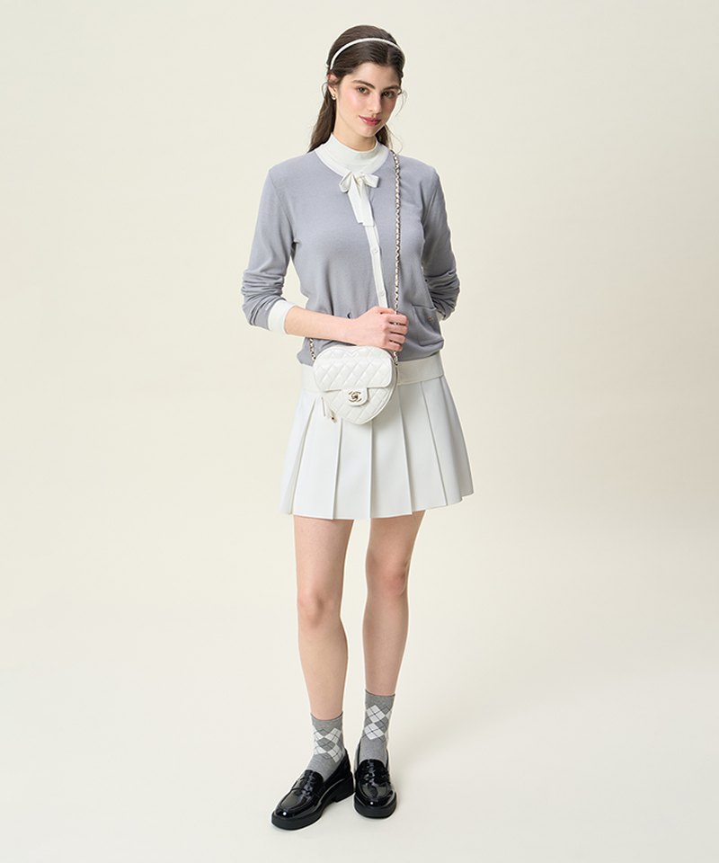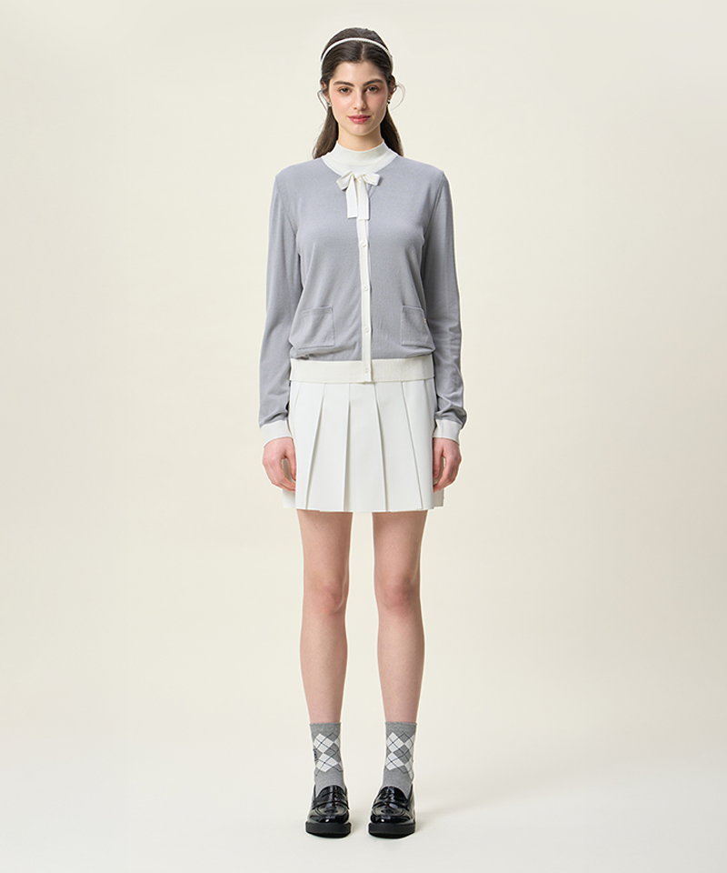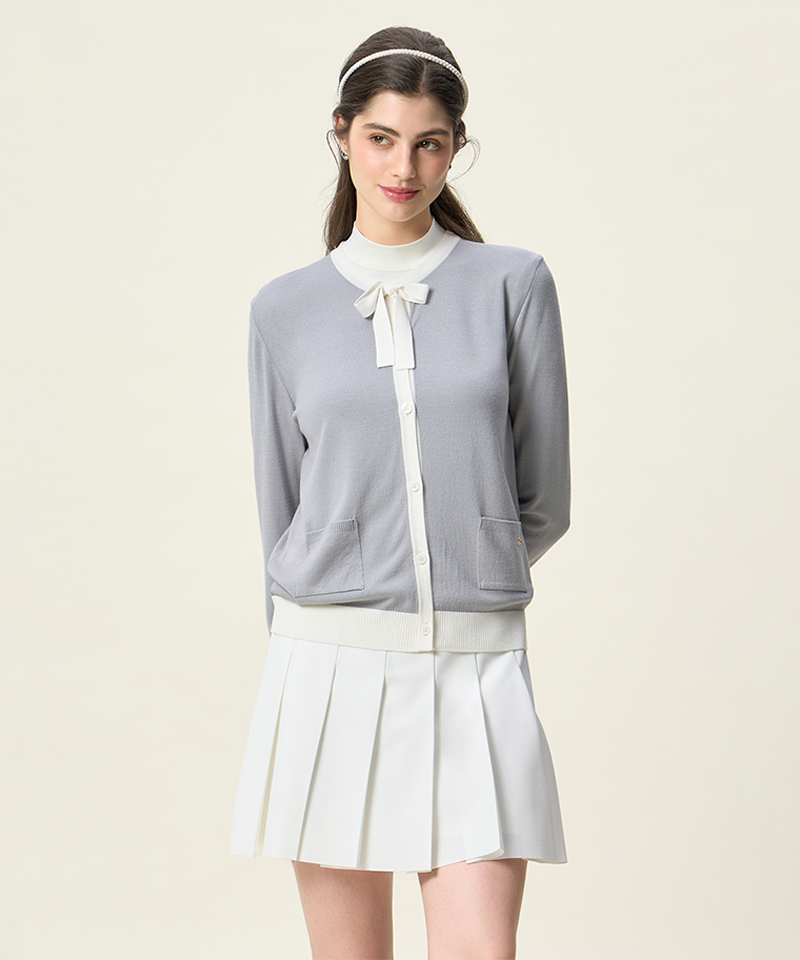 A soft-touch, lightweight knit cardigan with a refined color palette that enhances any look. The viscose blend ensures a smooth and comfortable feel, while seasonal theme colors provide a sophisticated aesthetic. Feminine ribbon details add elegance, making it a versatile essential for layering with various outfits.