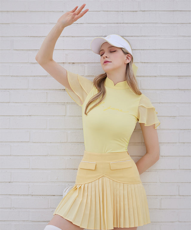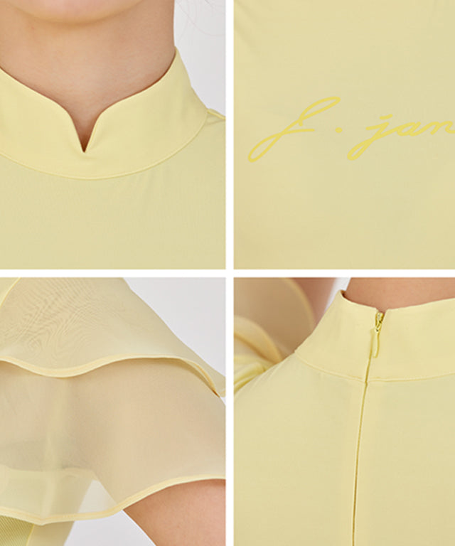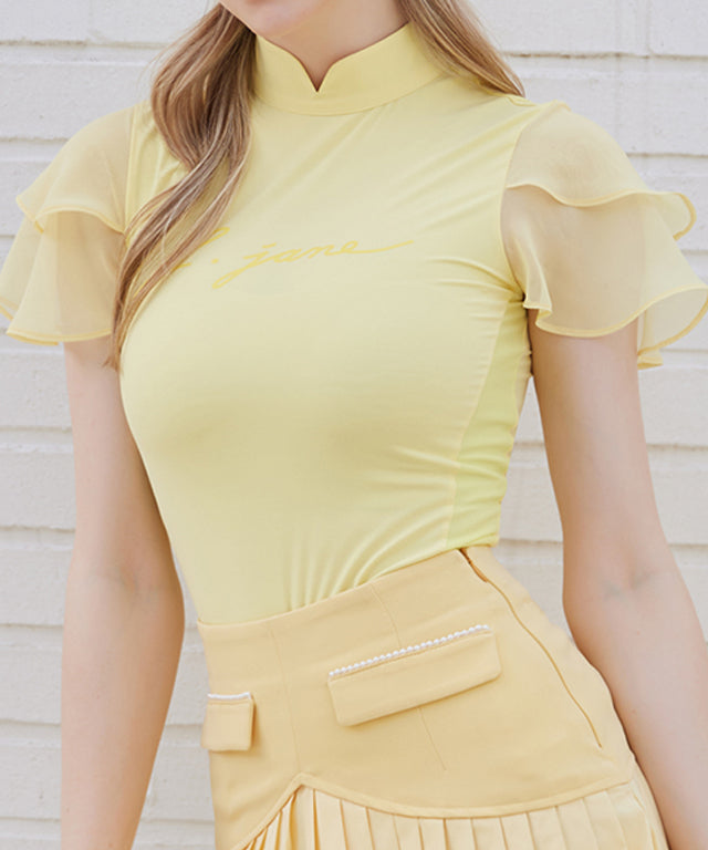 Bright and colorful and filled with flair with tulip-like chiffon sleeves! The side mesh provides sportiness and breathability- It's a chiffon high-neck short-sleeved T-shirt that's pretty but also functional.