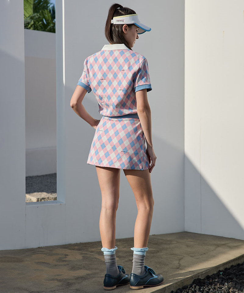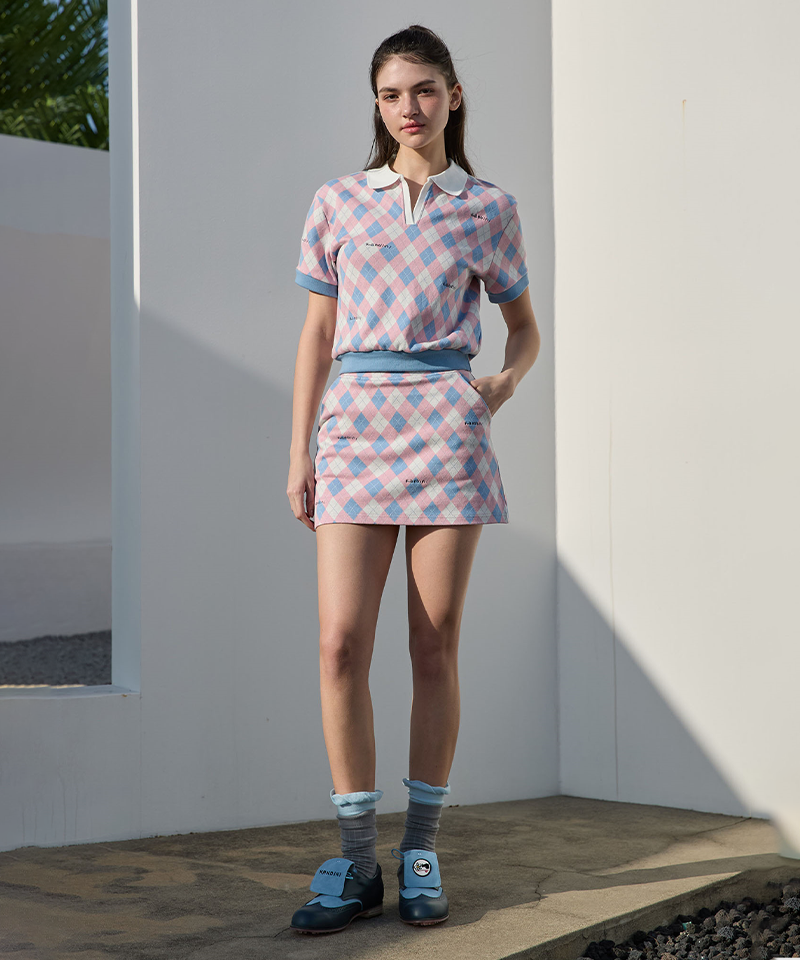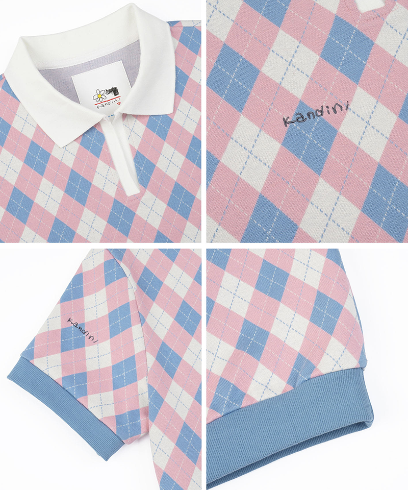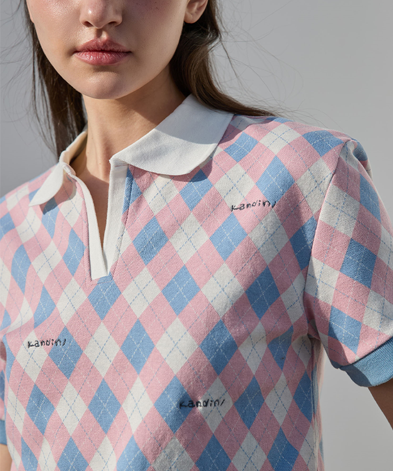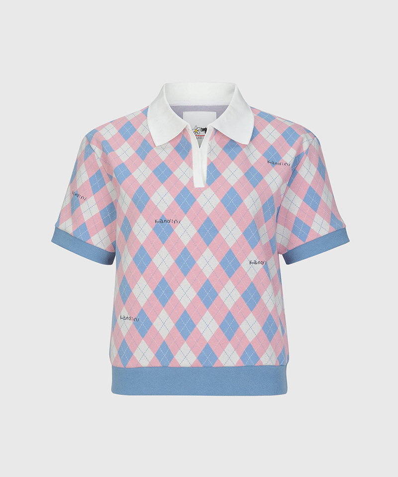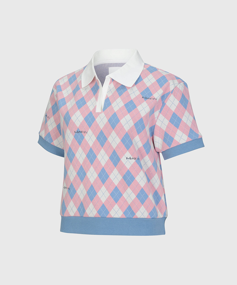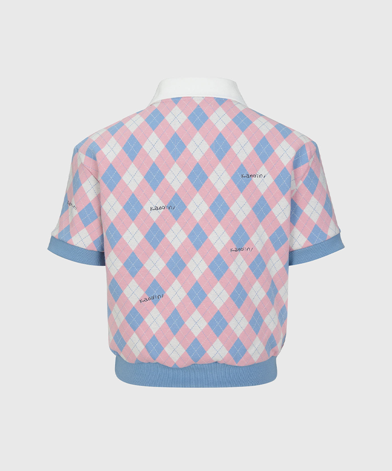 KANDINI Argyle Jacquard V-Neck Top - Pink/Sky Blue