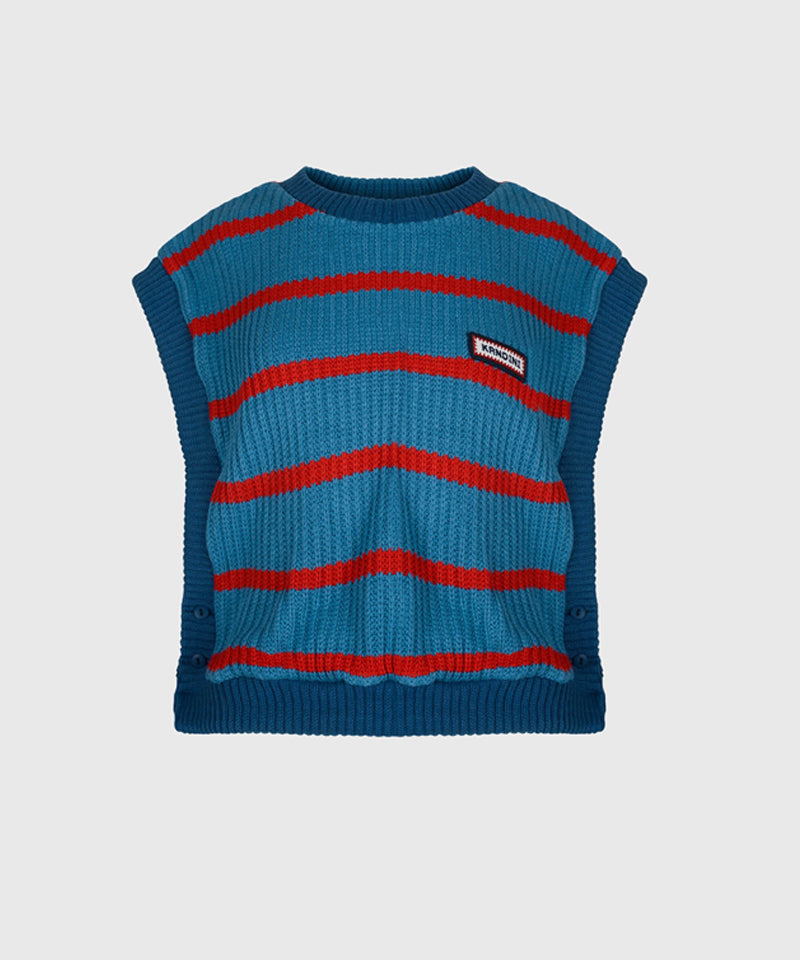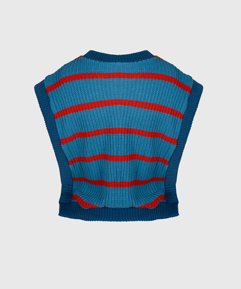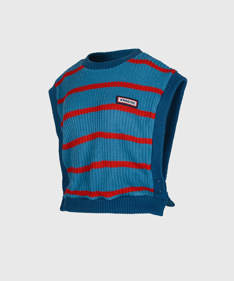 This striped knit vest features pretty colors and a semi-cropped fit that creates a slimming effect when worn. The stylish Kandini Wappen adds a chic touch, while the generous armholes allow for comfortable pairing with any innerwear. Versatile enough for everyday wear, this vest is both fashionable and functional.