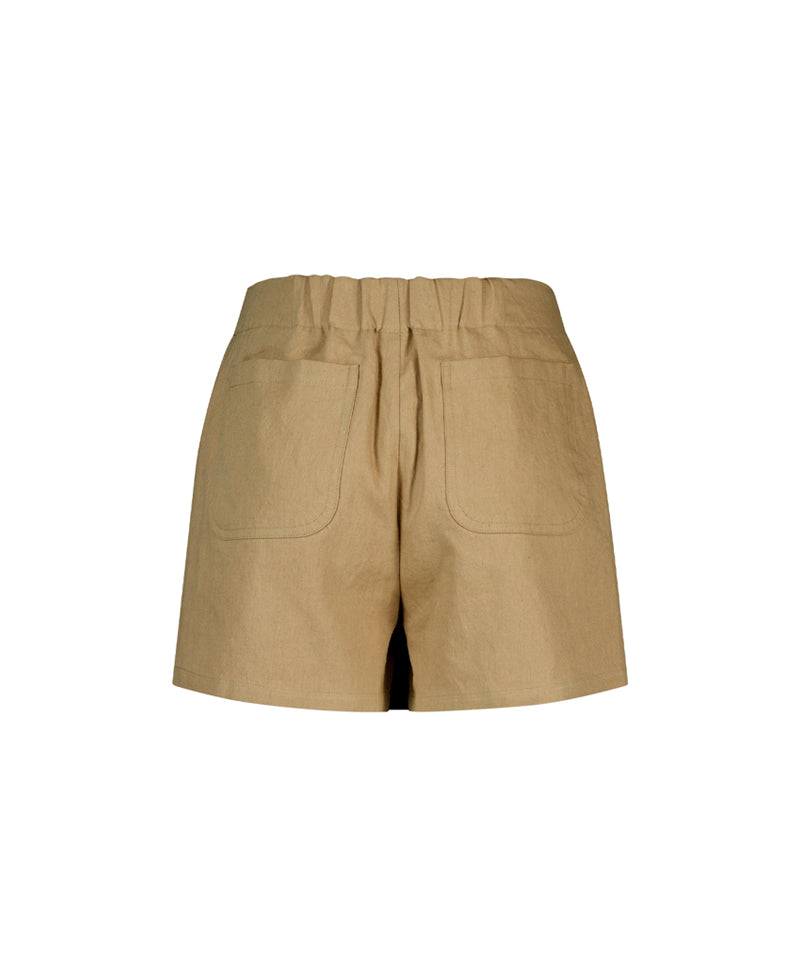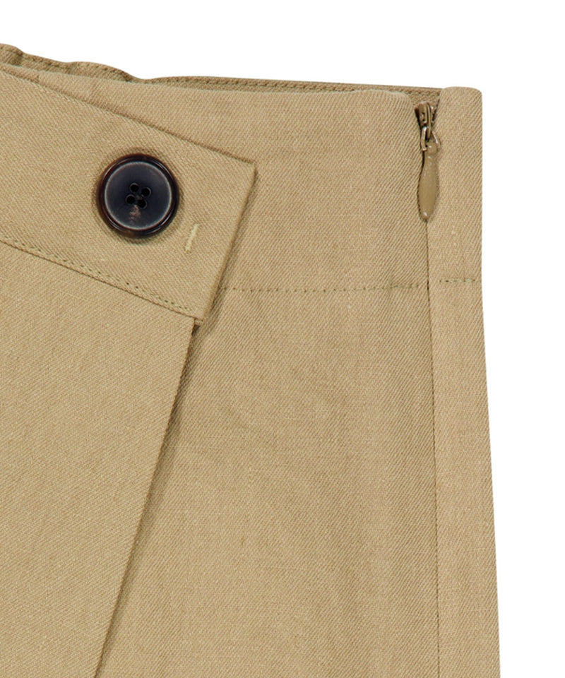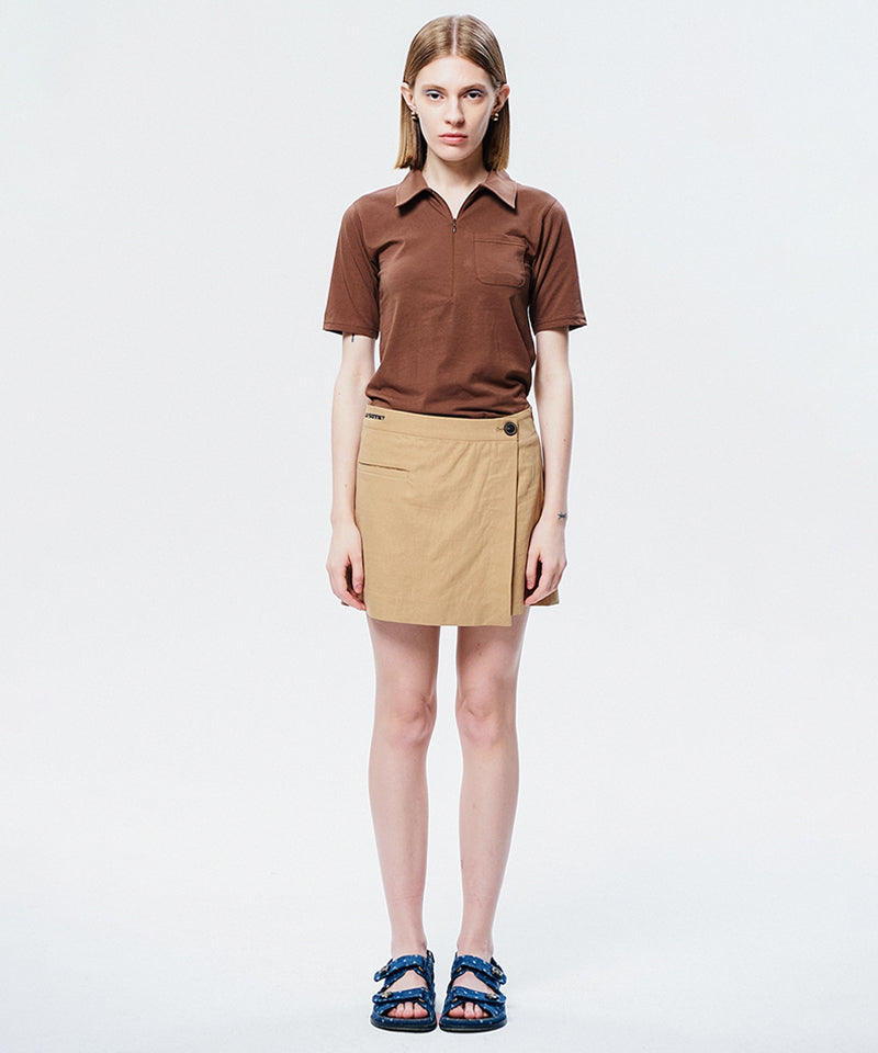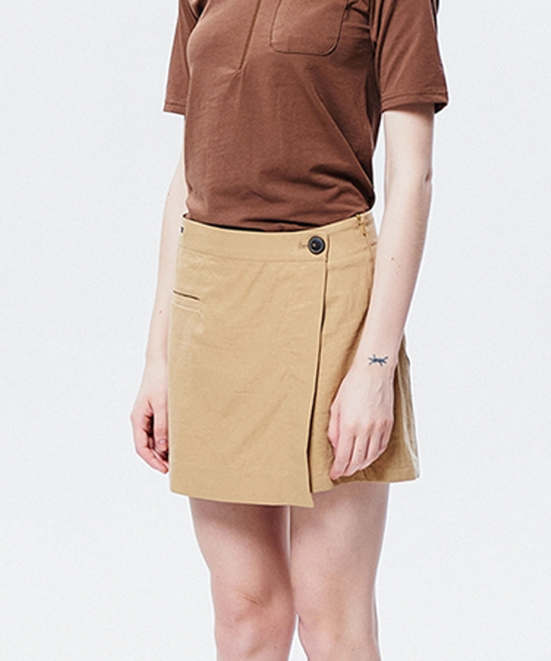 Short miniskirts can be burdensome in the summer, but short-shaped skirts are welcomed with open arms. The front part has the feel of a wrap skirt and the back part has the shape of shorts, allowing for a variety of looks. The minimalist design and color make it great to use as a base item. The waist banding makes it comfortable to wear.