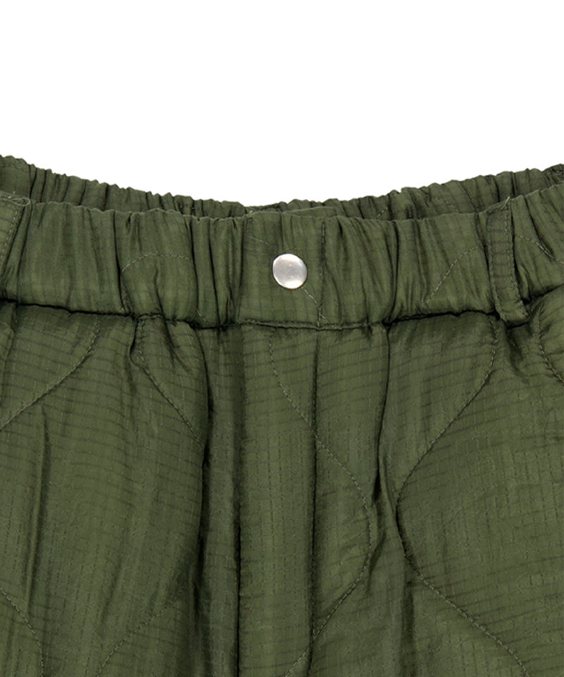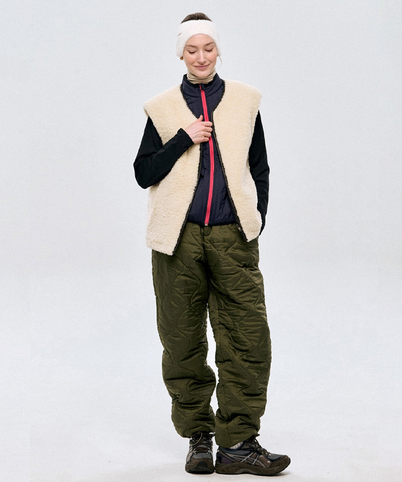 With its warm fleece lining and cotton quilting, it is a must-have item for the middle of winter. Compared to a blouson, the amount of cotton has been reduced to make it look slimmer, and the back pockets have been placed higher to make the legs look longer. It features comfortable wear with waist banding and ankle strings. It has been made with water-repellent fabric that does not absorb water and instead flows off like water droplets, increasing its usability.