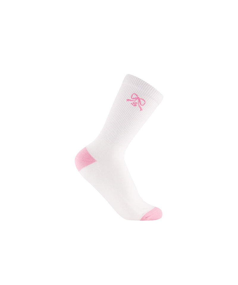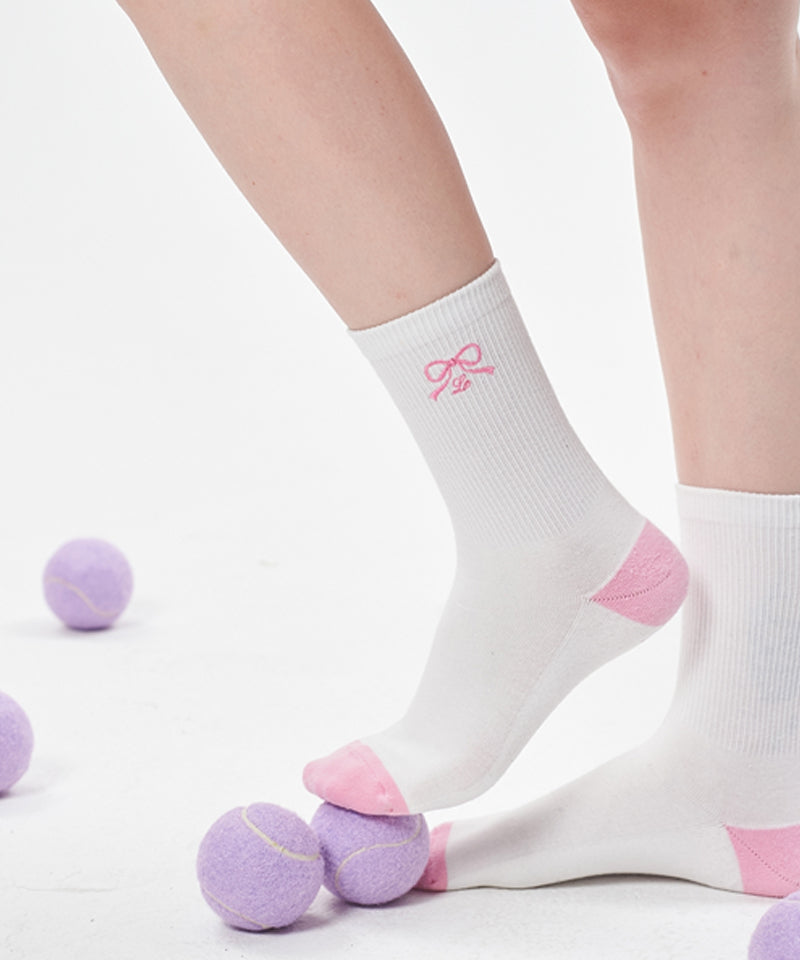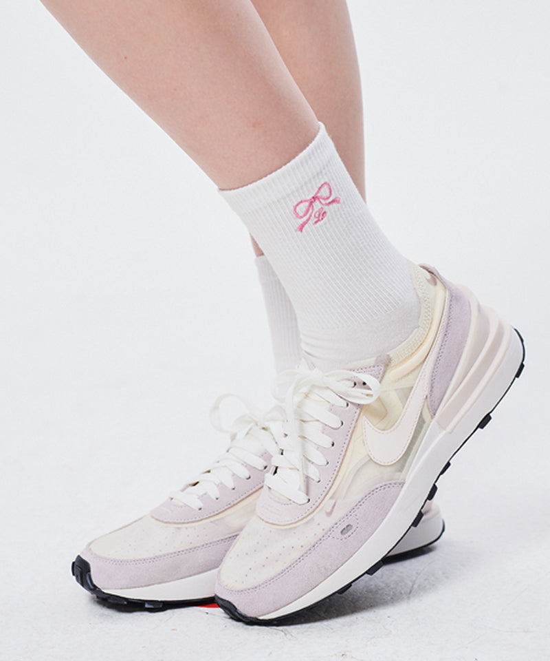 The ribbon embroidery alone creates a romantic atmosphere. The pink color scheme and ribbon embroidery on the forefoot and heel combine to create a balletcore look. Match it with flat shoes for a lovely look.