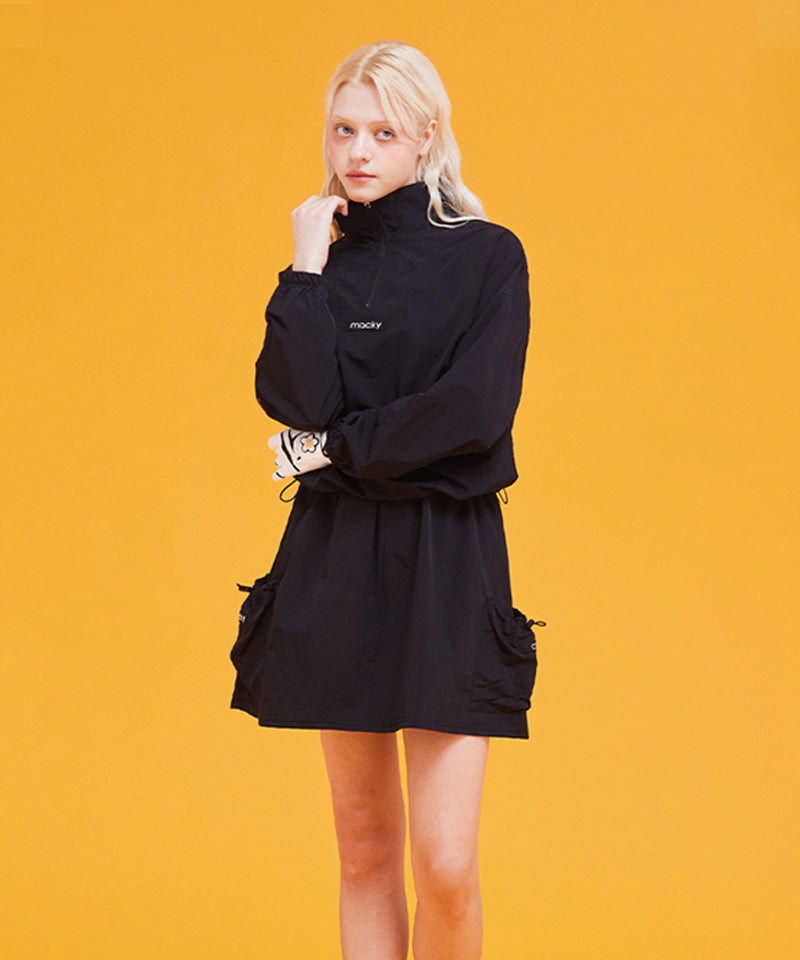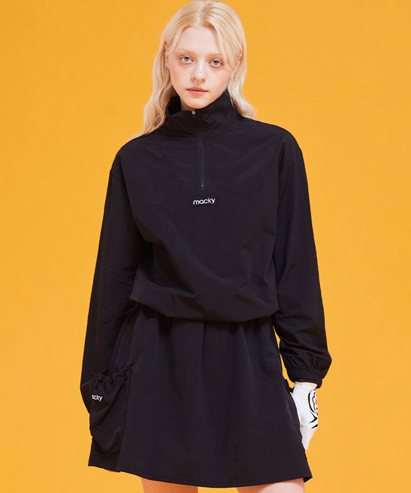 This patch sling zip-up anorak features Mackie patch embroidery as a distinctive detail. It offers a stylish look whether worn alone or paired with a matching skirt. Although it has a loose fit, it can be styled in various ways thanks to the adjustable hem string. The anorak is both durable and lightweight, with a soft touch for added comfort.