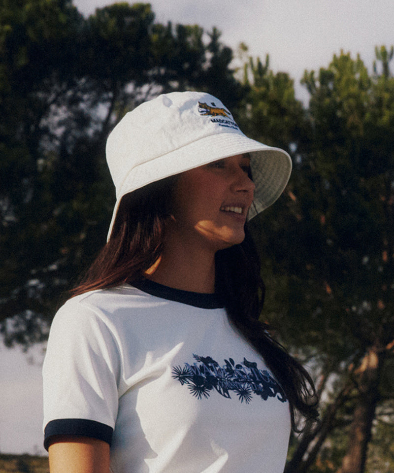 This sun visor features a tone-on-tone logo artwork. It has a detachable ribbon and a strap for easy size adjustment, and the moisture-absorbing pad on the forehead ensures a comfortable fit even when worn for long periods of time in hot weather.