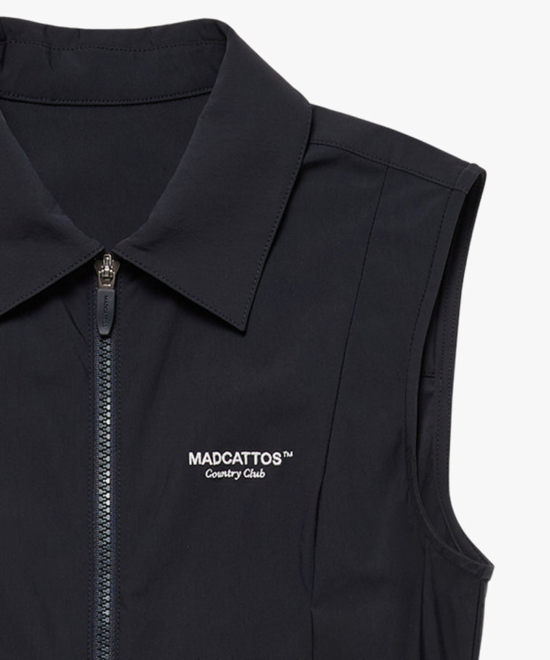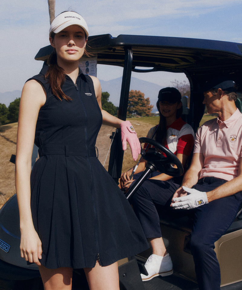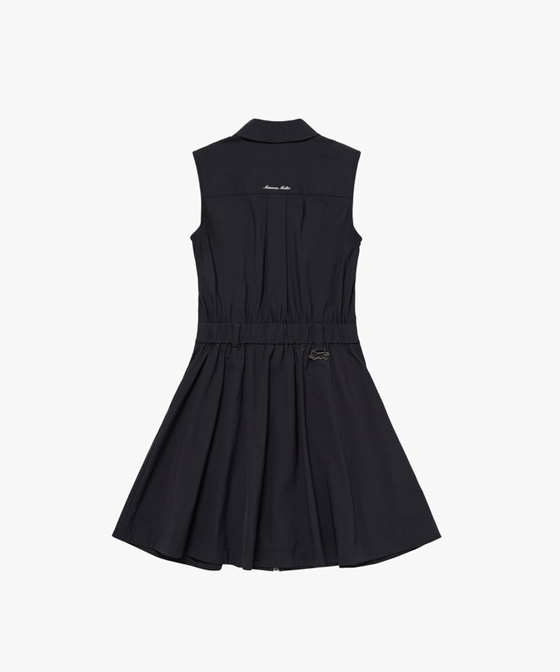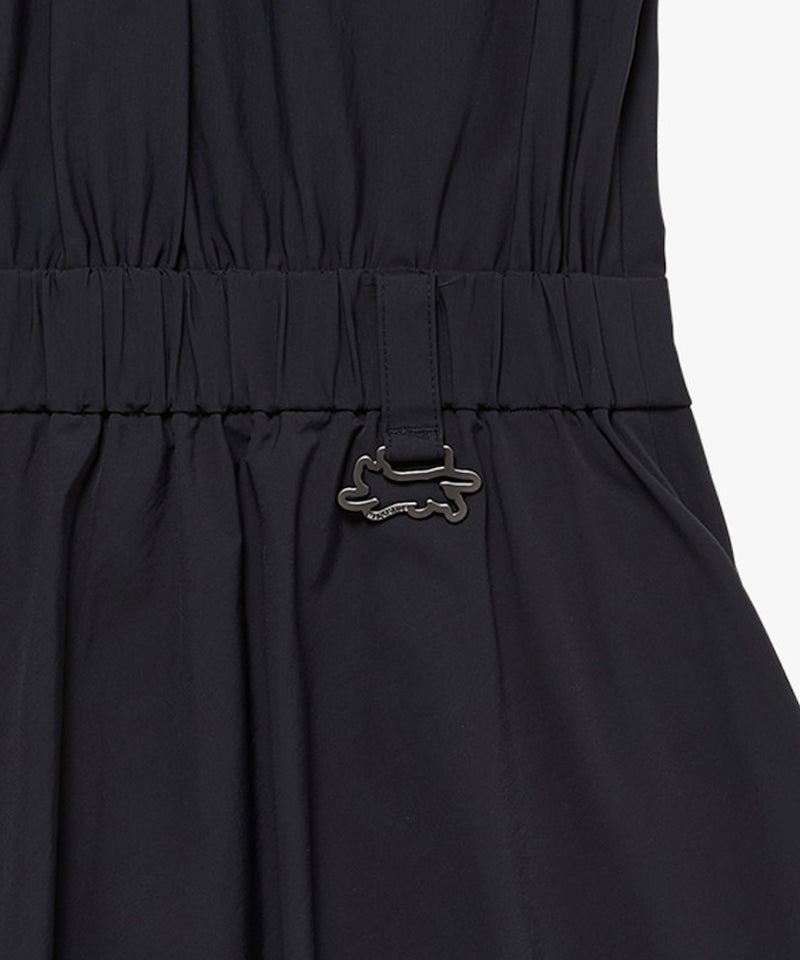 This full-zip collar one-piece dress is crafted from 4-way stretch tricot material with a water-repellent function, offering excellent moisture absorption and quick-drying capabilities for a comfortable playing experience. The waistband detail creates a slim silhouette, while the loose fit at the bottom adds a feminine touch. Contrasting logo embroidery on the front and back enhances the design, and detachable underwear is also provided for added convenience.