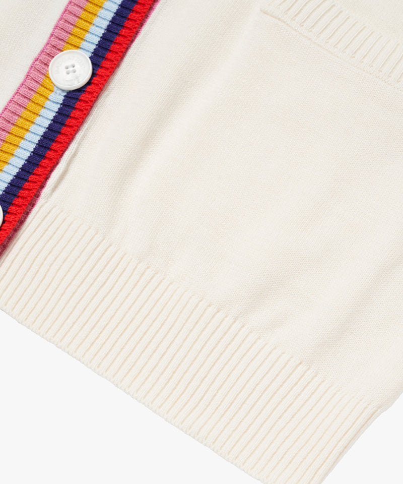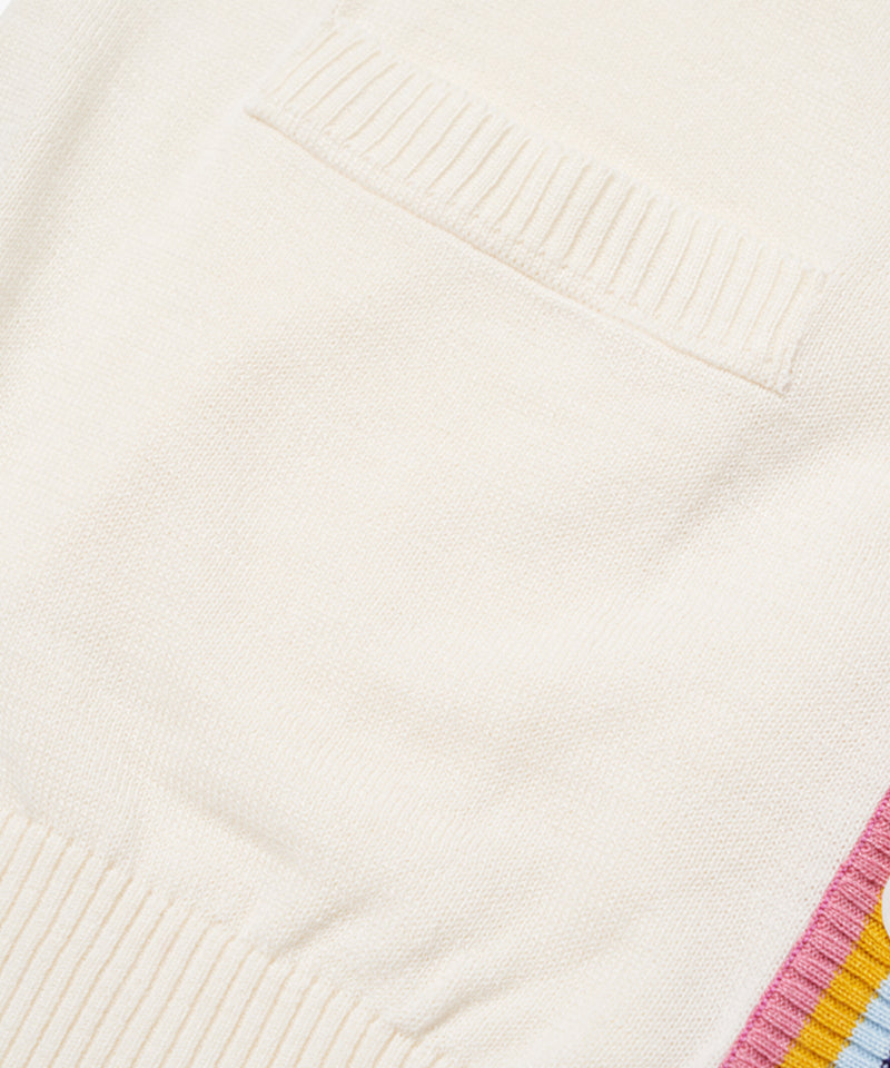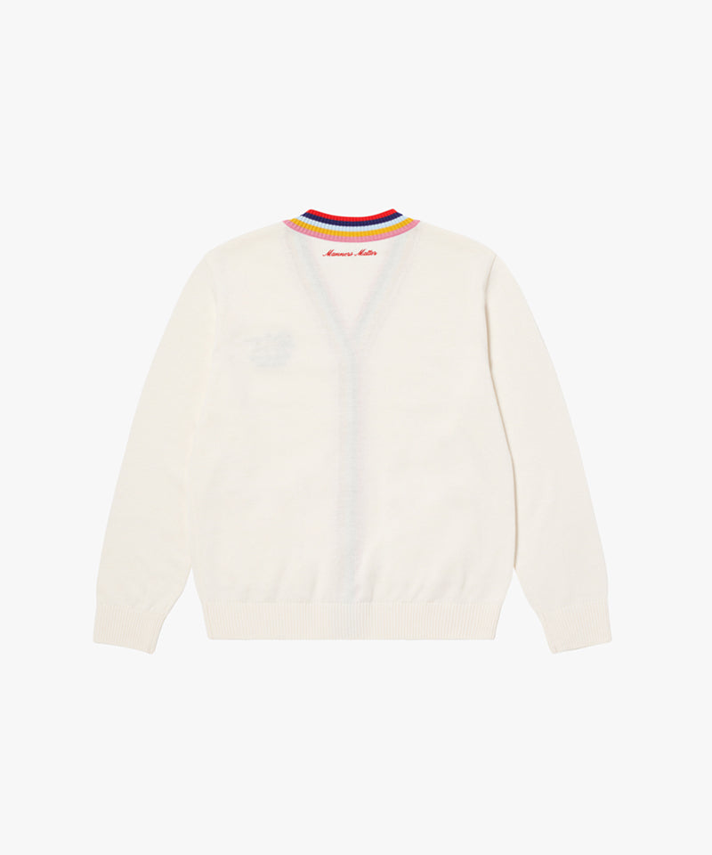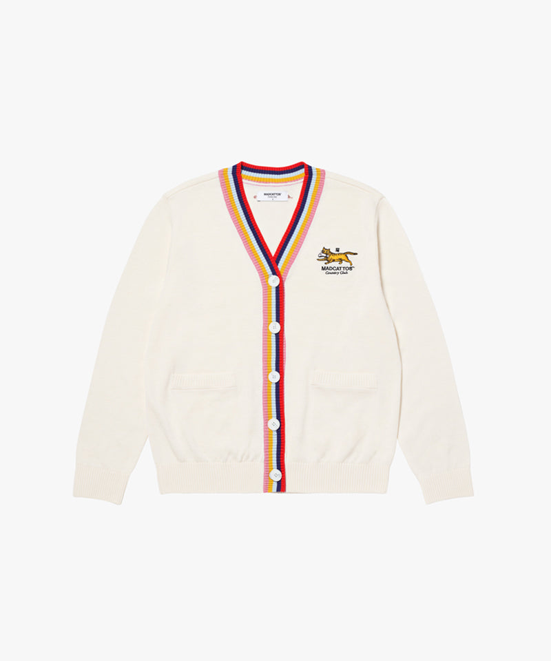 This is a knit cardigan with a color blocking detail on the lip. You can feel the identity of Madcatos with the Migo artwork on the front and the text logo on the back