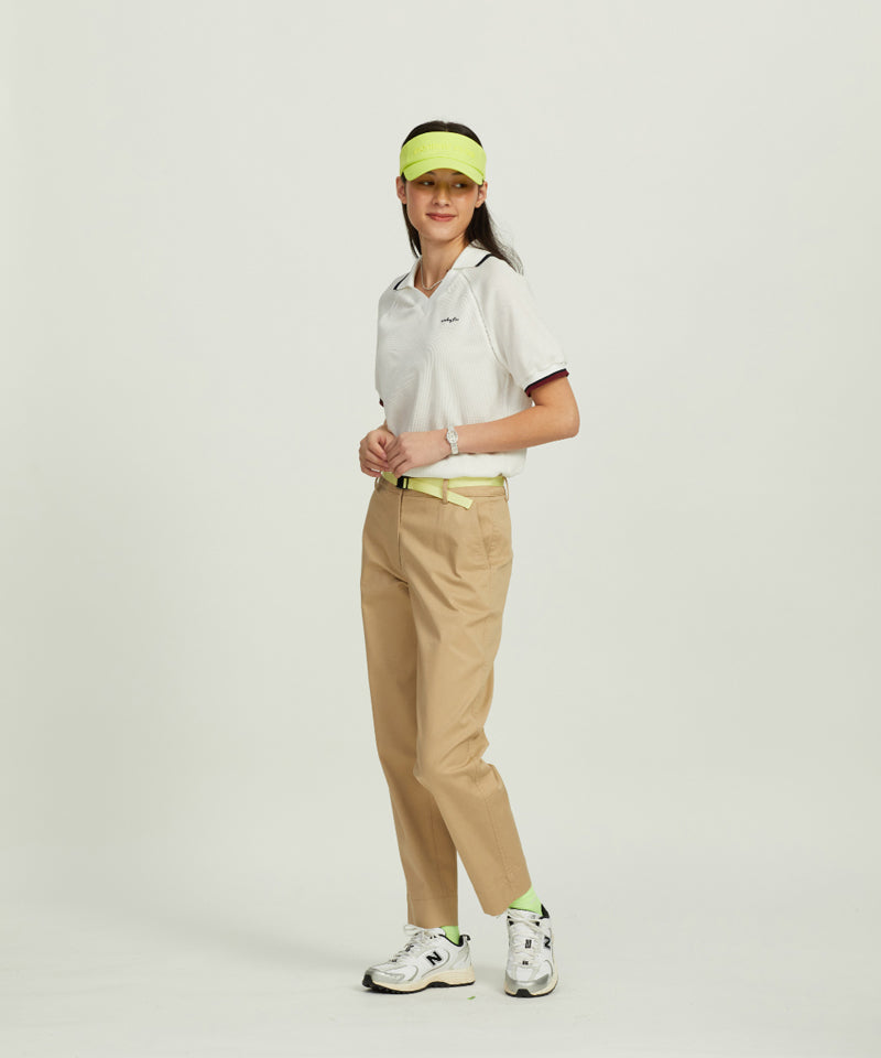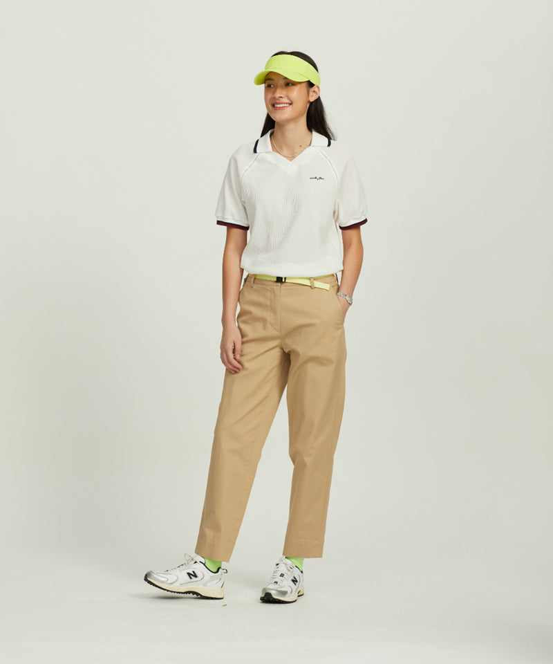 Made with expensive imported cotton elastic material unlike regular cotton, the surface feel and touch are exceptionally soft and luxurious. It has a little bit of elasticity so it is comfortable to wear. Even if worn for a long time, the fabric does not deteriorate much and the quality is maintained. Classic yet witty cotton chino pants. Complete your golf look with comfort, luxury and sophistication.