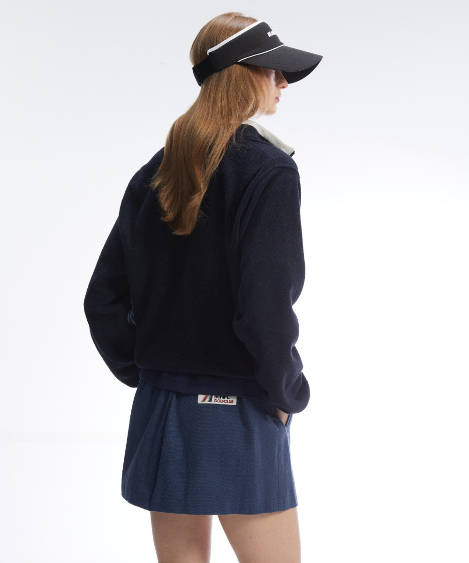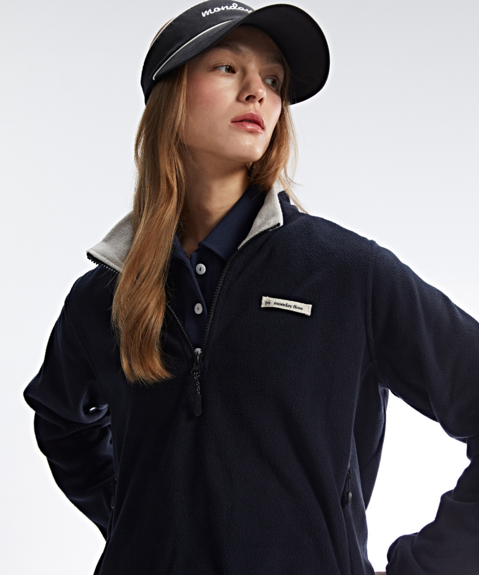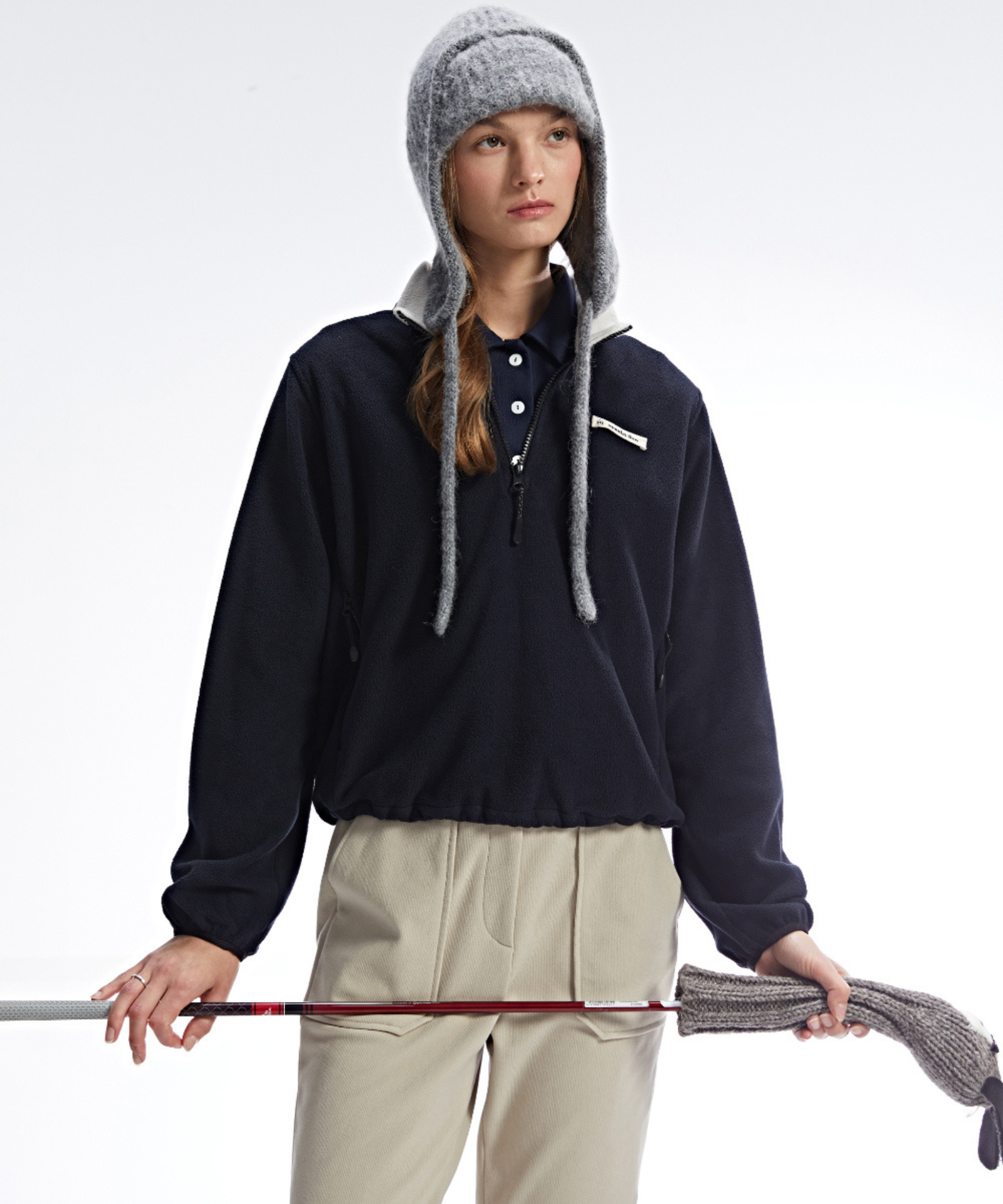 Lightweight fleece half-zip top in dark navy with a tailored, voluminous fit. Features a side zipper pocket, adjustable drawstring hem, and elasticated sleeve cuffs for versatile layering or standalone wear. Crafted from a premium, pill-resistant fleece blend with smooth YKK hardware, this piece offers understated luxury and lasting quality.