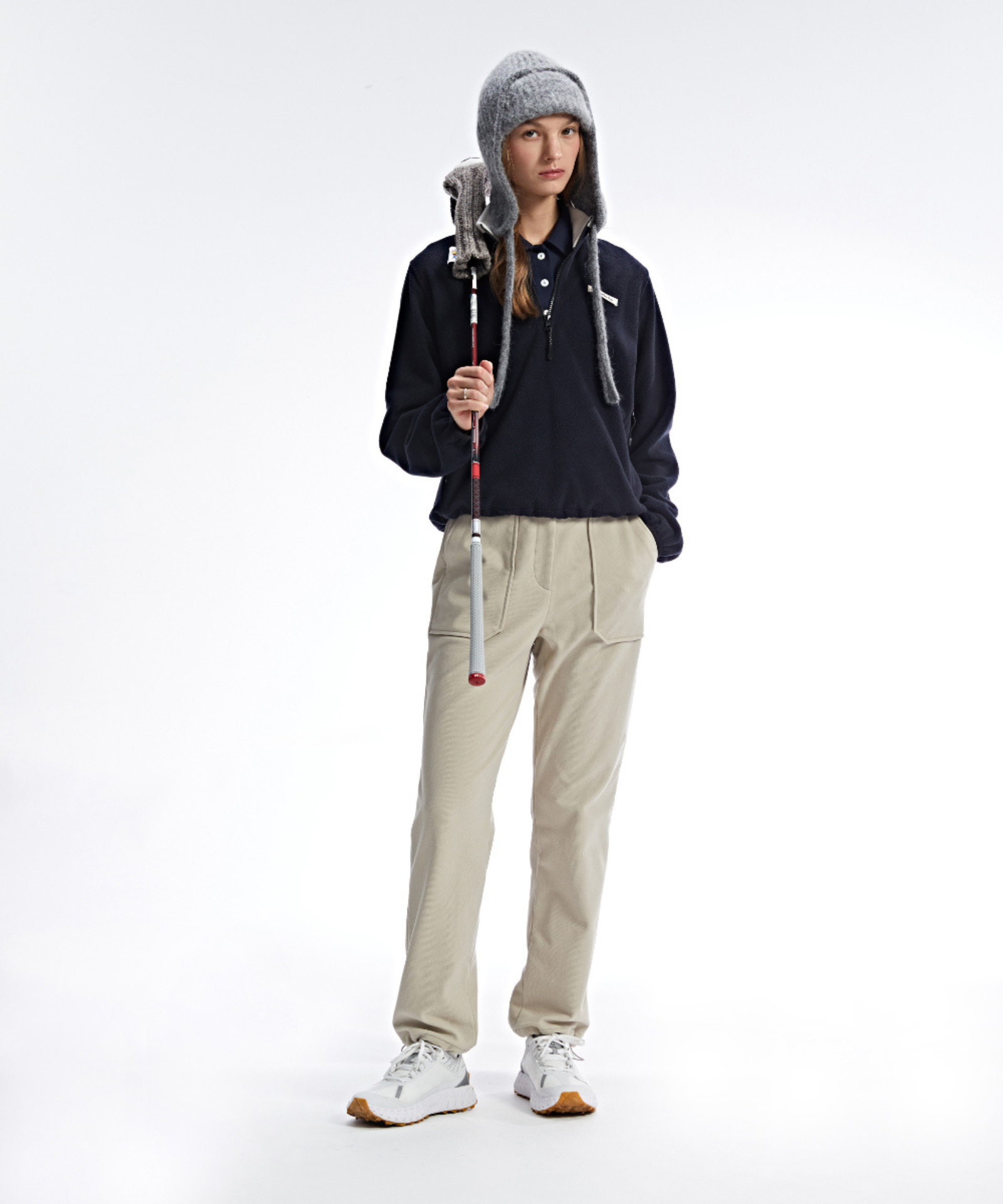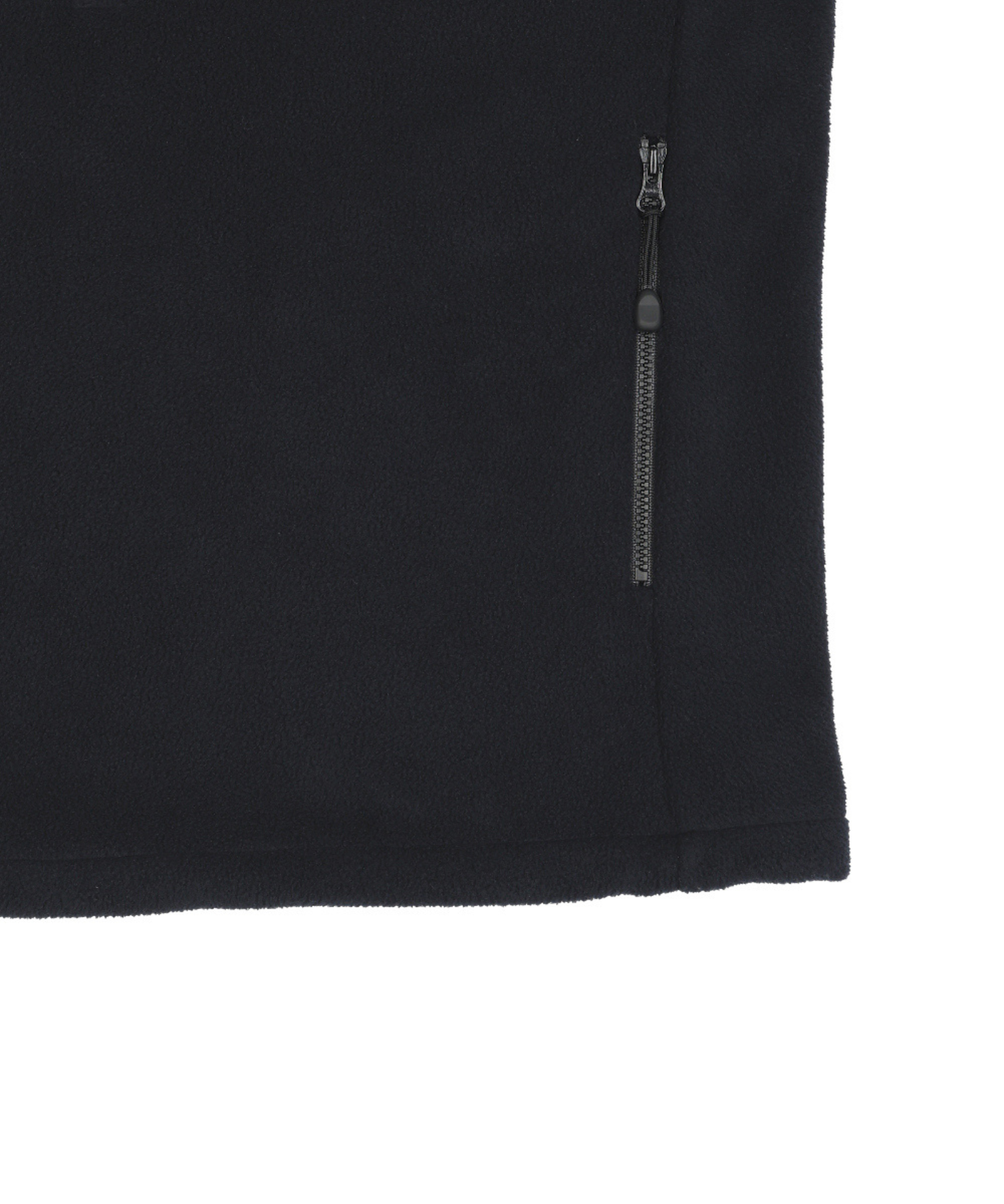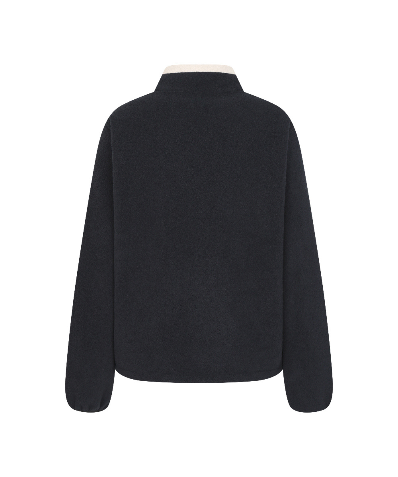 Lightweight fleece half-zip top in dark navy with a tailored, voluminous fit. Features a side zipper pocket, adjustable drawstring hem, and elasticated sleeve cuffs for versatile layering or standalone wear. Crafted from a premium, pill-resistant fleece blend with smooth YKK hardware, this piece offers understated luxury and lasting quality.