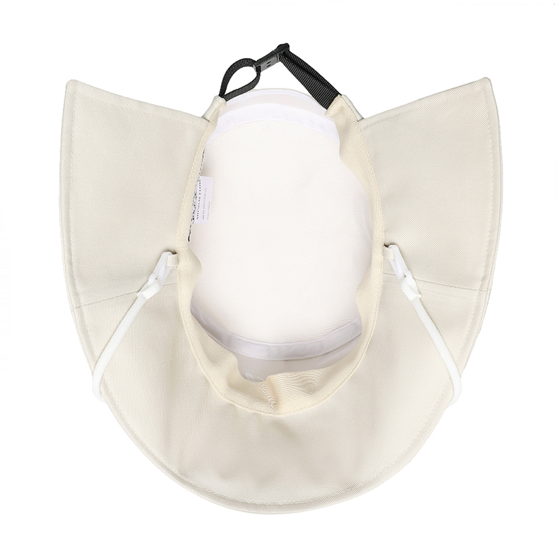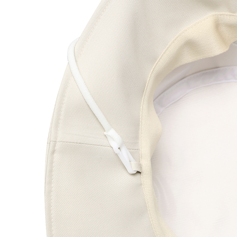 This light beige bucket hat features a wide brim that shields you from the sun while slimming your face. Its soft, feminine tone pairs effortlessly with any outfit. The brim extends from front to back for effective sun protection without blocking your view. Designed with a subtle sporty edge and a skin-toned inner brim to hide dirt, it blends style and practicality for a sophisticated, polished look.