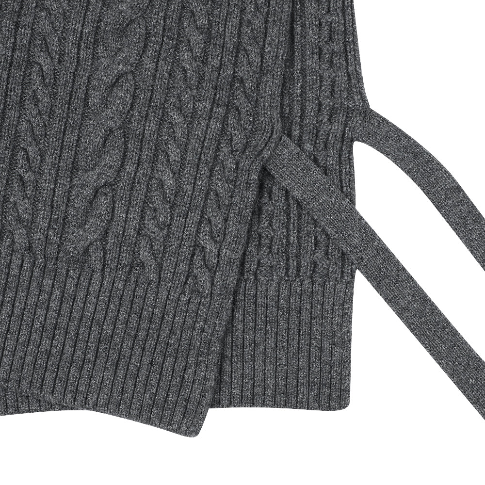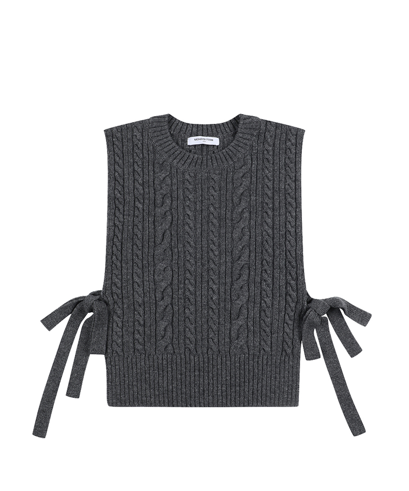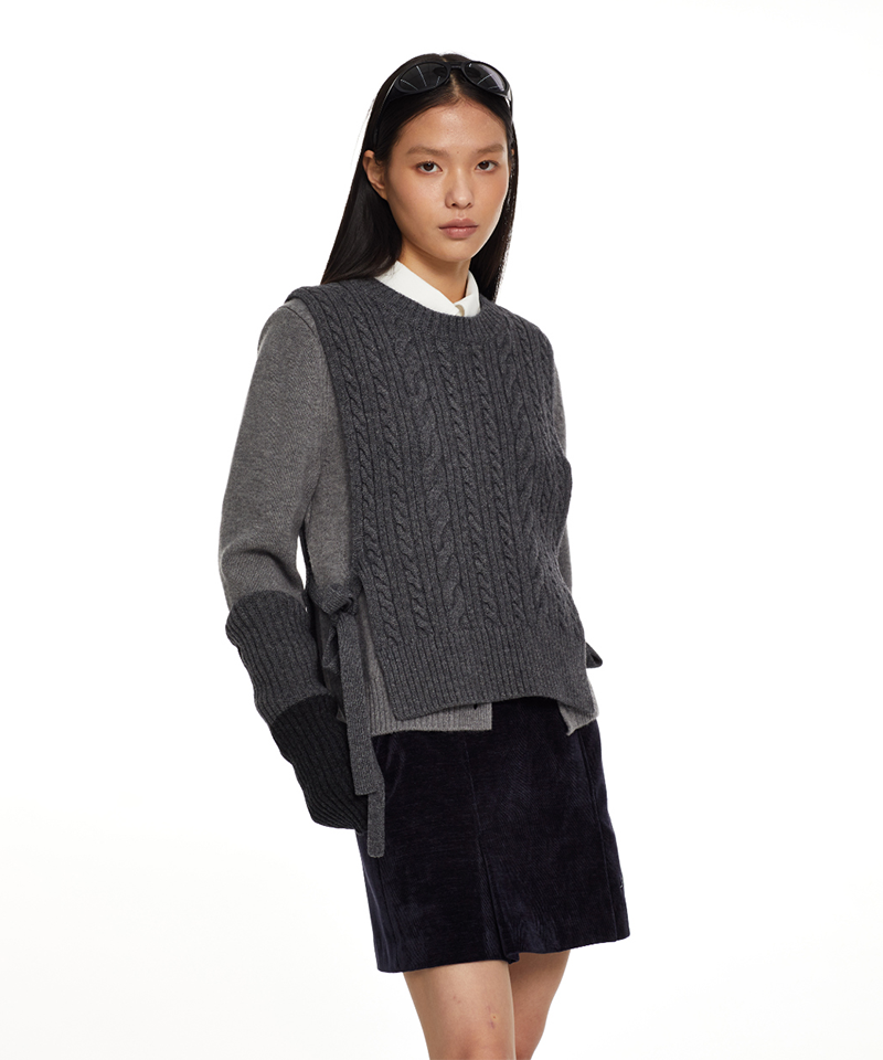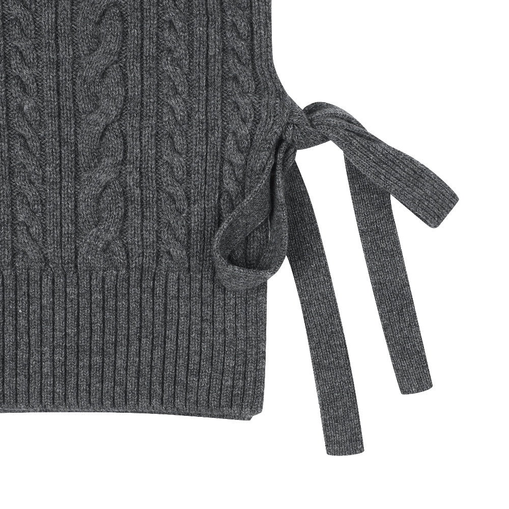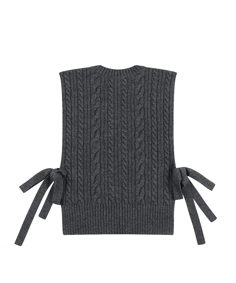 This is an open vest with a cable knit that gives it a classic and feminine feel.