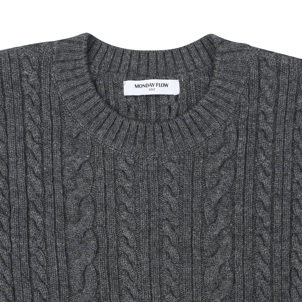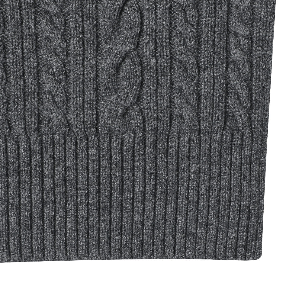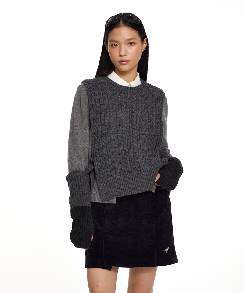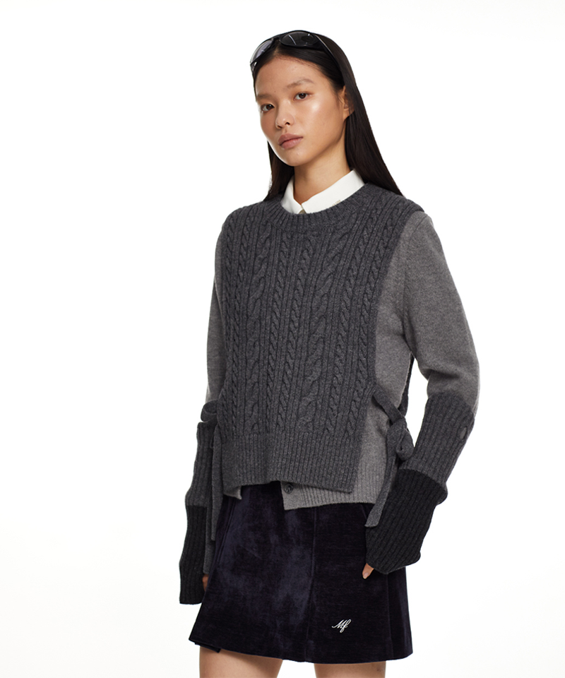 This is an open vest with a cable knit that gives it a classic and feminine feel.