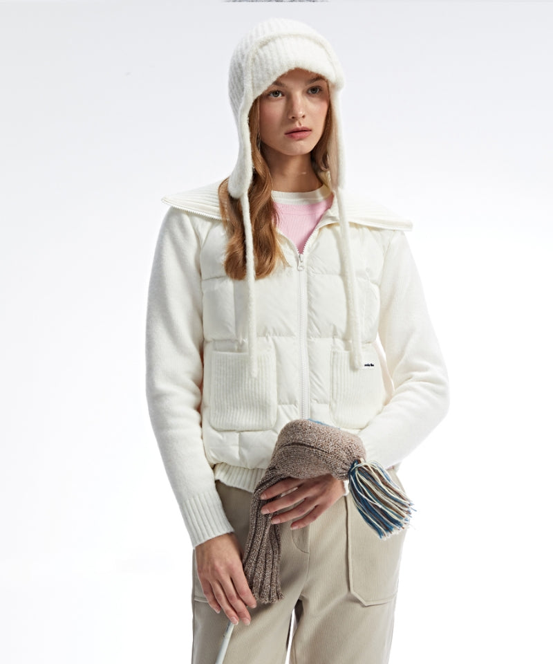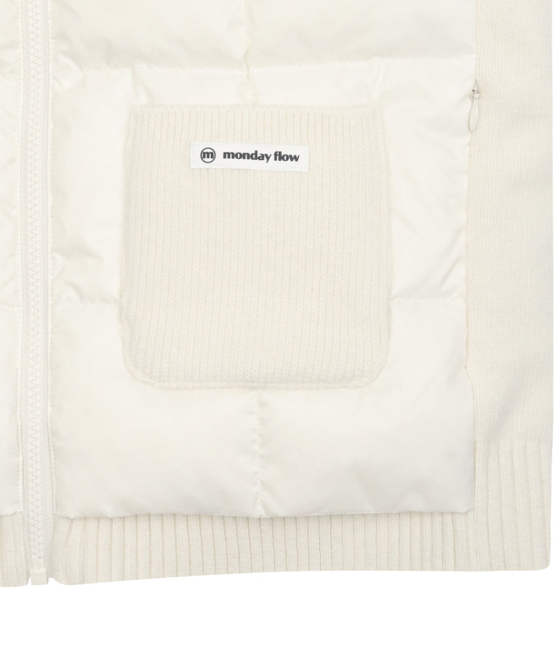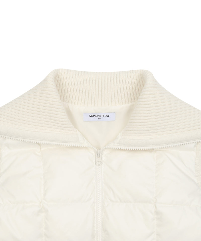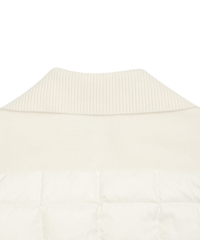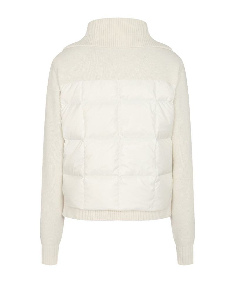 Monday Flow Urban Goose Padded Jumper in ivory combines Hungarian goose down with wool knit for lightweight warmth. The high collar provides adjustable neck coverage, while hidden zip pockets and knit pockets keep essentials secure. A smooth YKK zipper enables easy layering, and the refined silhouette transitions effortlessly from golf course to city streets. Durable and versatile, this sophisticated jumper is an essential seasonal layer.