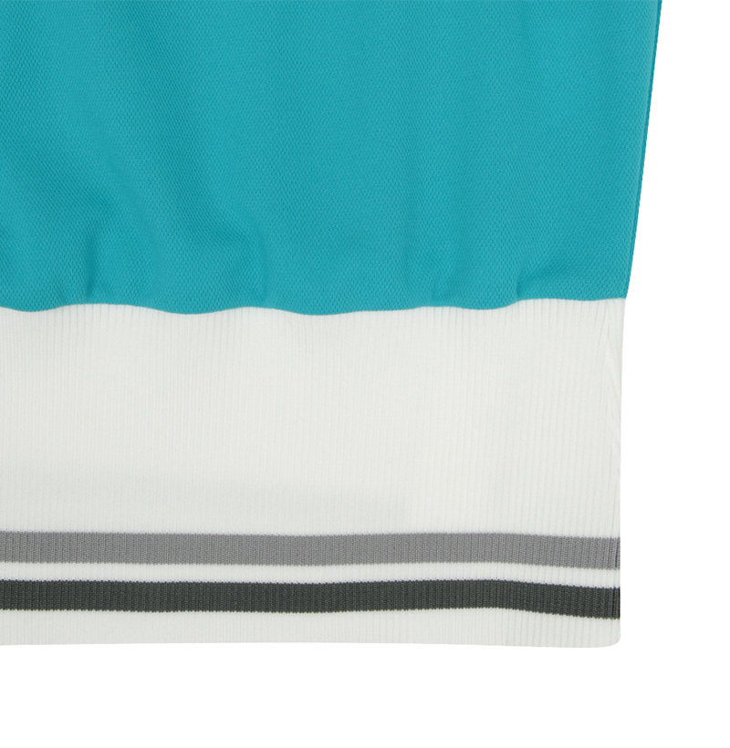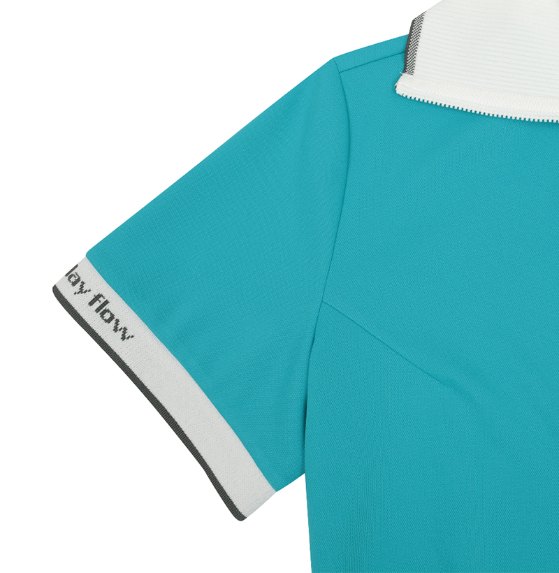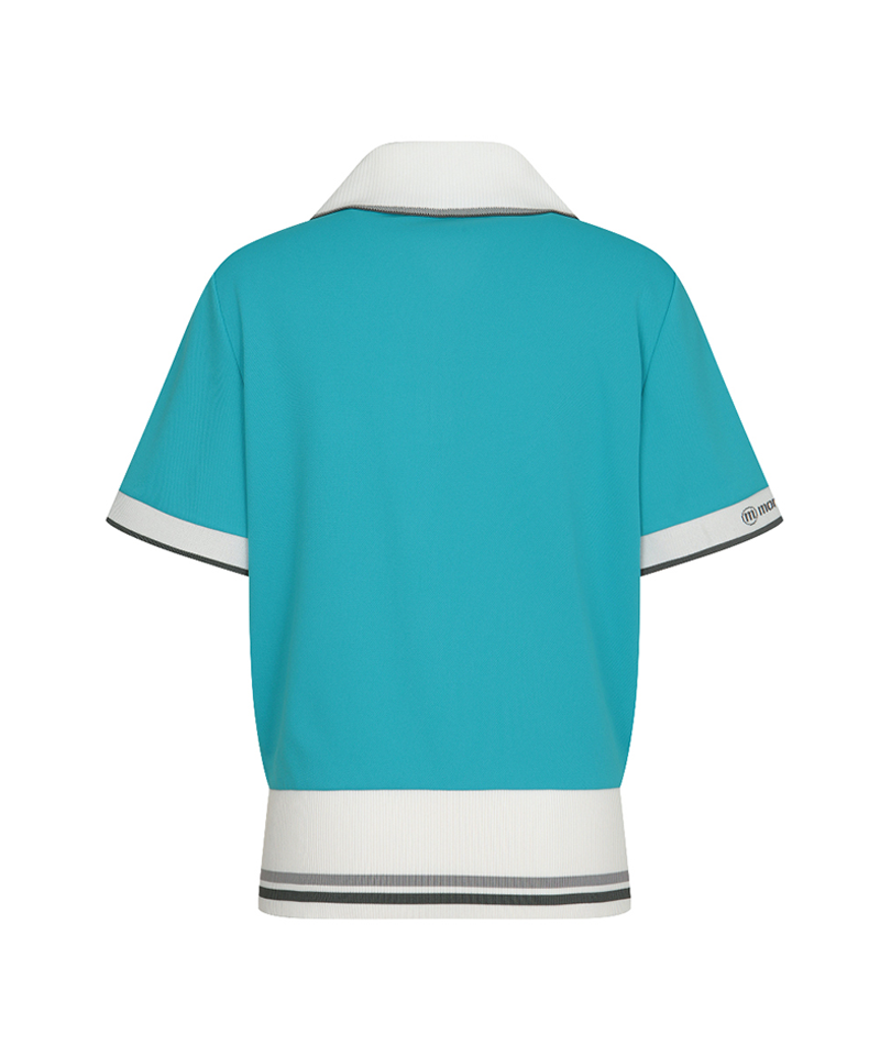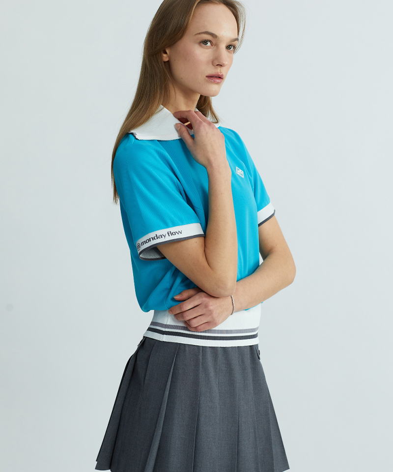 Featuring a wide collar and loose sleeves, this feminine yet sporty top creates a balanced shape that subtly makes the face appear smaller and the legs look longer. The striped color combination adds a refined athletic edge.
