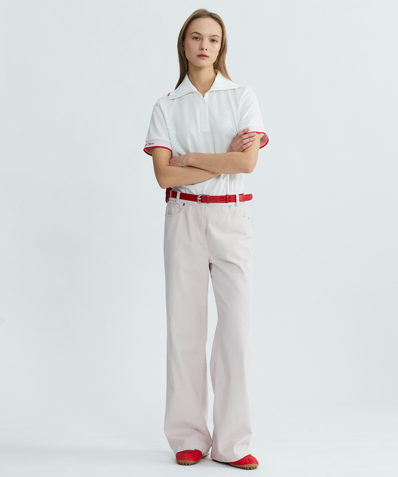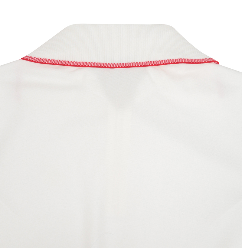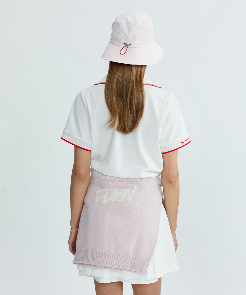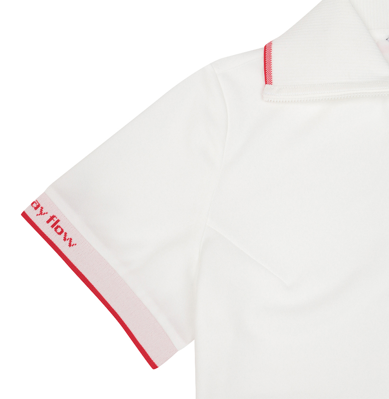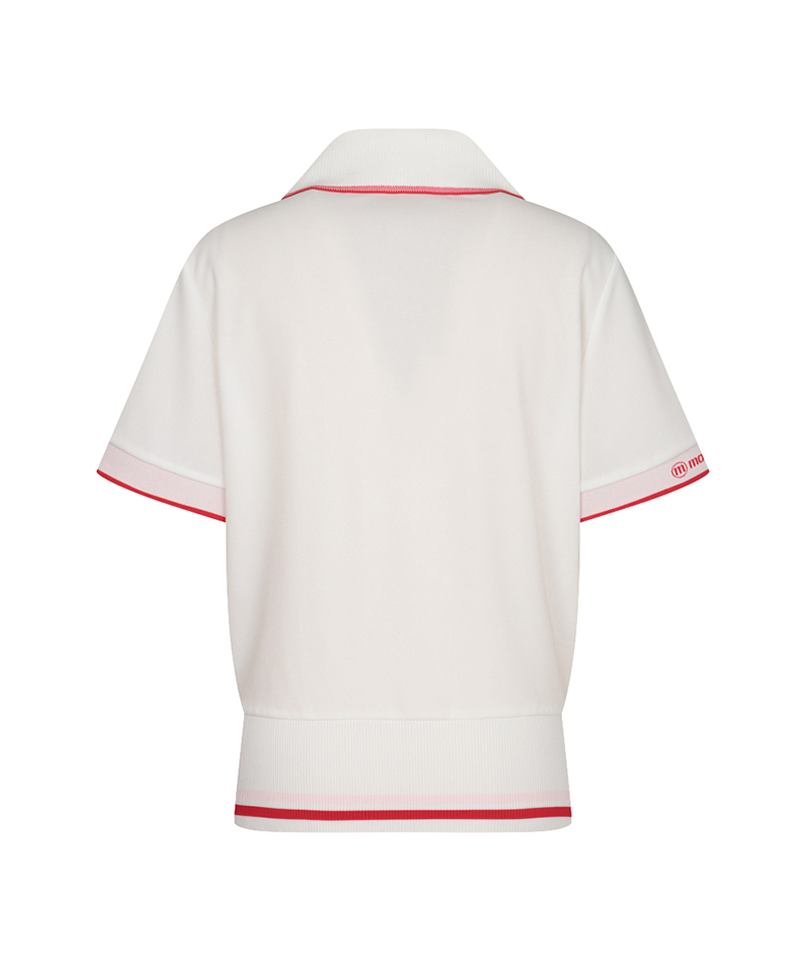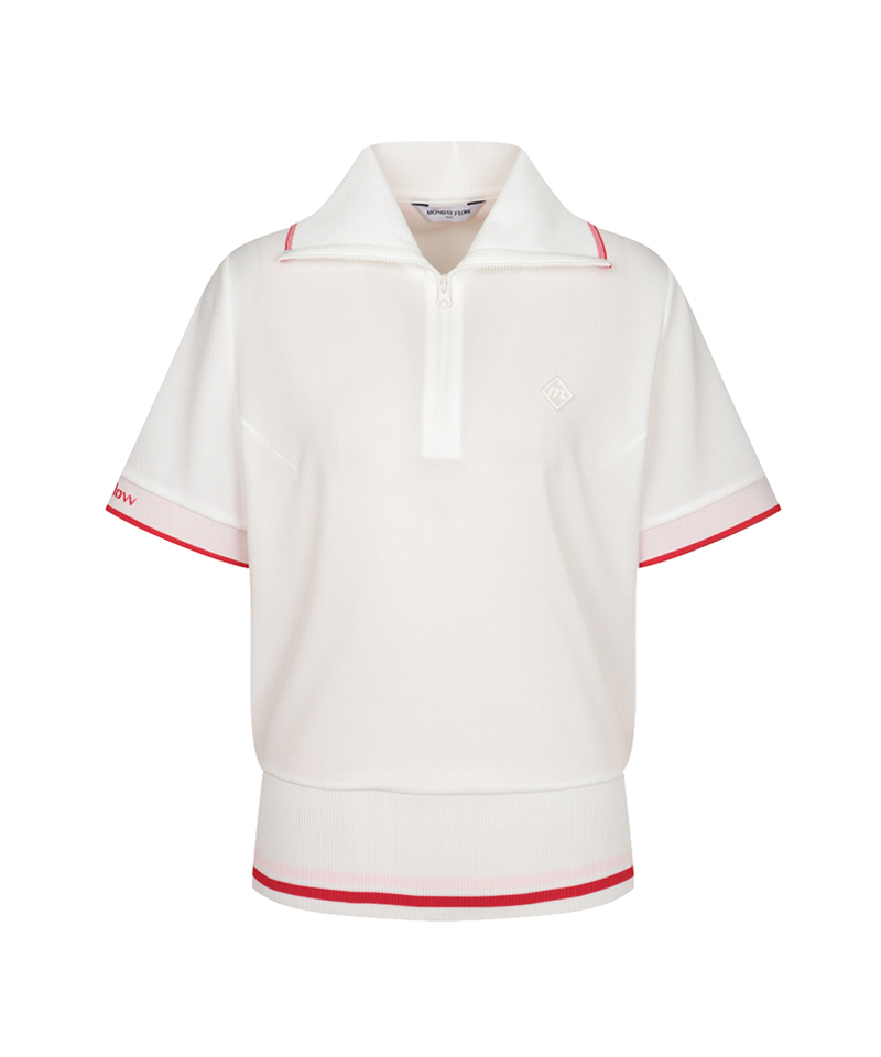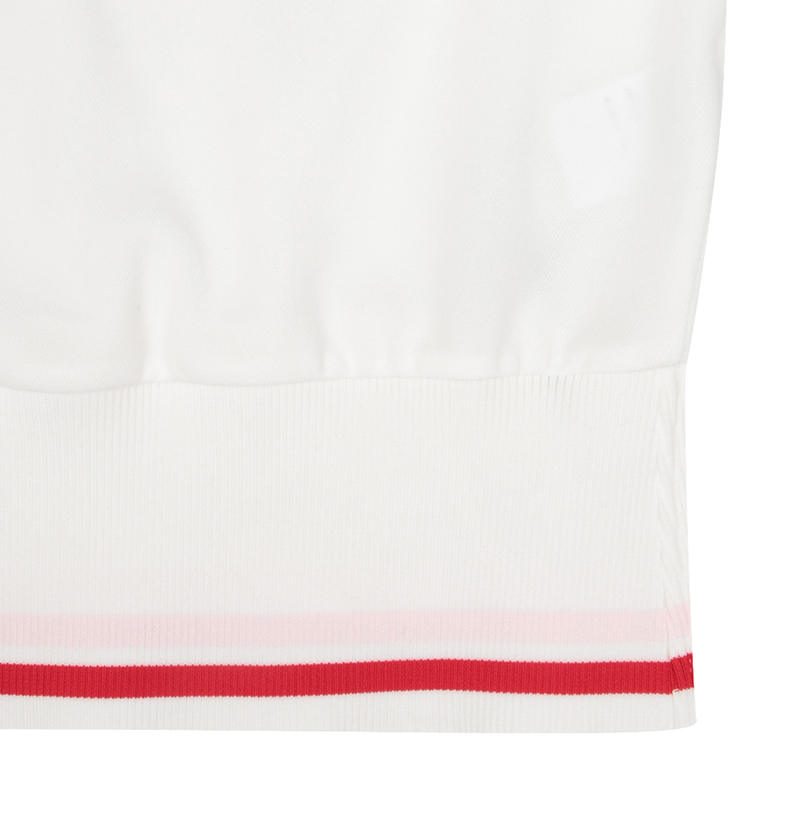 Featuring a wide collar and loose sleeves, this feminine yet sporty top creates a balanced shape that subtly makes the face appear smaller and the legs look longer. The striped color combination adds a refined athletic edge.