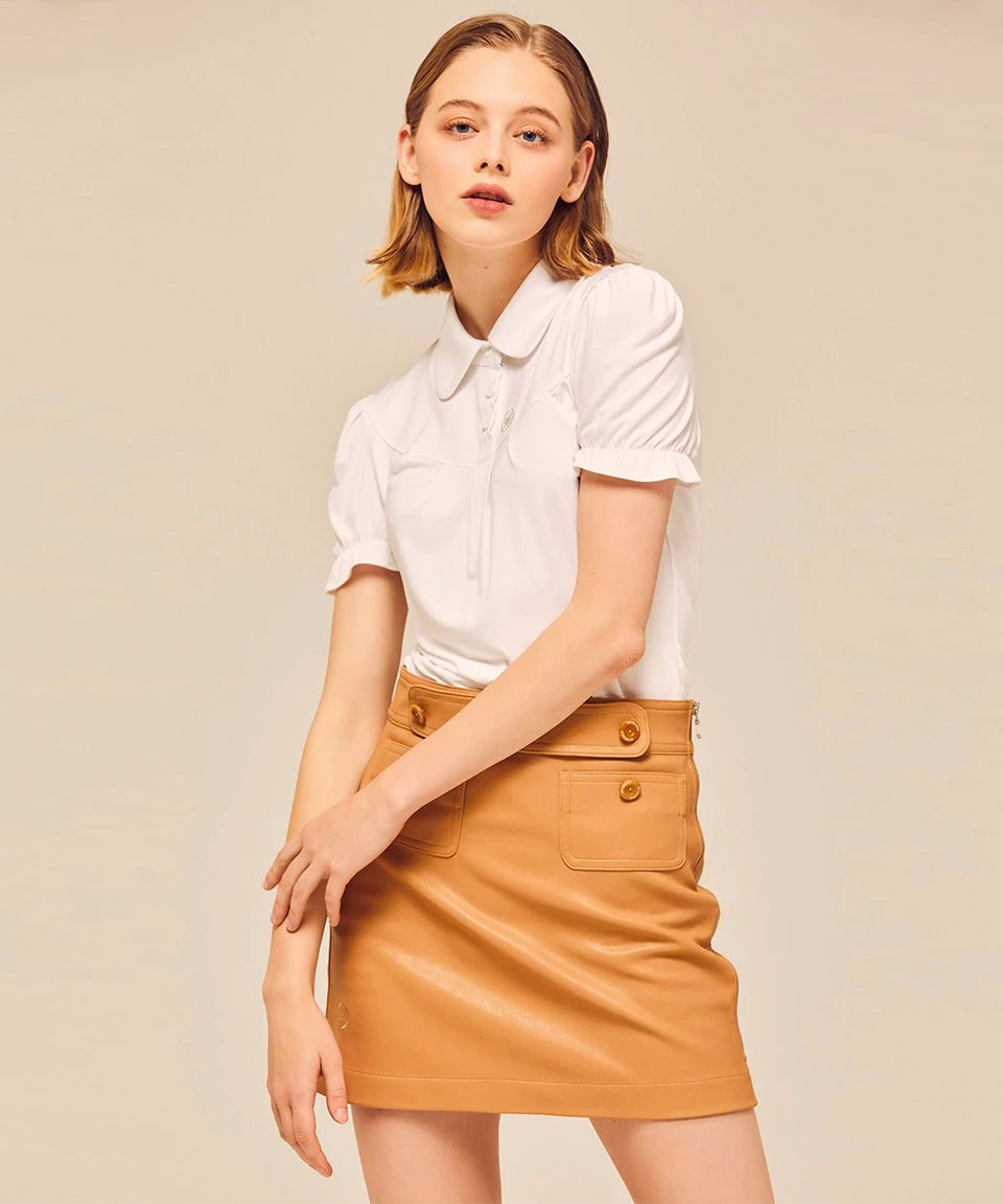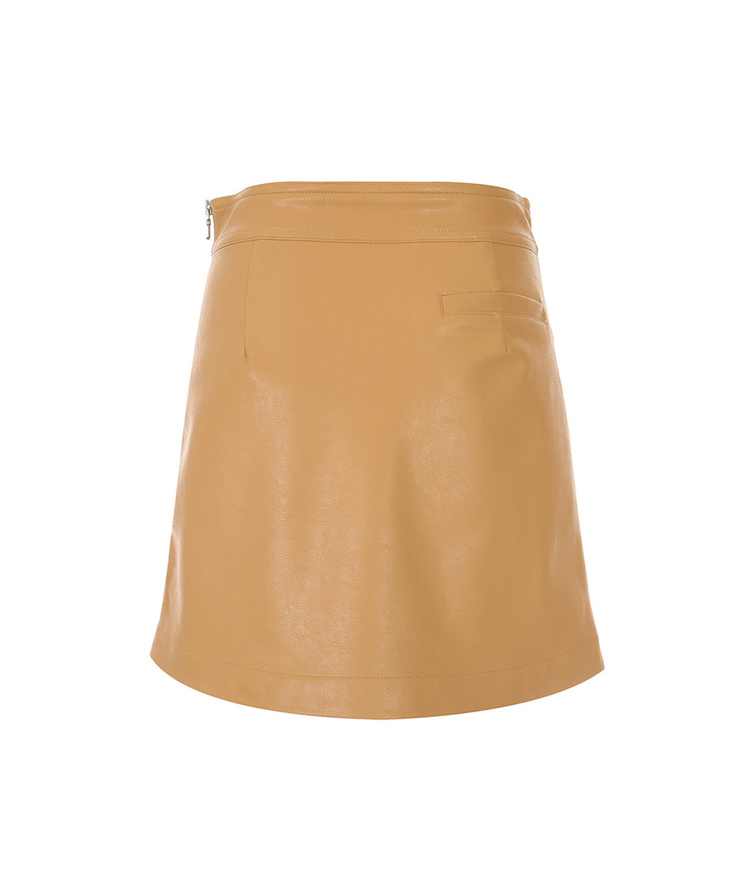 It is a leather material with a subtle luster. Boasts a solid and luxurious color feel. Stylish button details stand out. A unique mood can be produced with side zipper detail. Emphasizes the clean silhouette of the high-waisted A-line.