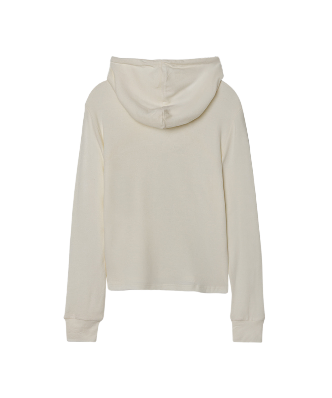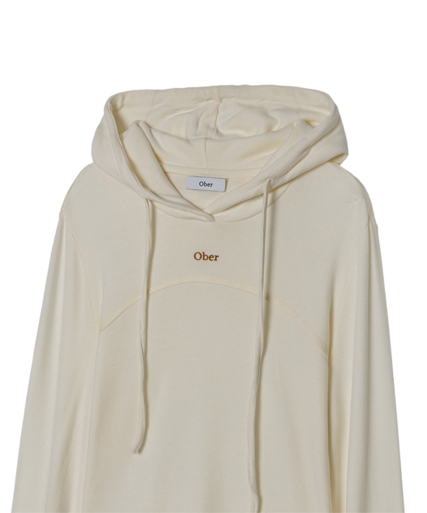 This ivory hooded top combines soft, smooth fabric with sporty comfort and excellent stretch for easy movement. Thumb holes extend hand coverage to protect from UV rays, while a small embroidered Ober logo adds a refined detail. Its versatile design suits both layering and standalone wear, perfect for fall, winter, and everyday use.