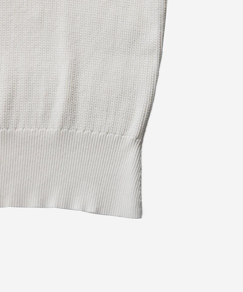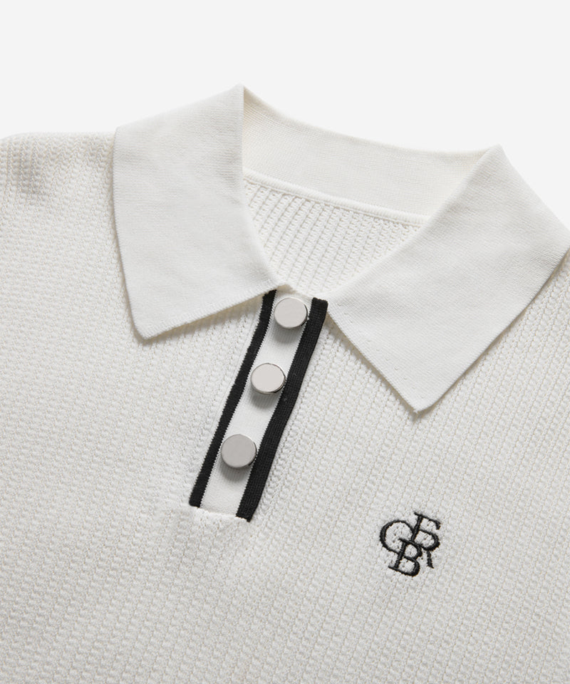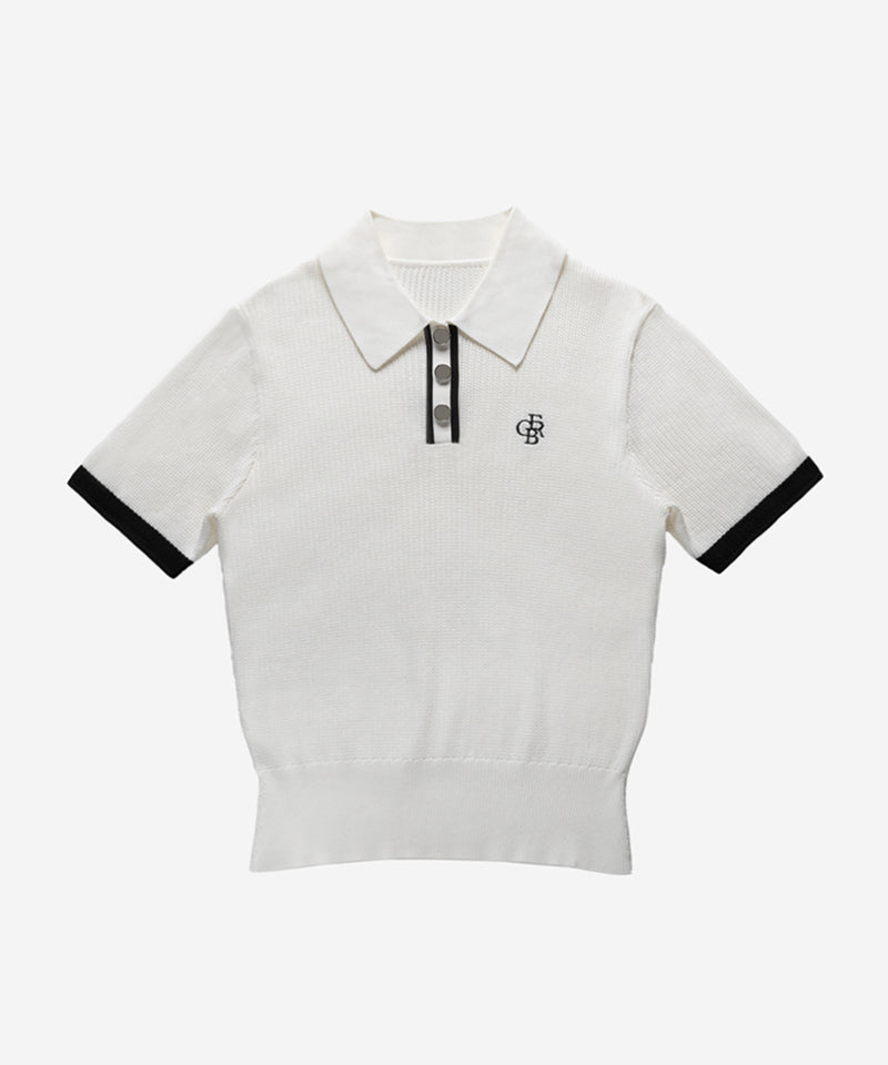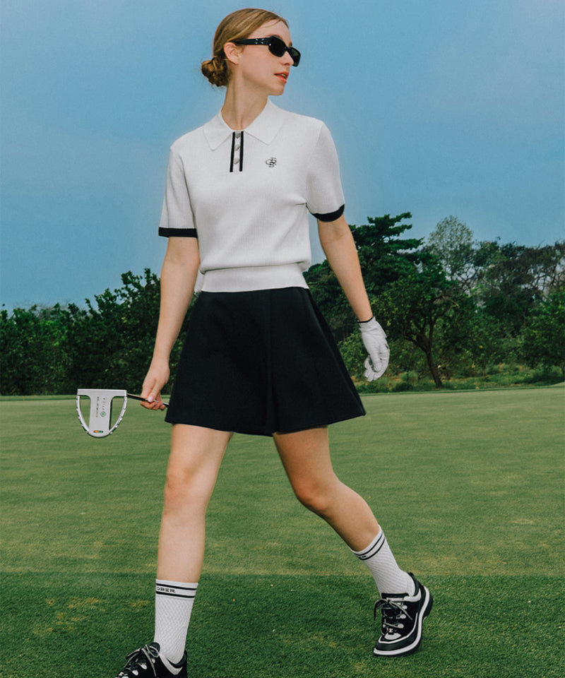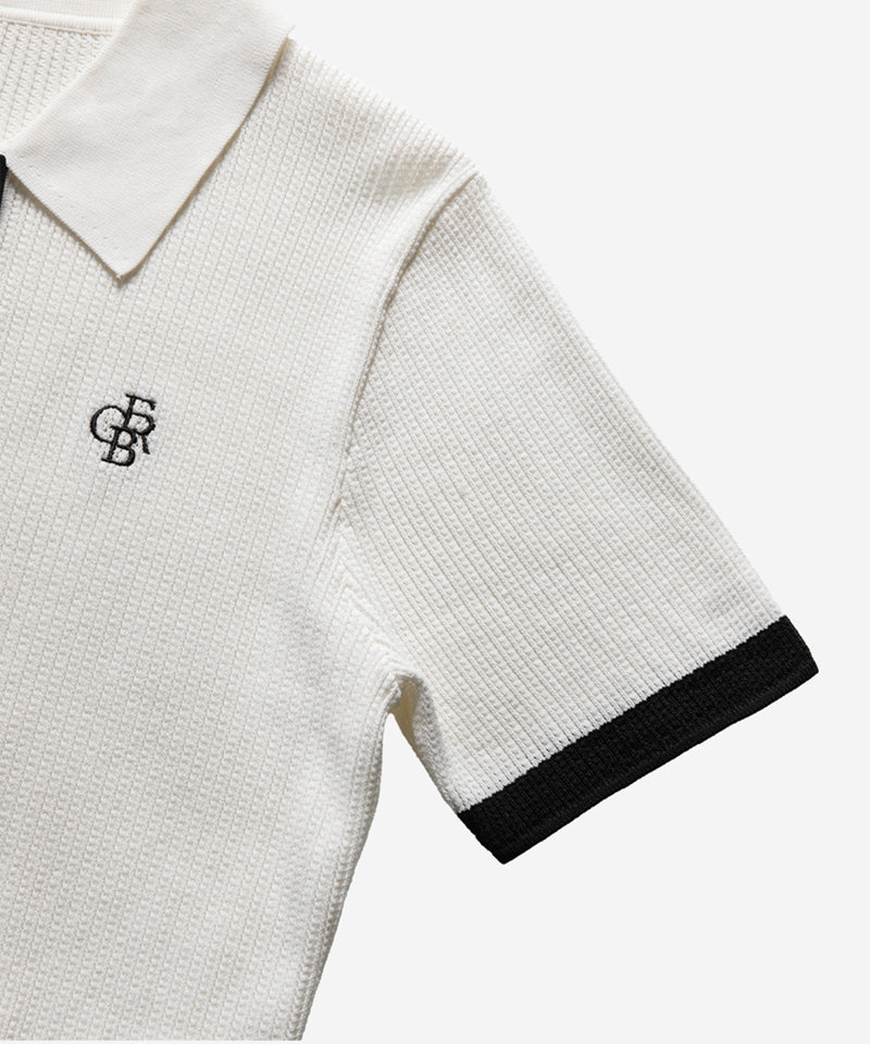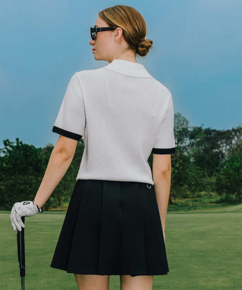 This short-sleeved knit features a shirt collar design and is made from a cool-touch summer yarn blend, perfect for warm-weather styling. The luxurious skasi knit texture adds a unique and refined touch, while the color contrast on the front and sleeve hems brings a subtle yet stylish point of interest. The Over logo embroidery on the front enhances brand identity. With its loose, comfortable fit and classic design, this knit is ideal for creating timeless looks—suitable for both golf and everyday wear.