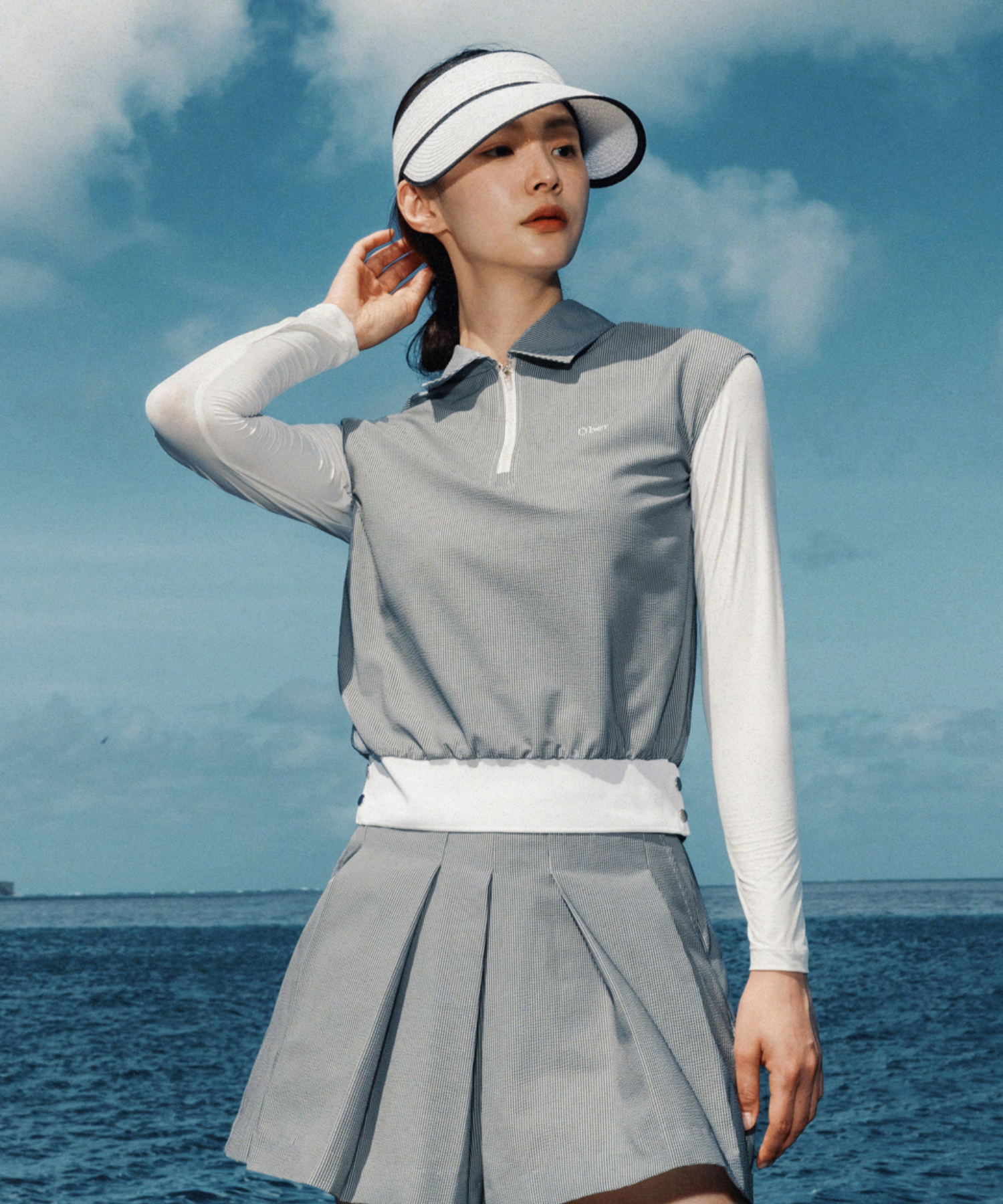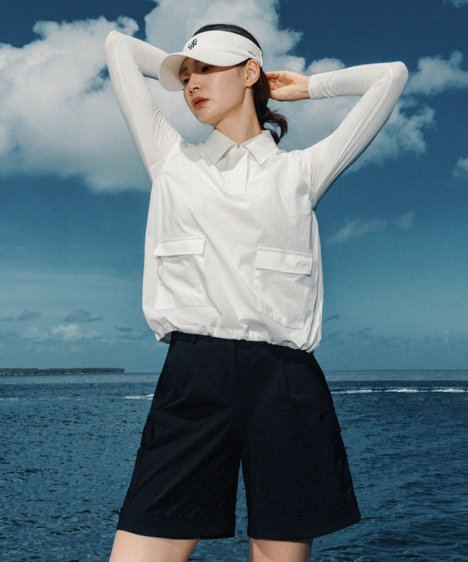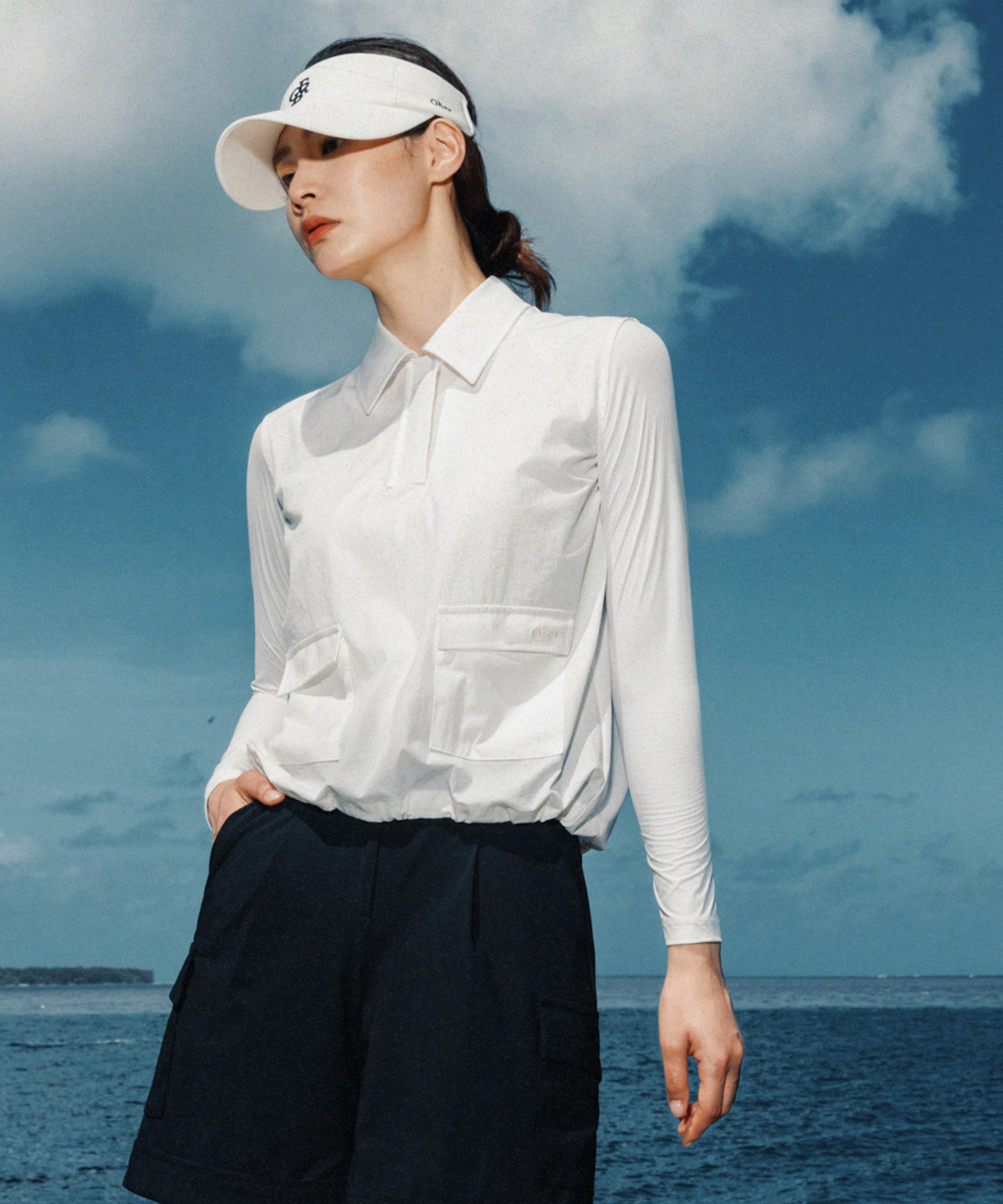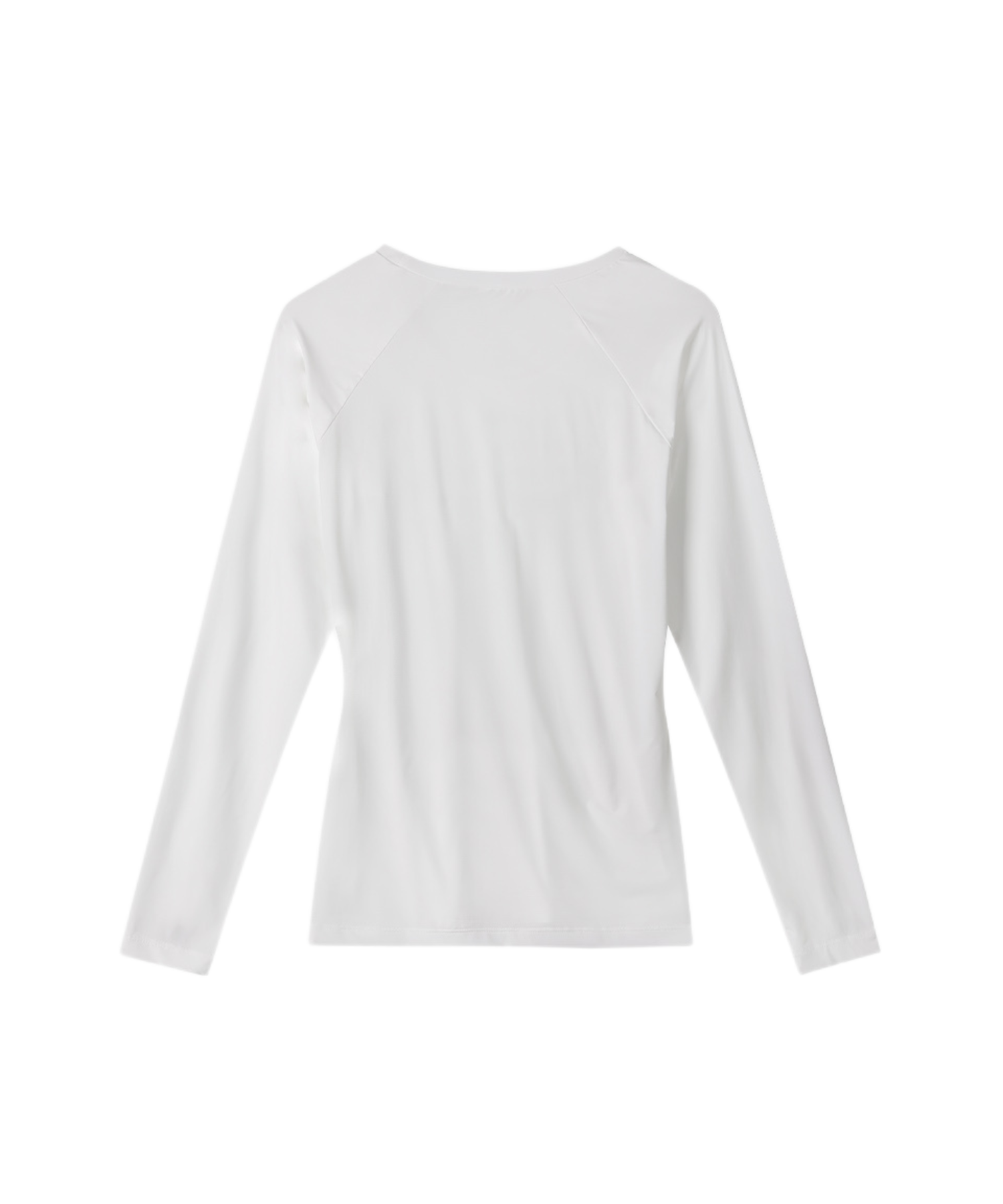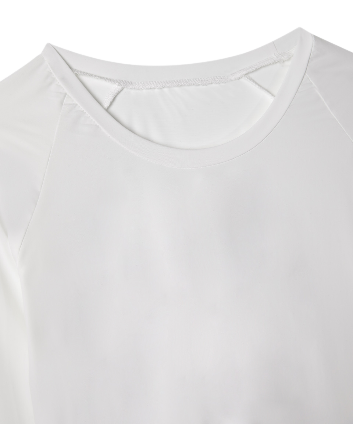 This white cooling base layer features breathable fabrics and a round neck for easy layering. Its ventilated back with featherwade and stripes enhances airflow, while the stretch fabric ensures freedom of movement. Perfect for midsummer, it protects skin and keeps you dry with moisture-wicking, quick-dry technology.