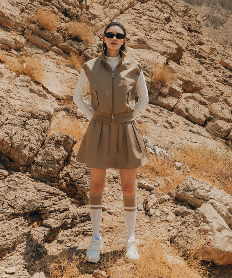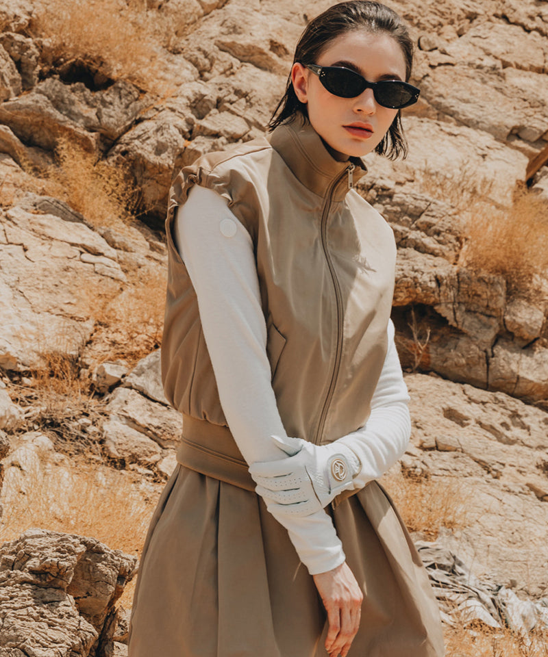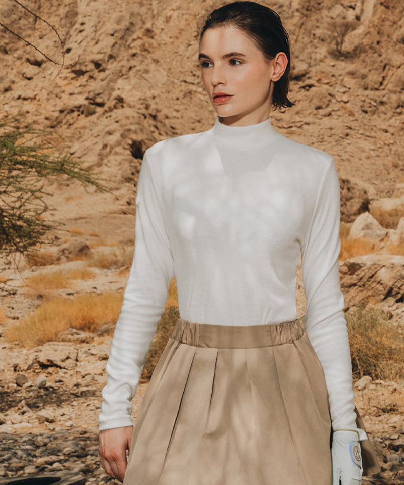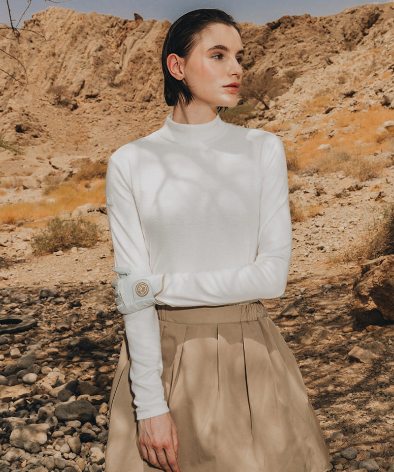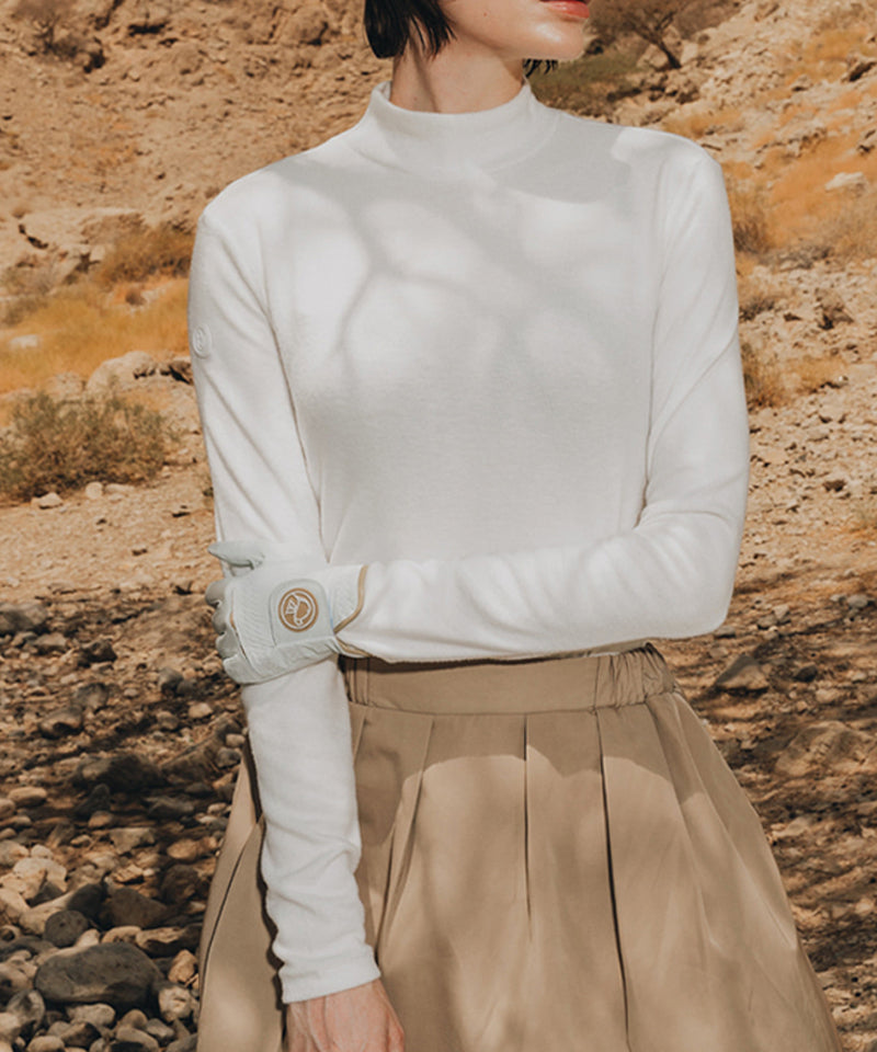 This half-neck T-shirt features a soft and warm fleece lining, perfect for the fall and winter seasons. Its slightly loose neck and body fit minimize discomfort, ensuring a relaxed wear. The Over Golf patch on the sleeves expresses brand identity, while the high-elasticity fabric enhances flexibility. Versatile enough to be worn alone or layered under knits and outerwear, it provides comfortable warmth for any occasion.